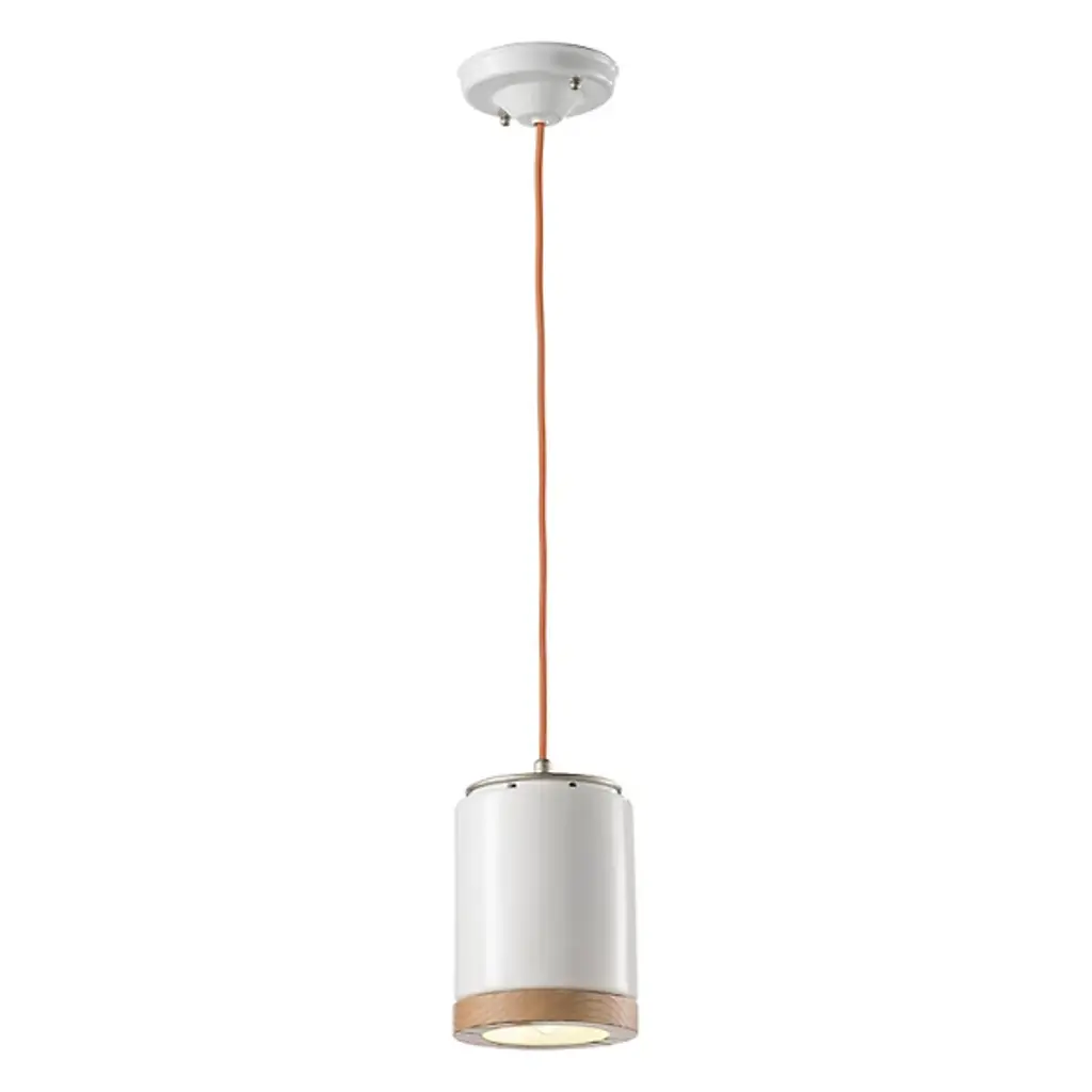 Modern intricacy with a touch of rustic vibrancy. The Mateca Cylinder Pendant from Ferroluce makes an entrance, descending from a circular canopy along a slim, colored cord. Strong lamping rests inside a small cylinder shade made from a natural material, adding a clean, modern visual while cutting glare to the sides. The neat shade dispenses focused downlight through a wooden ring at the shade’s base, adding a welcome touch of natural warmth to the fixture.