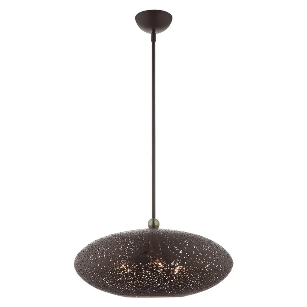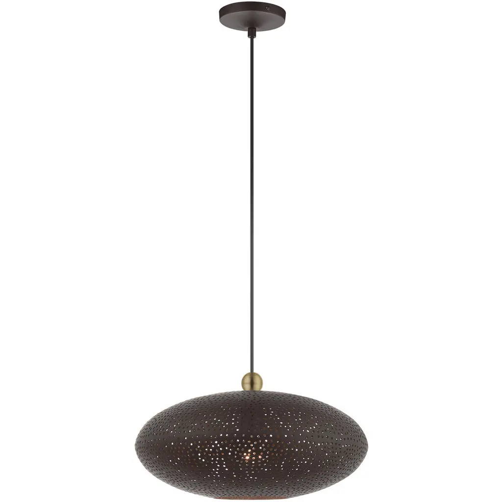Mathieu Matégot 'Satellite' Outdoor Metal Pendant for GUBI in MustardDesigned in 1953 by Matégot, this authorized re-edition by GUBI of Denmark meticulously reproduces his work with scrupulous attention to detail and materials faithful to the original specifications, now for outdoor installations. Executed in powder-coated sheet and perforated metal that Matégot called "Rigitulle," this refined geometric design adds a sculptural element and focal point to any space.Price is per item. Available in unlimited quantities. The rigitulle mesh shade is available in two colors: cream and mustard. Also available in two sizes in an indoor version. This listing is for the outdoor 'Satellite' lamp with mustard colored shade.Accommodates 1x 60 watt (6W-10W LED 810 lm) bulb with E26 socket incandescent bulb (tubular decorative bulb included). Textile cord. Ceiling canopy not included. This item is currently on GUBI's quick ship list and ships within 2 weeks. For time-sensitive orders please inquire for most accurate lead times. Availability subject to change at any time.Please see the dimensions image for the shade and "top hat" dimensions.Made to order. All sales final.