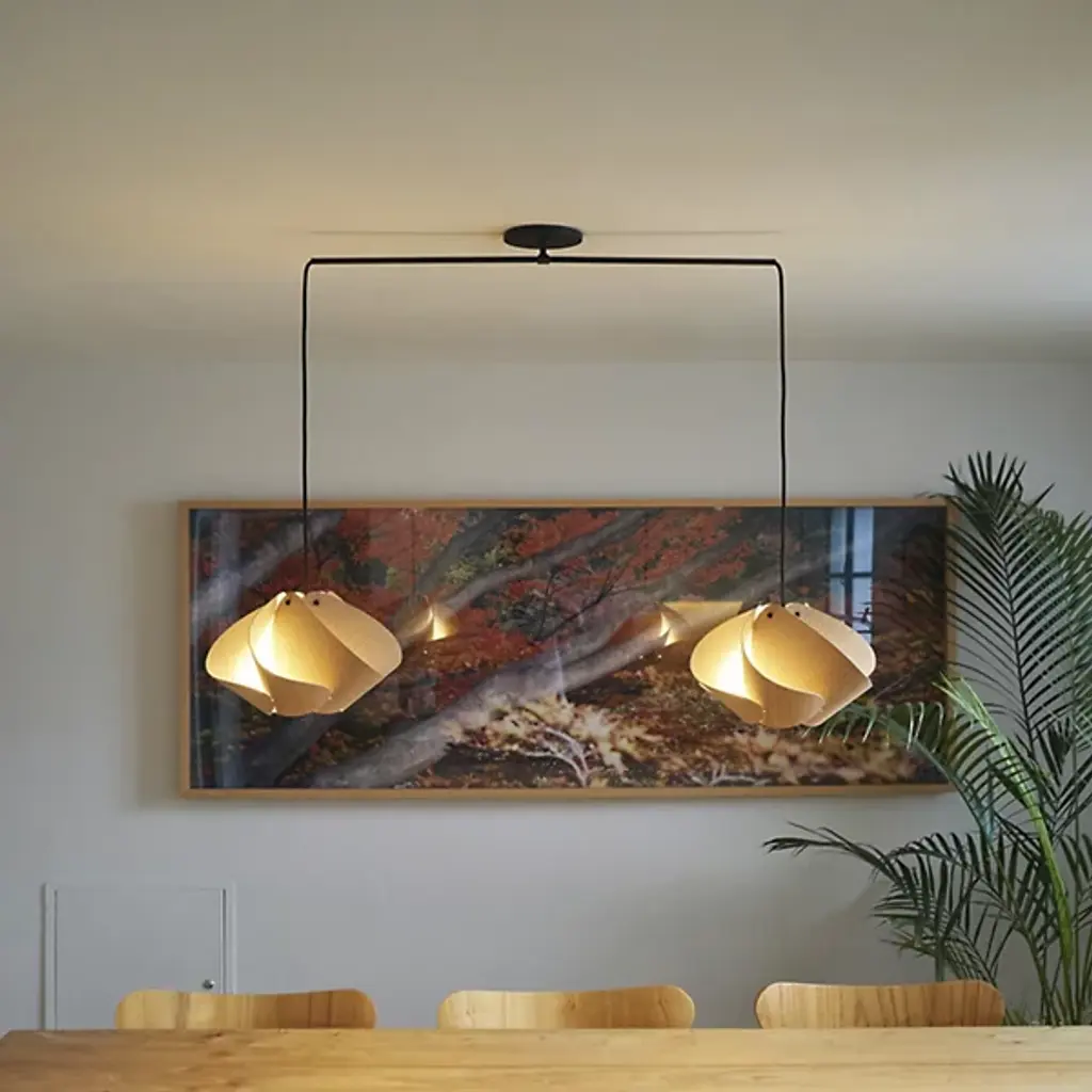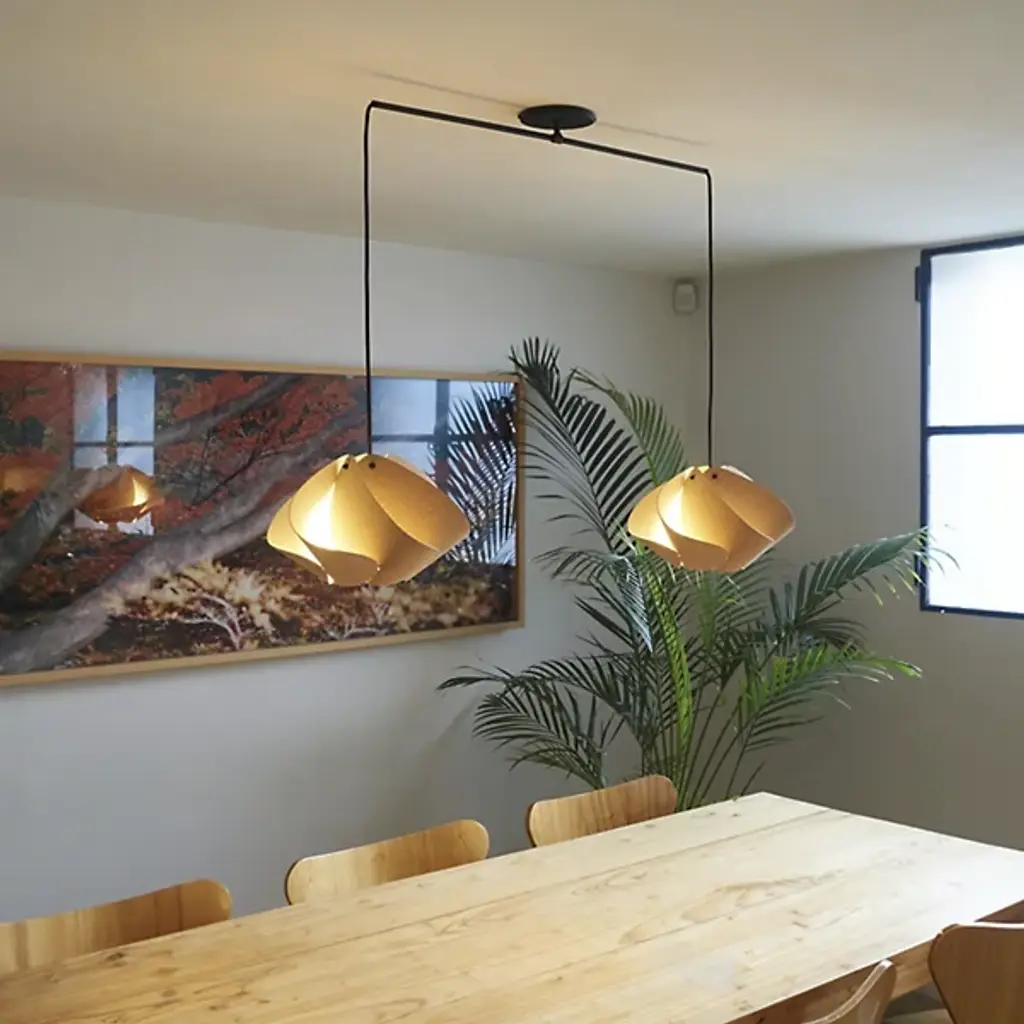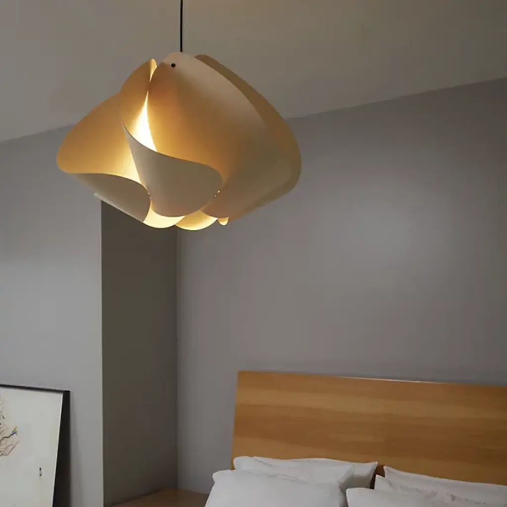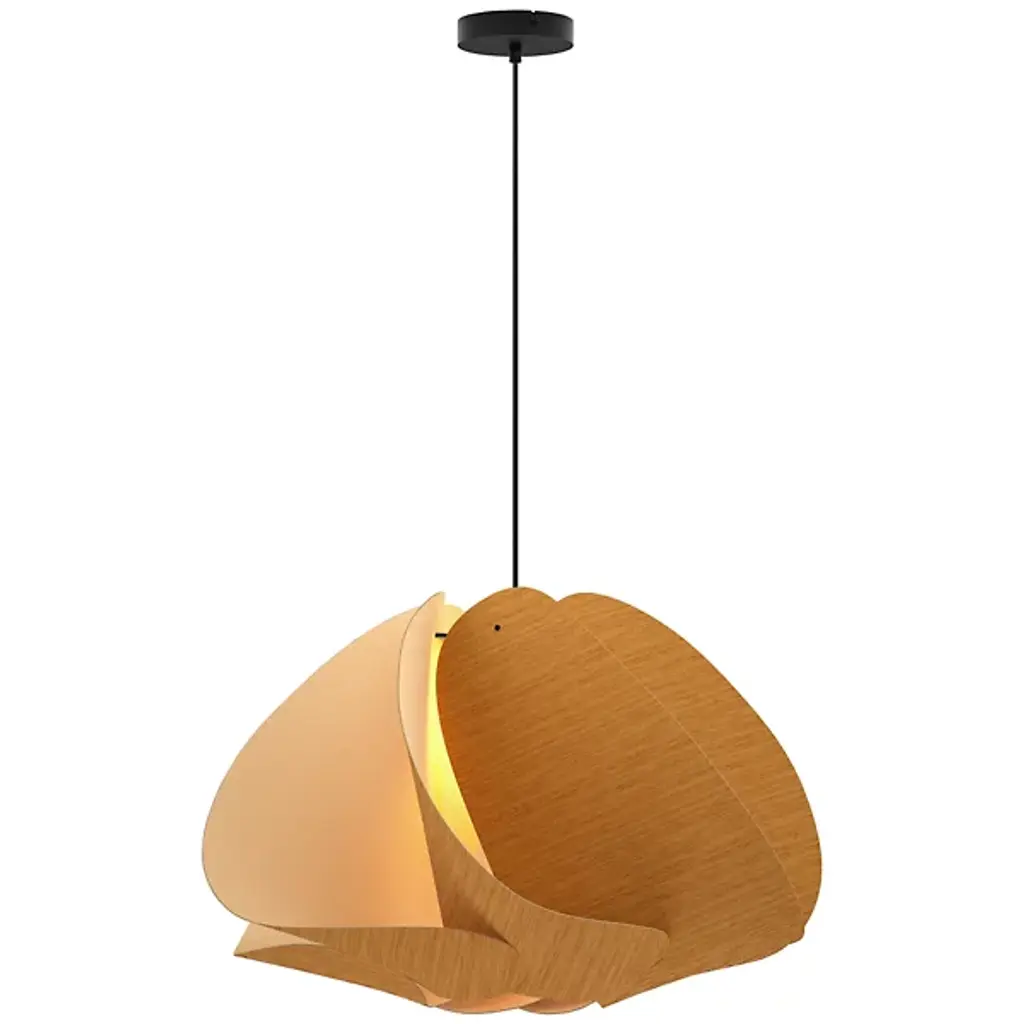 A natural, floral-inspired lighting design for modern spaces, the Matilda Pendant by Bruck Lighting is part of the WEP Light (Wood Ecological Project) Collection. It features multiple panels of recycled wood veneer, curved around the central light source. The shade has a soft, organic look from the side, and from underneath, it resembles a flower. This pendant light is perfect for adding a natural element and warm ambiance to a dining room or kitchen.