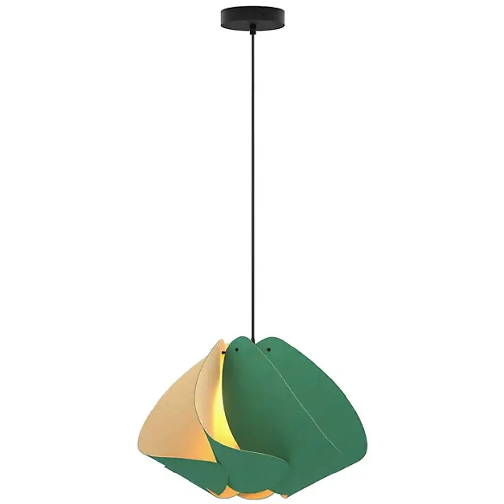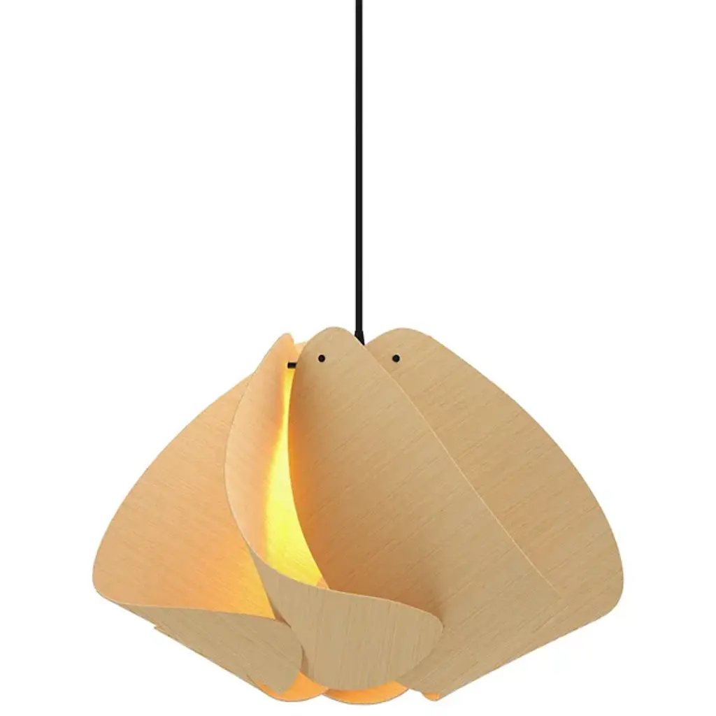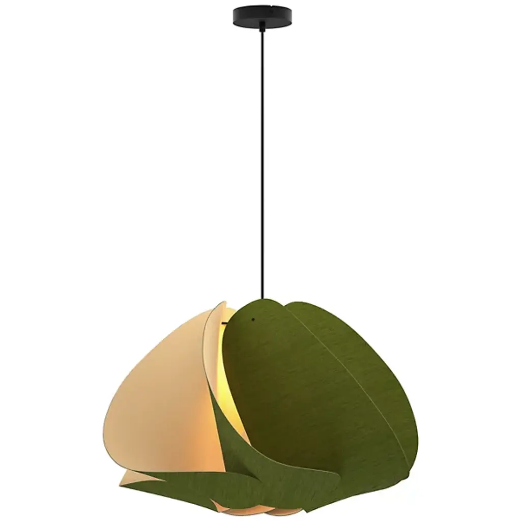 A natural, floral-inspired lighting design for modern spaces, the Matilda Pendant by Bruck Lighting is part of the WEP Light (Wood Ecological Project) Collection. It features multiple panels of recycled wood veneer, curved around the central light source. The shade has a soft, organic look from the side, and from underneath, it resembles a flower. This pendant light is perfect for adding a natural element and warm ambiance to a dining room or kitchen.