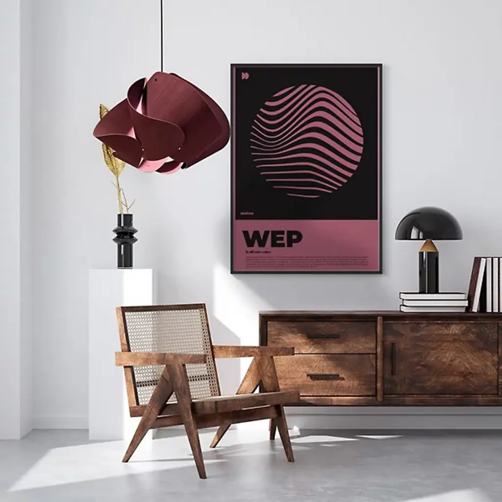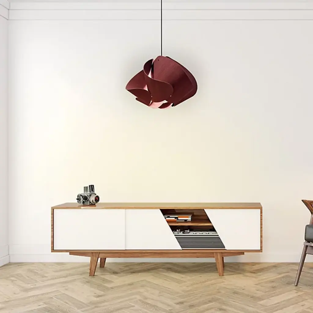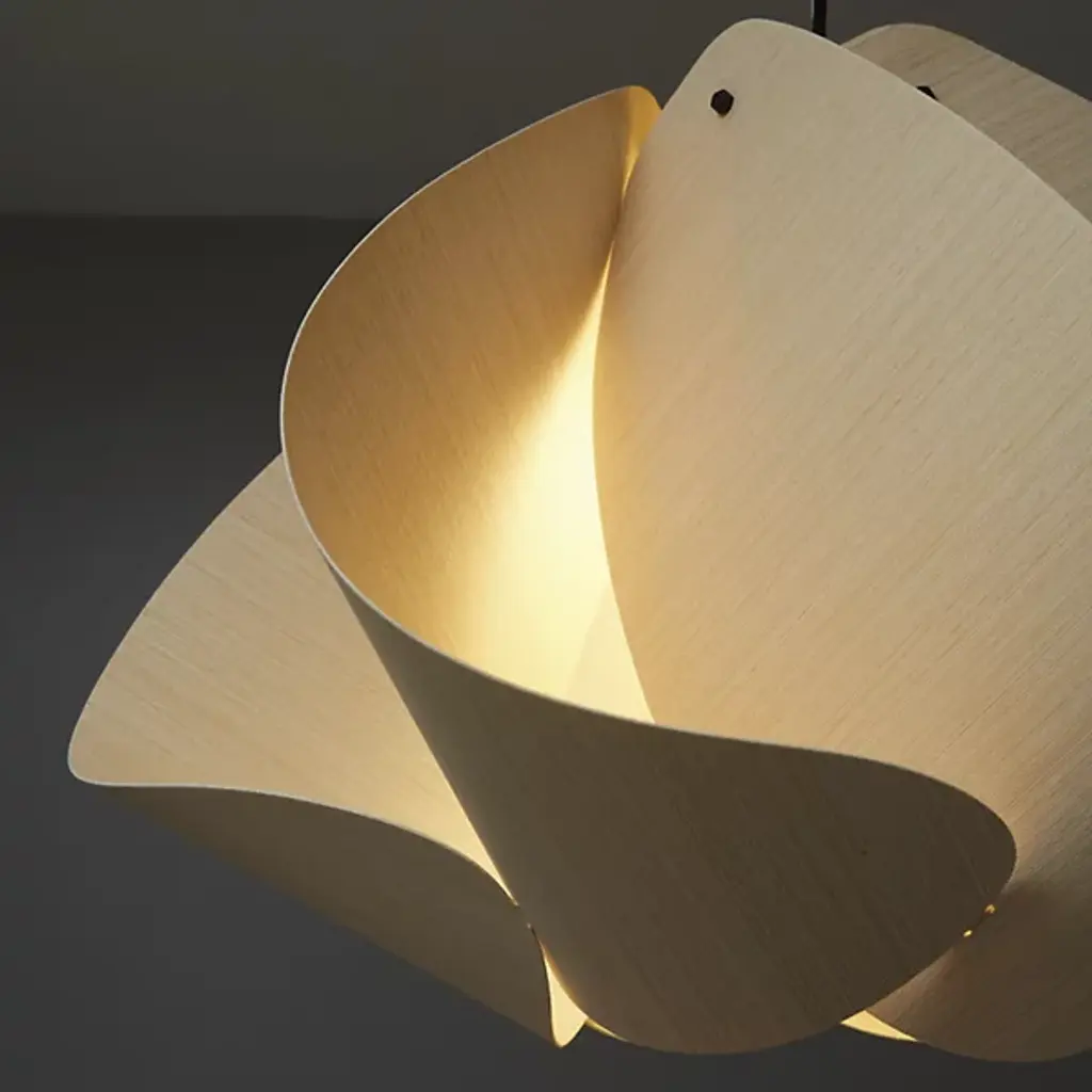 A natural, floral-inspired lighting design for modern spaces, the Matilda Pendant by Bruck Lighting is part of the WEP Light (Wood Ecological Project) Collection. It features multiple panels of recycled wood veneer, curved around the central light source. The shade has a soft, organic look from the side, and from underneath, it resembles a flower. This pendant light is perfect for adding a natural element and warm ambiance to a dining room or kitchen.