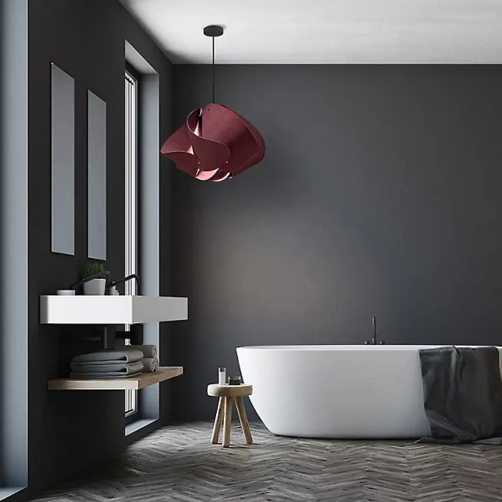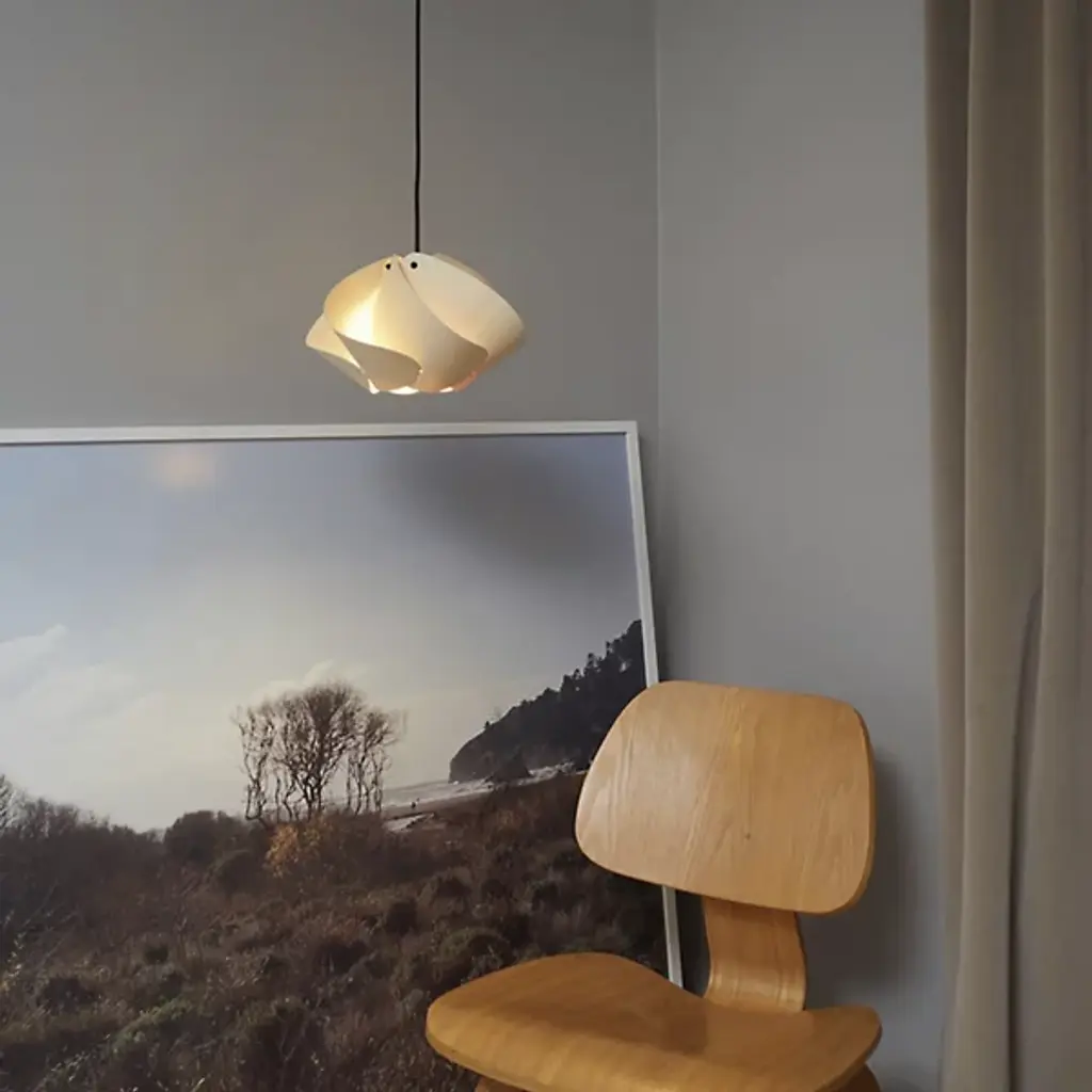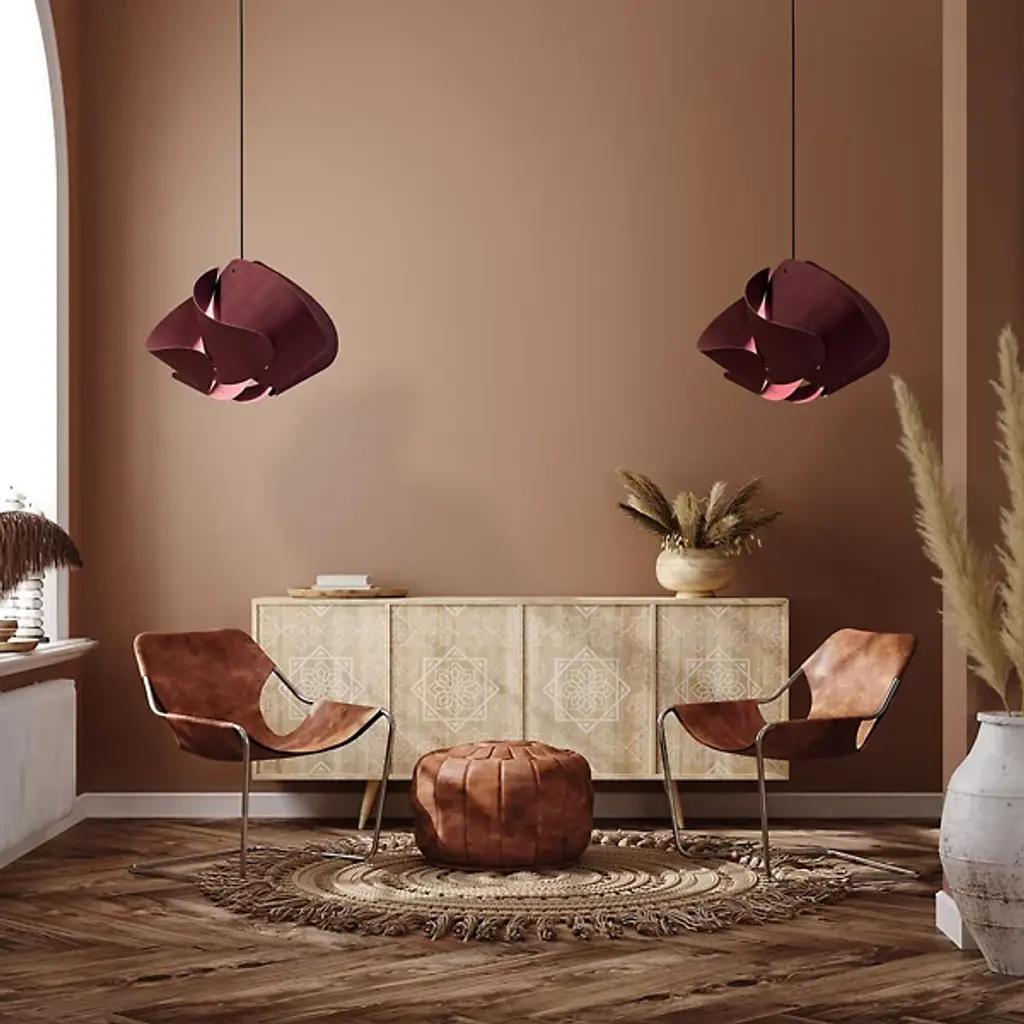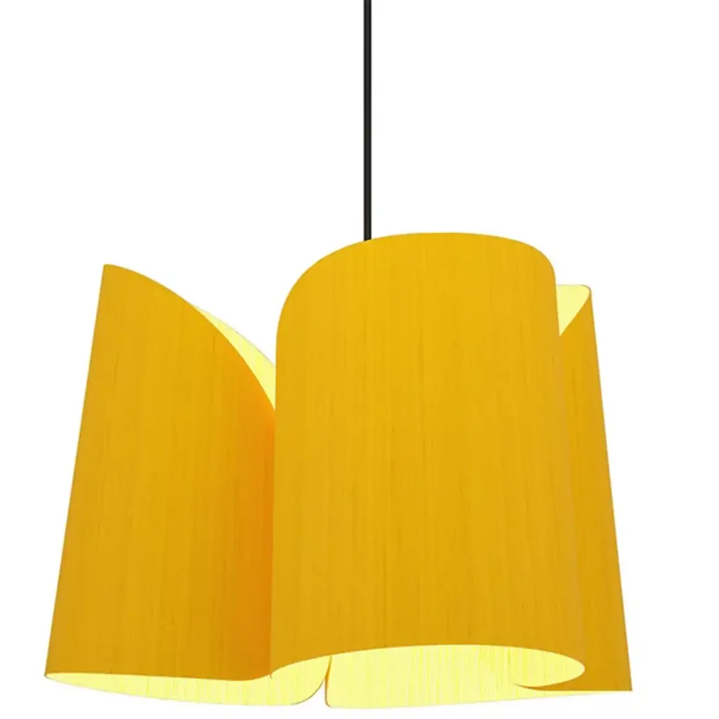 A natural, floral-inspired lighting design for modern spaces, the Matilda Pendant by Bruck Lighting is part of the WEP Light (Wood Ecological Project) Collection. It features multiple panels of recycled wood veneer, curved around the central light source. The shade has a soft, organic look from the side, and from underneath, it resembles a flower. This pendant light is perfect for adding a natural element and warm ambiance to a dining room or kitchen.