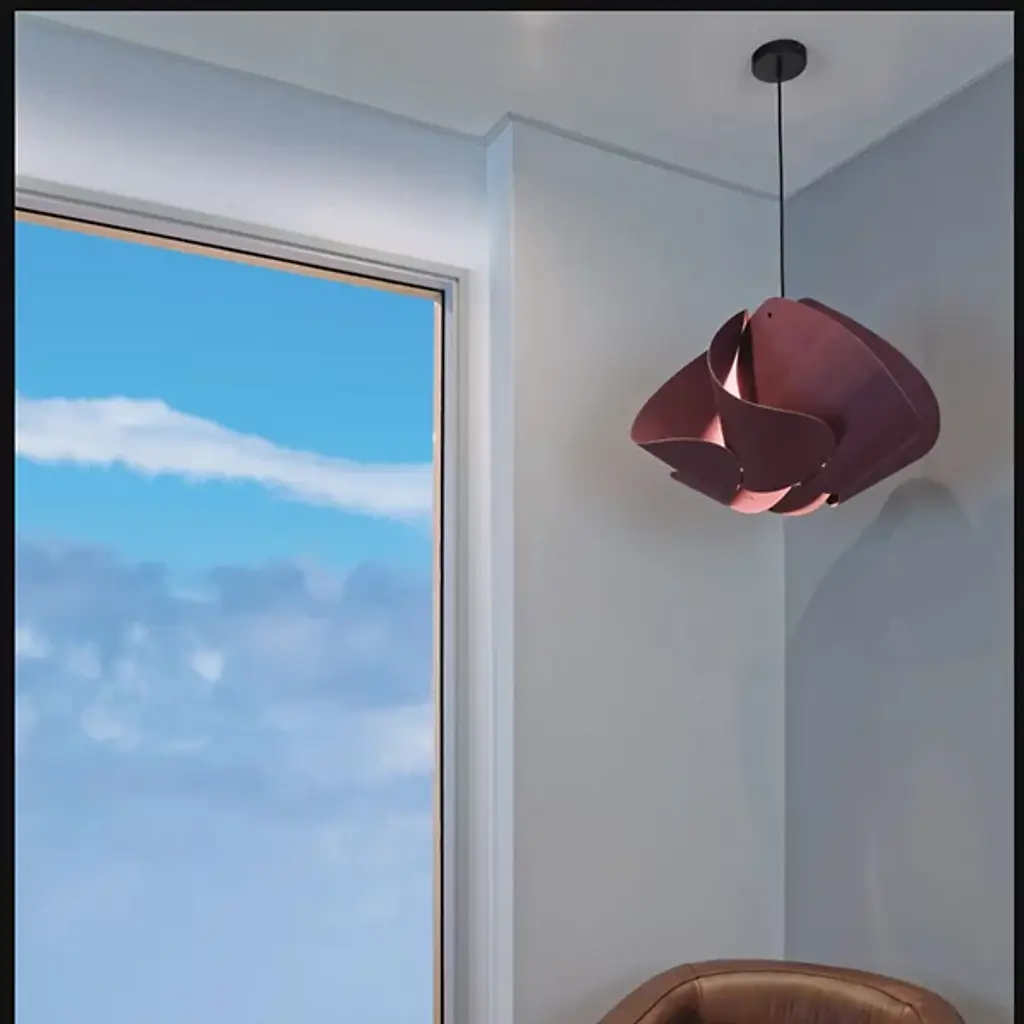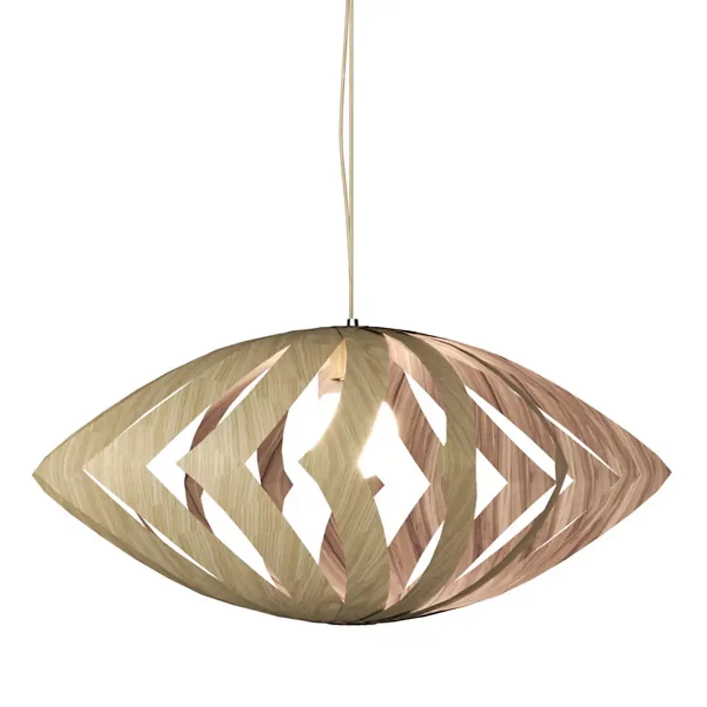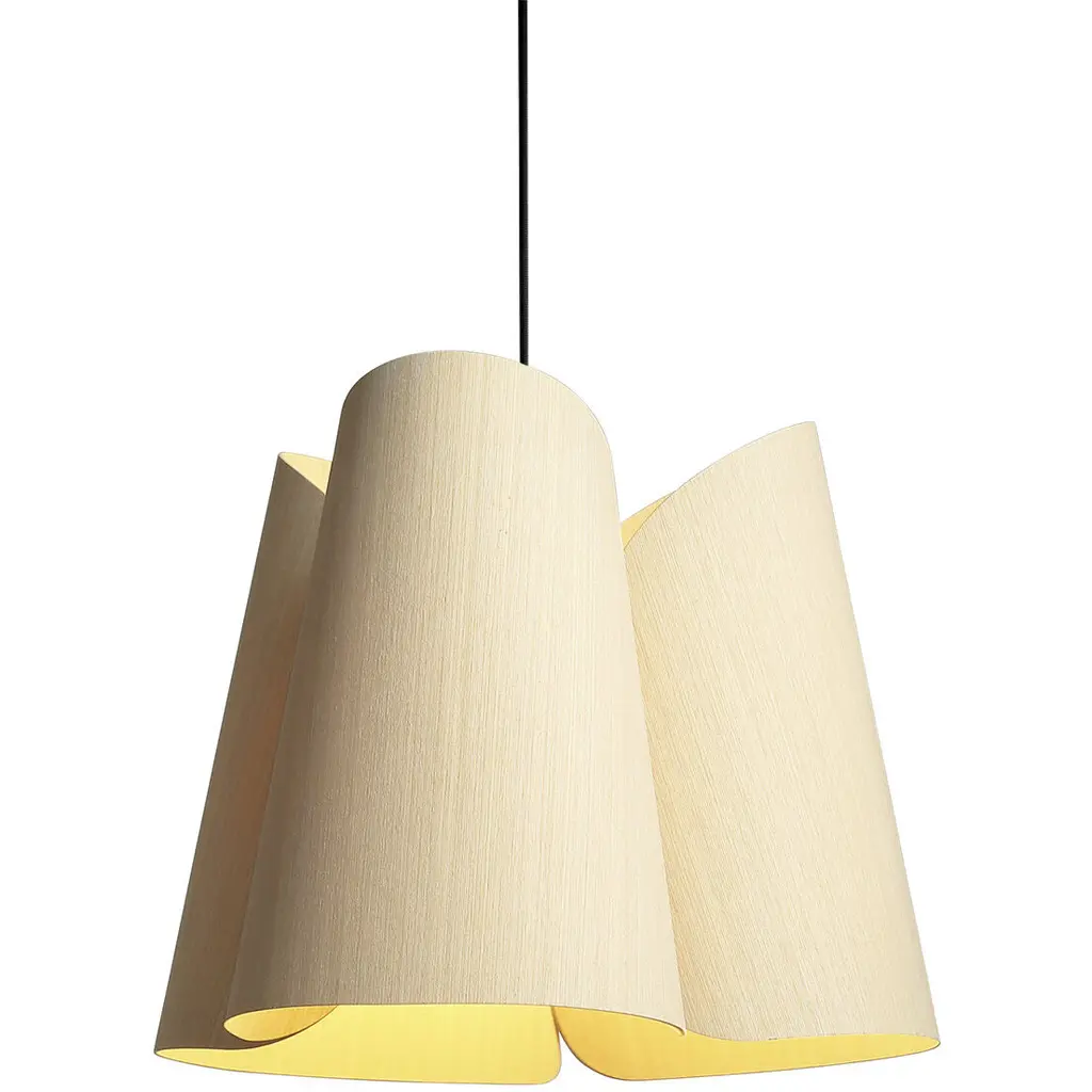 A natural, floral-inspired lighting design for modern spaces, the Matilda Pendant by Bruck Lighting is part of the WEP Light (Wood Ecological Project) Collection. It features multiple panels of recycled wood veneer, curved around the central light source. The shade has a soft, organic look from the side, and from underneath, it resembles a flower. This pendant light is perfect for adding a natural element and warm ambiance to a dining room or kitchen.