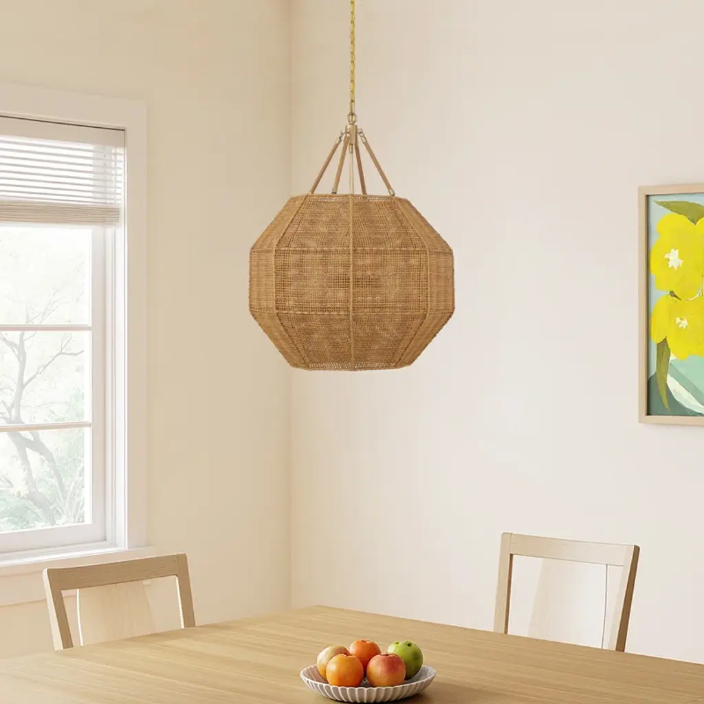 The Savoy House Beacon 5-light pendant is a great way to bring the relaxed, organic look of rattan to any room. Its large, octagon-shaped shade showcases rattan woven in an intricate pattern that catches the eye and is terrifically touchable. A Burnished Brass finish adds a hint of glamour. Beacon is 32.5" in height and 25" in width. Uses five standard size bulbs of up to 60 watts per bulb. Bulbs not included.
