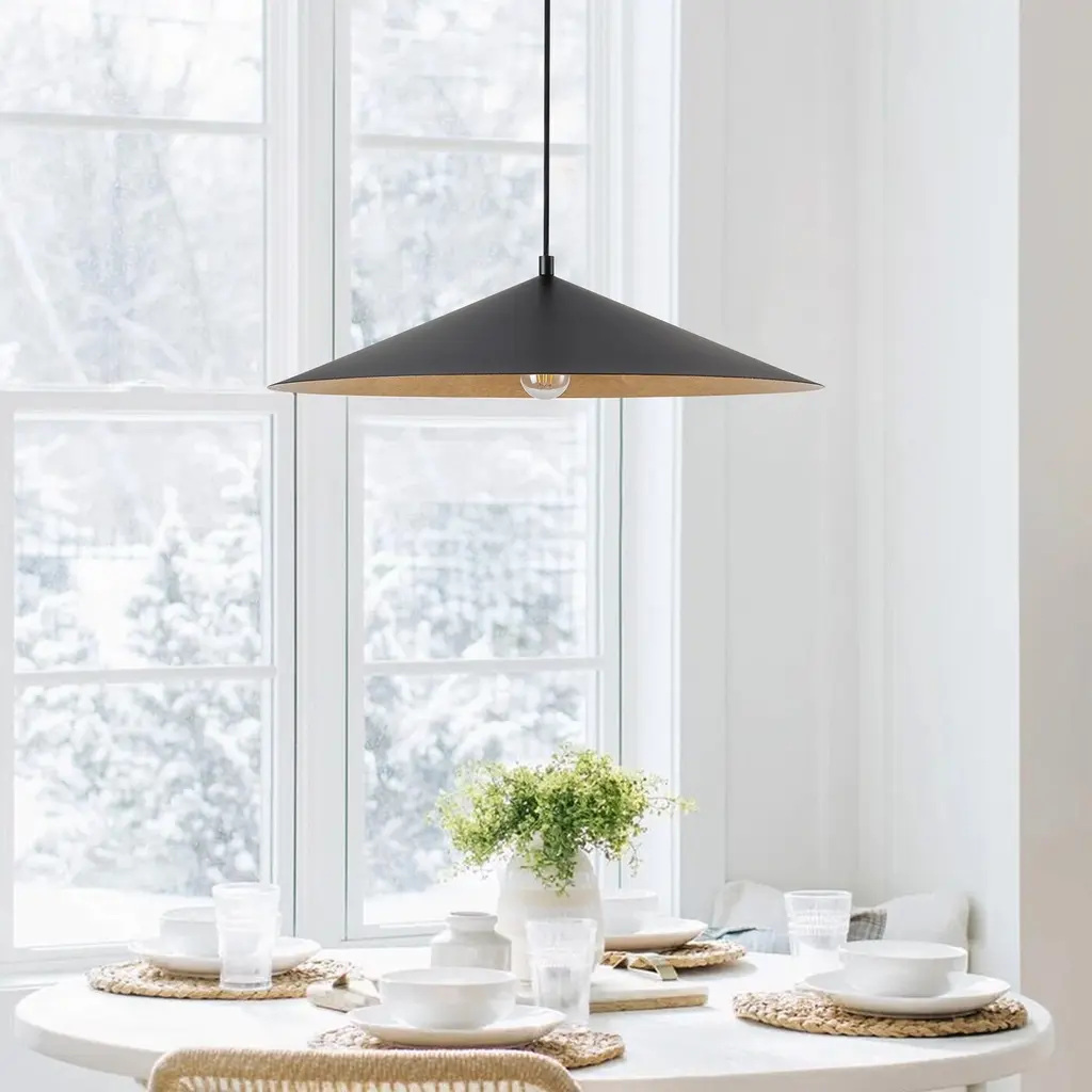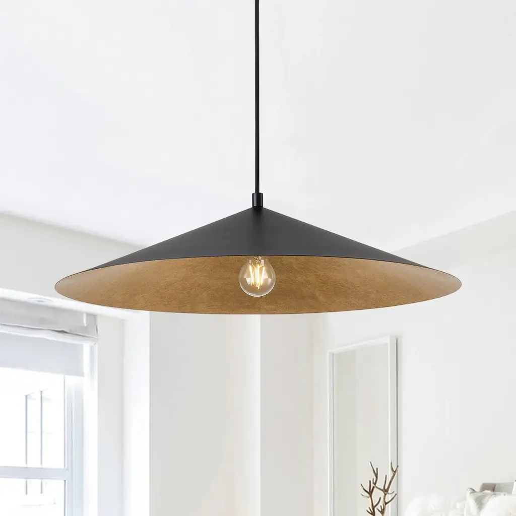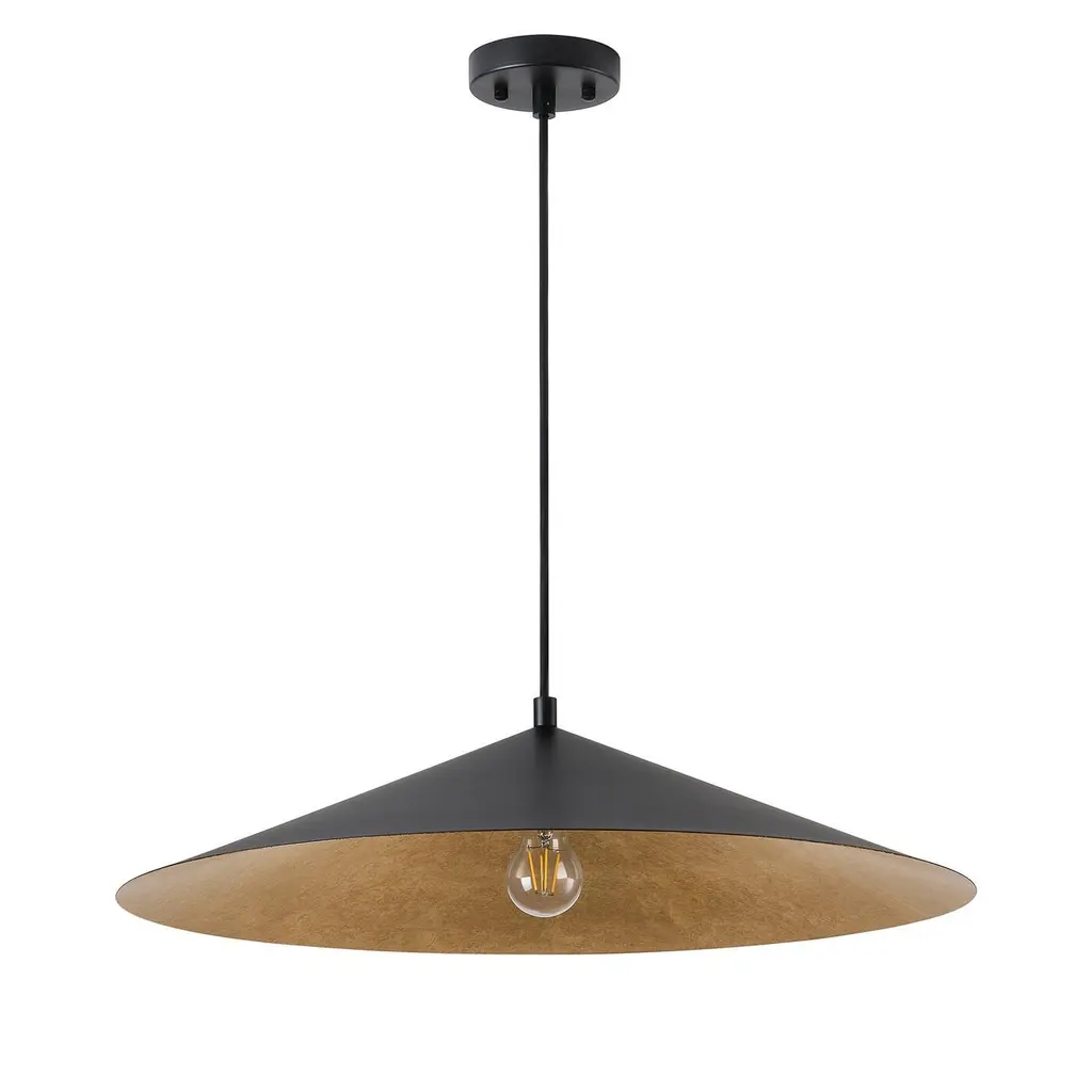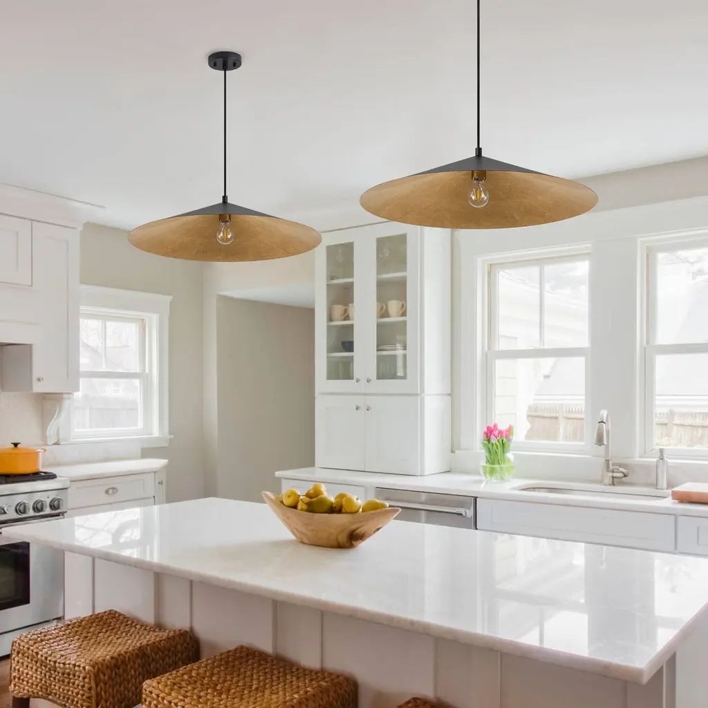 Opulent Gold Leaf Interior: The interior of the shade is elegantly adorned with a gold leaf finish, creating a stunning visual effect when illuminated. The gold accents reflect and enhance the light, producing a warm, inviting glow that adds an element of luxury to any room.Quality Assurance: High-quality iron materials were used to craft the pendant light. All products in the factory have to undergo rigorous safety monitoring, to ensure quality and safety, which is beautiful, corrosion-resistant, and durable for a long time.Easy to Install: This pendant light is designed with ease of installation in mind. With all the necessary hardware included, it can be mounted quickly and effortlessly, making it a hassle-free upgrade for any space in your home.ETL Listed & Bulb Requirement: ETL Listed for your safety. The pendant light is a built-in standard E26 socket, suggest using the dimmable E26*1 base bulbs (Max 60W, 120V), it could be a fully dimmable and compatible dimmer switch. Bulbs and dimmer switch not included.Perfect Decor: Perfect for a wide range of rooms, this pendant light is ideal for kitchens, dining areas, living rooms, or even hallways. Its adaptable design enhances any space, whether you're looking to light up a modern farmhouse kitchen or add an industrial touch to a living room.