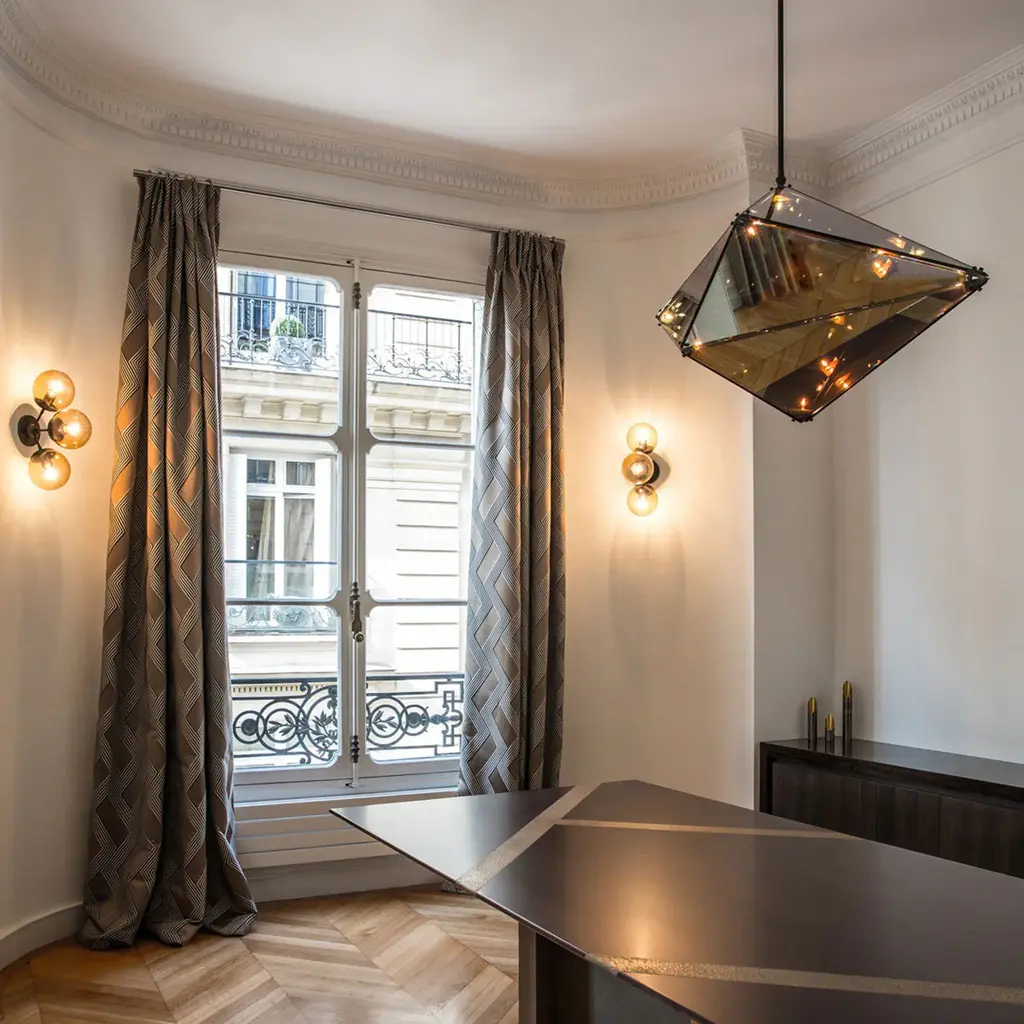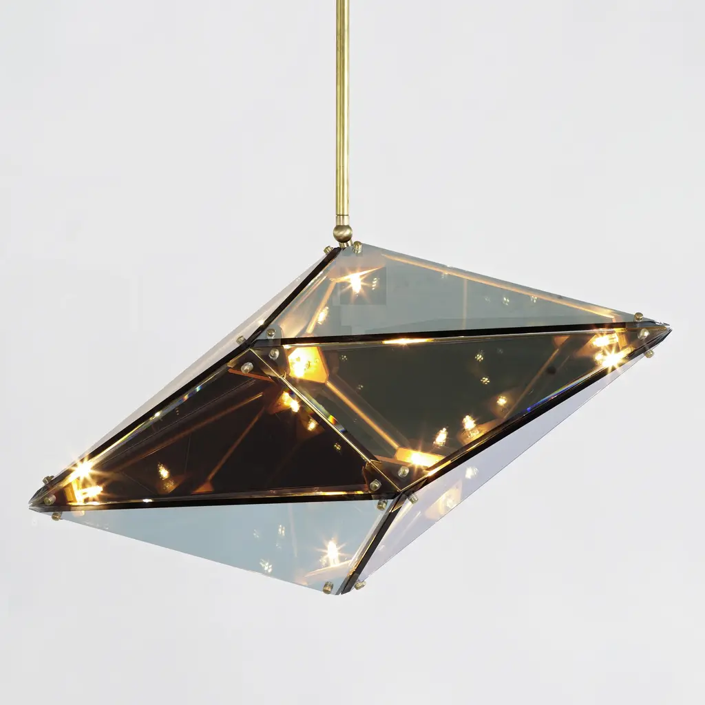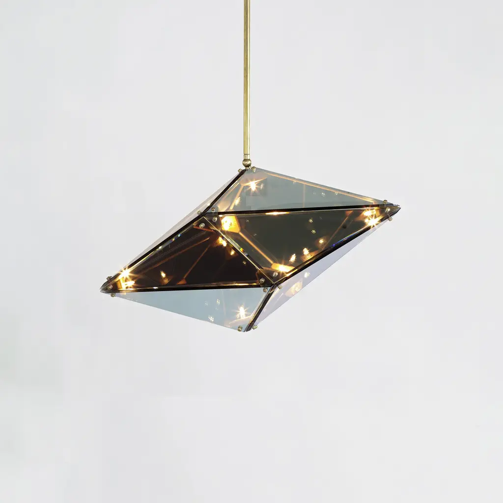 Unleash your own unique sense of style with the Maxhedron Horizontal LED Pendant Light from Roll & Hill. Designed by Bec Brittain, this avant-garde piece combines light and reflection to create a transformative effect that will elevate any space. Its transparent mirror glass, brass, and steel materials exude luxury while the LED lights provide ample illumination. Adaptable to sloped ceilings, the Maxhedron's sharp angles and geometric precision evoke a brilliant constellation, making it a must-have for a luxurious and exclusive ambiance. Highlights