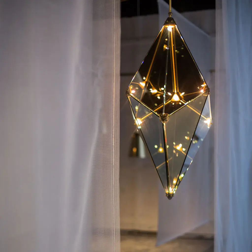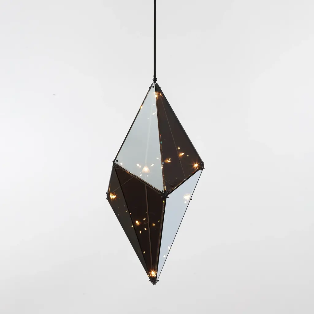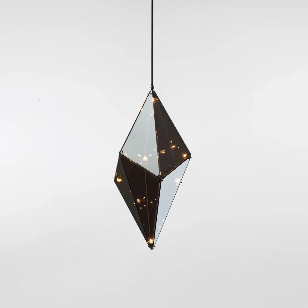 Experience a taste of the avant-garde with the Maxhedron Vertical LED Pendant Light from Roll & Hill. Designed by Bec Brittain, it boasts a transformative lighting effect that resembles a constellation. The transparent mirror glass and sleek angles add a touch of luxury to your space, while the brass and steel ensure durability. Illuminate your surroundings with this sophisticated and exclusive piece. Highlights