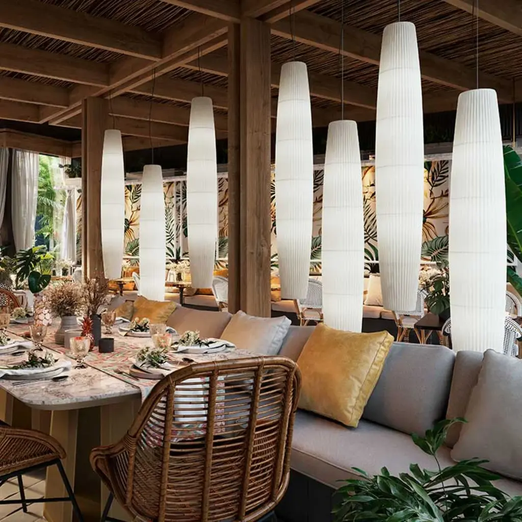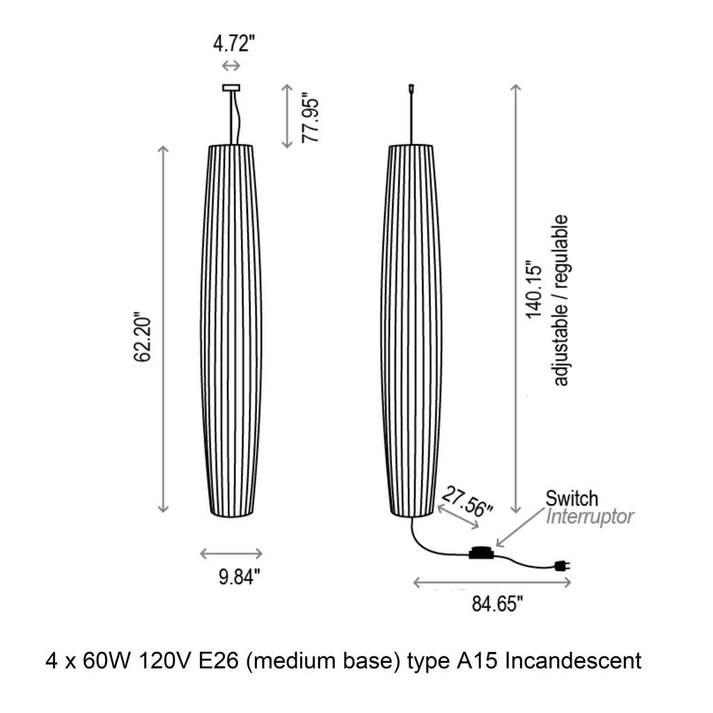 Pendant lamp with hand wrapped translucent polyester blend ribbon with an internal iron frame. Available with electrical installation from above or below. The Maxi can be ordered with white or cream translucent ribbon, with additional colors available for large orders. Features: