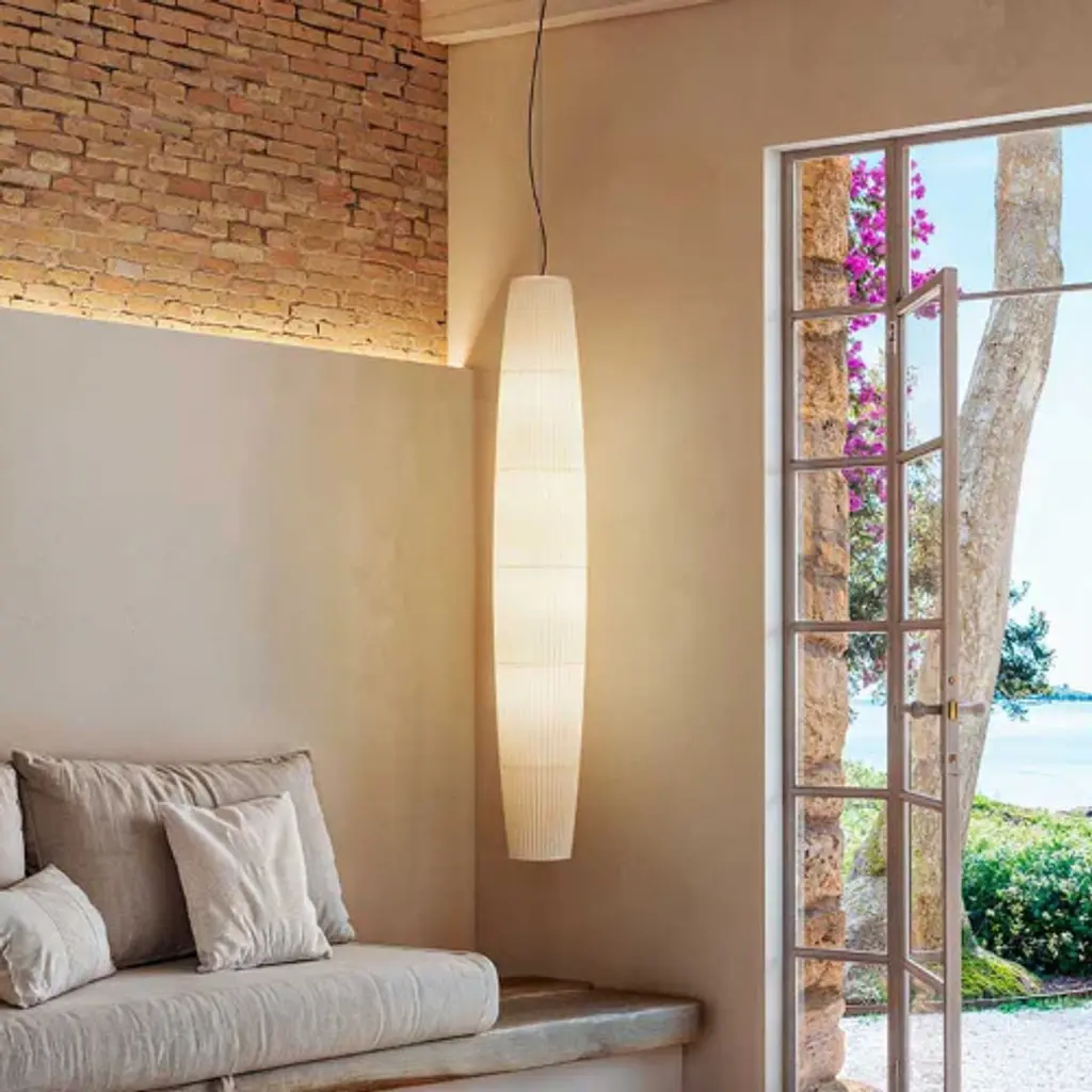 Pendant lamp with hand wrapped translucent polyester blend ribbon with an internal iron frame. Available with electrical installation from above or below. The Maxi can be ordered with white or cream translucent ribbon, with additional colors available for large orders. Features: