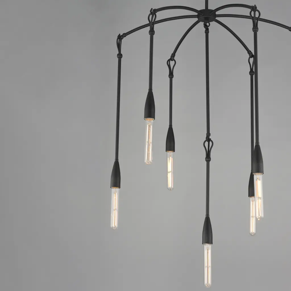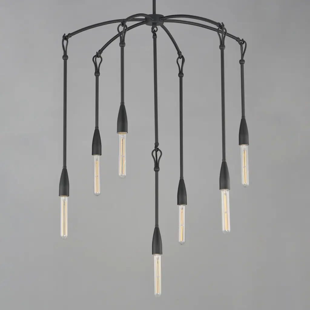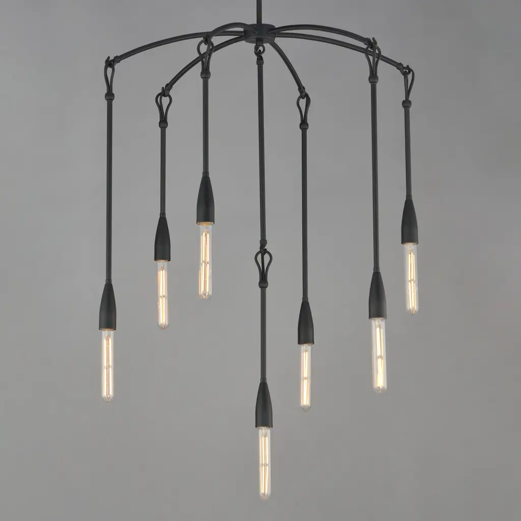 Simple with rustic elements, elongated rods are tiered with a forged iron hook and loop detail in multiple configurations. The fixtures' textured finish enhances the artistry of the forged iron construction.Features:Dimensions:Electrical Specifications: