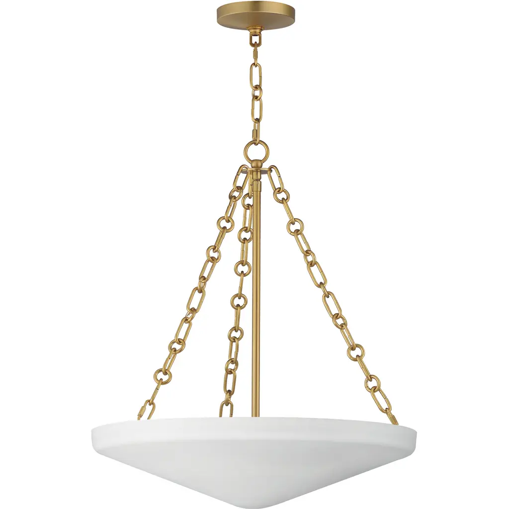 An inverted steel cone vessel painted in textured Plaster White gesso provides ambient lighting with classical styling. The stylized ring and oval chain links in Natural Aged Brass complement the design. Available in two sizes of pendants. Material: Steel, Finish Color: Natural Aged Brass, Width: 19.75", Height: 22.5", Length: 19.75", Chain Length: 36", Lamping Type: Incandescent, Number Of Bulbs: 4, Wattage: 60 Watts, Dimmable: Yes, Moisture Rating: Dry Rated