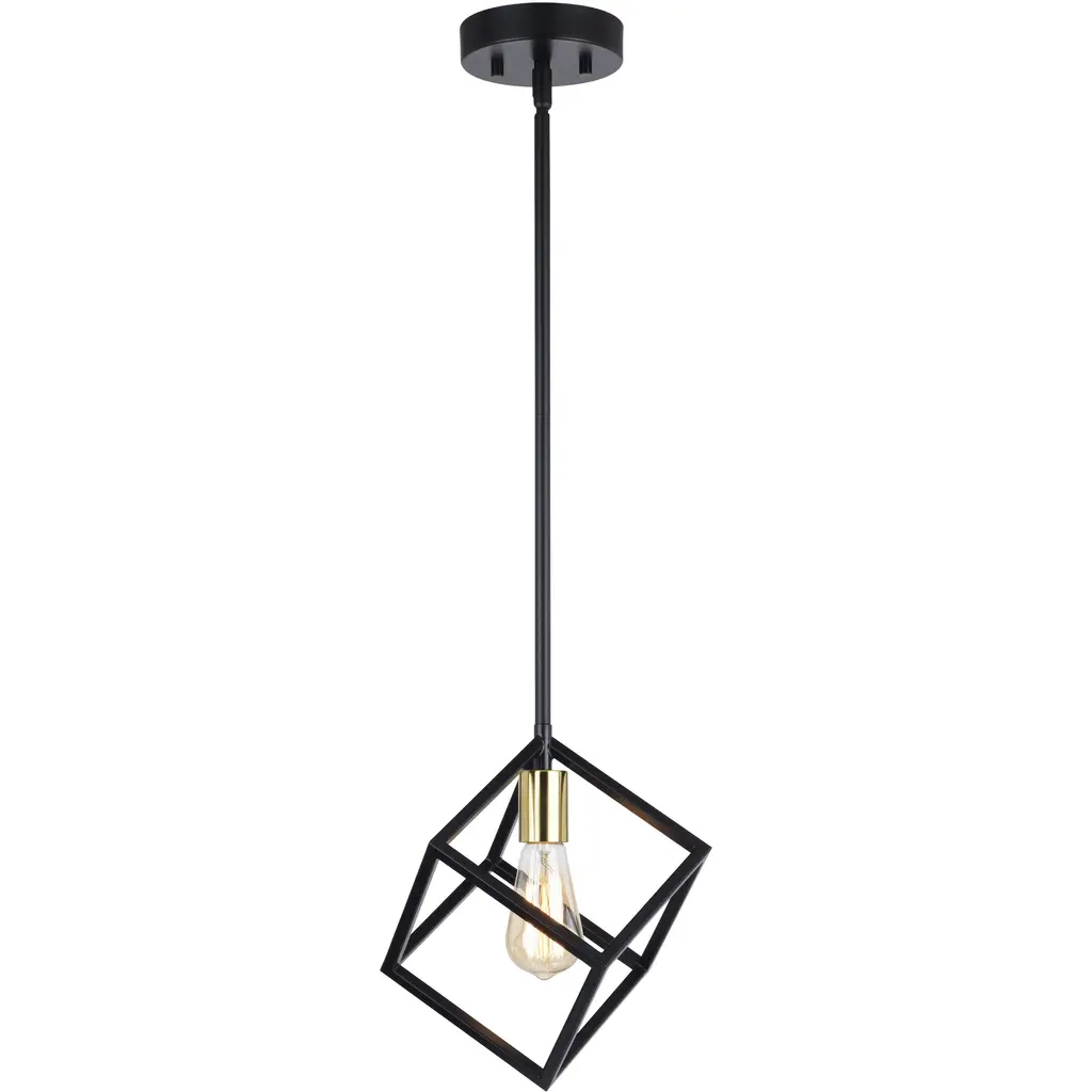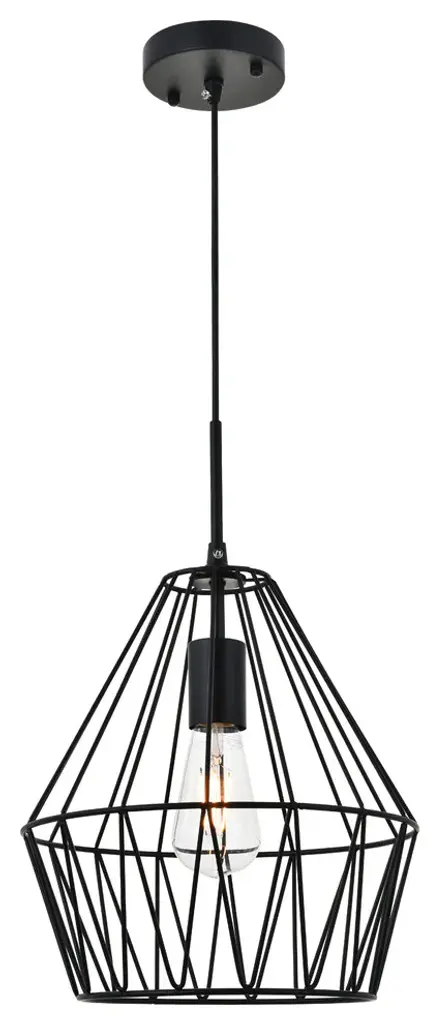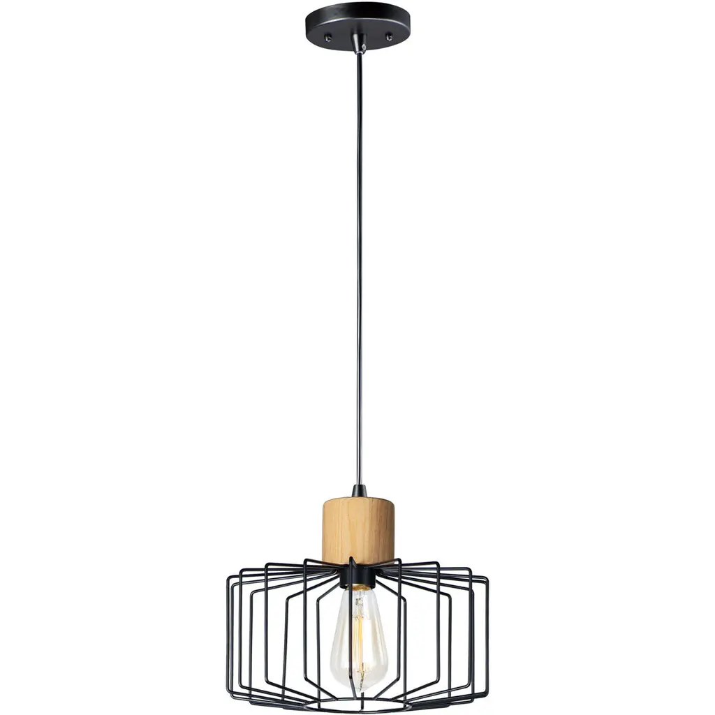 Metal wire-way cages are suspended by natural wood caps. Simple and modern these pendants add style to a variety of interior design applications. Canopy Included: Yes Canopy Diameter: 4.75 Sloped Ceiling Adaptable: Yes Dimmable: Yes Material: Steel, Finish Color: Black/Natural Wood, Width: 11.5", Height: 10", Length: 11.5", Hanging Method: Rod and Chain, Lamping Type: Incandescent, Number Of Bulbs: 1, Wattage: 60 Watts, Dimmable: Yes, Moisture Rating: Dry Rated