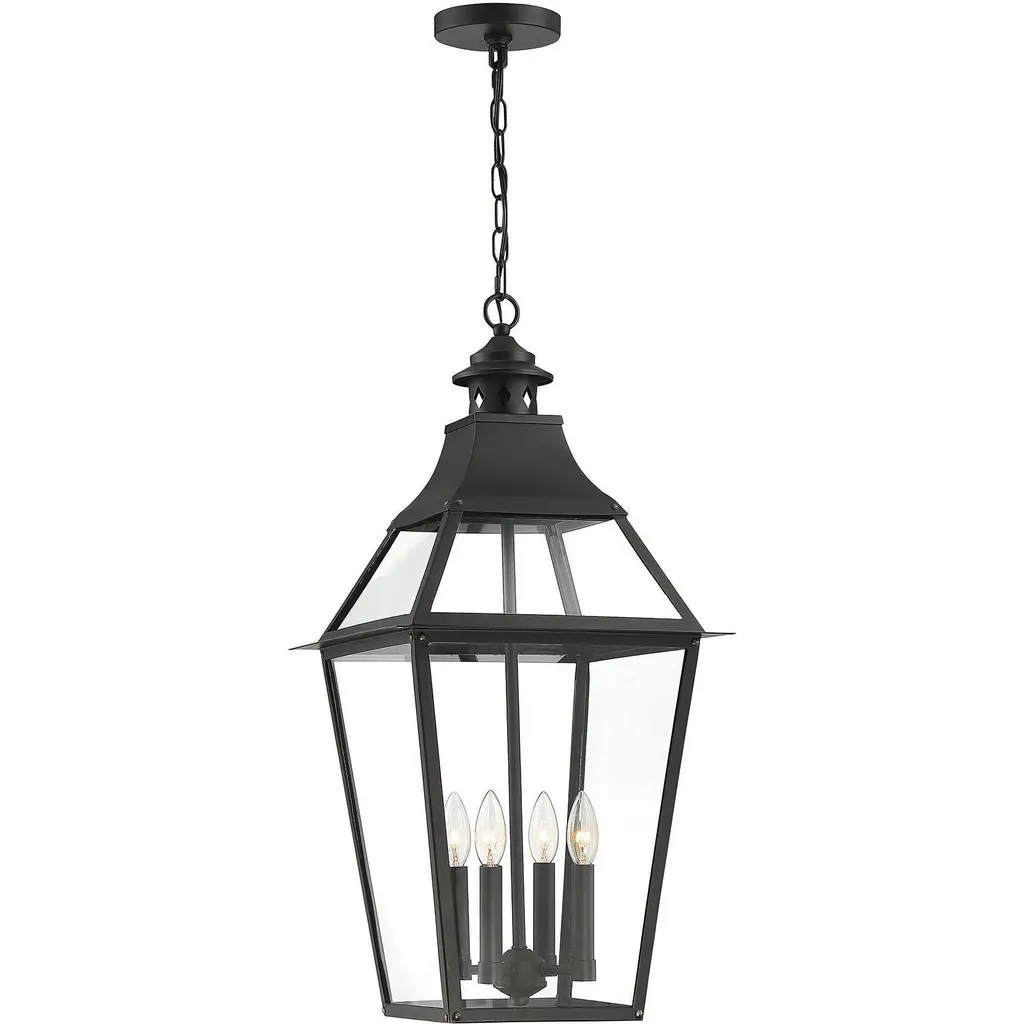 Stately lanterns with perforated filigree along the hood casts a beautiful lighting effect. Finished in Matte Black, the collection is available in multiple sizes as well as flush mount, deck lantern, and two sizes of pendants. Material: Steel, Finish Color: Black, Width: 17", Height: 34", Length: 19.5", Chain Length: 144", Lamping Type: Incandescent, Number Of Bulbs: 6, Wattage: 40 Watts, Dimmable: Yes, Moisture Rating: Damp Rated