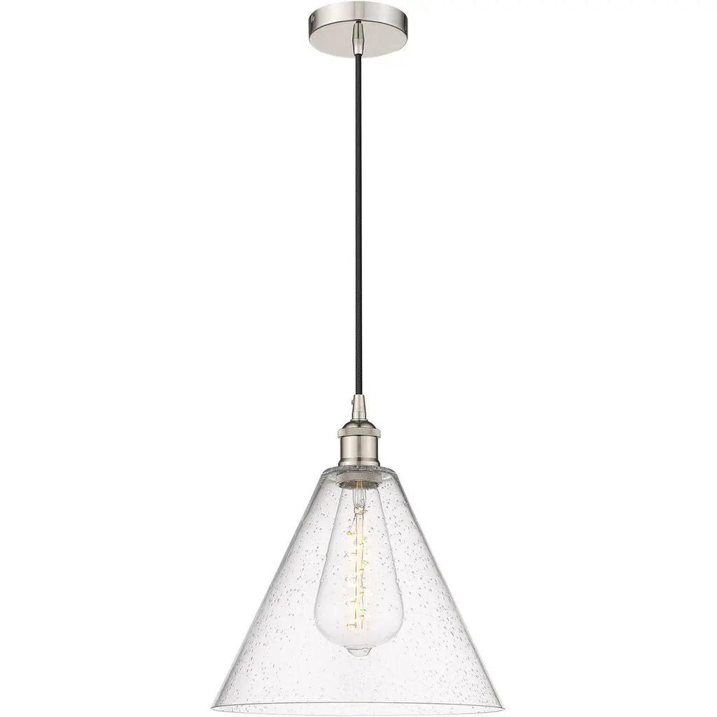 This nautical-inspired collection features Clear Seedy glass cones suspended by a yoke frame. The clear glass offers abundant lighting and compliments the styling of the fixture. Make it a more industrial look by adding filament E26 light bulbs. Canopy Included: Yes Canopy Diameter: 5.00 Sloped Ceiling Adaptable: Yes Cord Length: 12 Dimmable: Yes Shade Included: Yes Shade Dimensions: 10.50