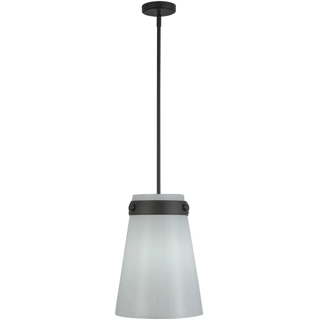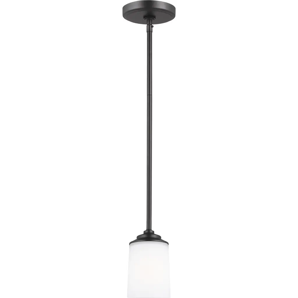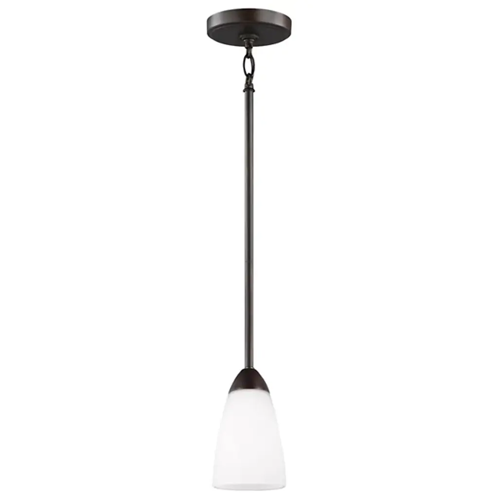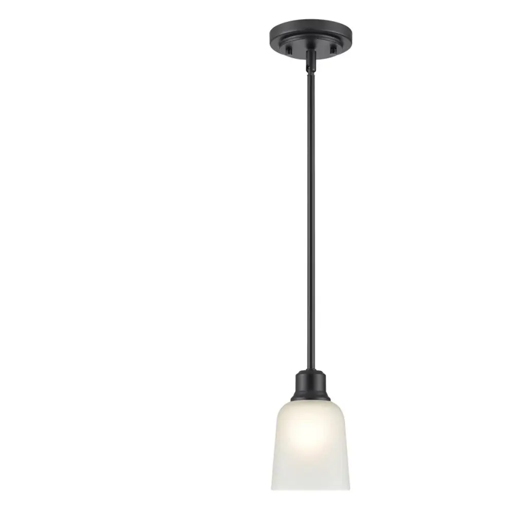 Heavy rectangular tubing support tall scale Satin White glass shades that creates an upscale forged look at a price. Available in your choice of Textured Black or Satin Nickel, this collection is complete enough to do the entire home. Canopy Included: Yes Canopy Diameter: 4.50 Dimmable: Yes Shade Included: Yes Material: Steel, Finish Color: Textured Black, Width: 5", Height: 9", Length: 5", Hanging Method: Rod and Chain, Lamping Type: Incandescent, Number Of Bulbs: 1, Wattage: 60 Watts, Dimmable: Yes, Moisture Rating: Dry Rated