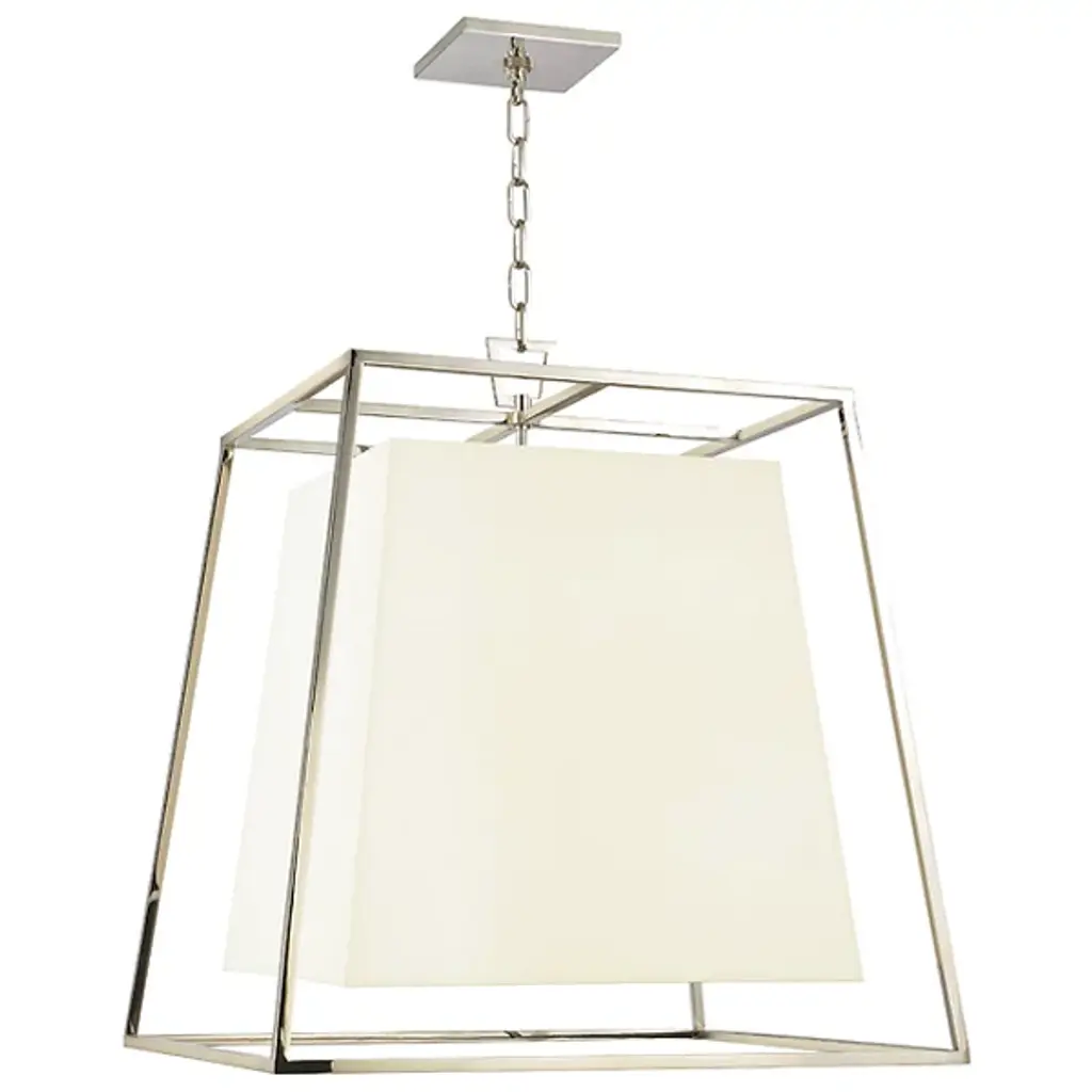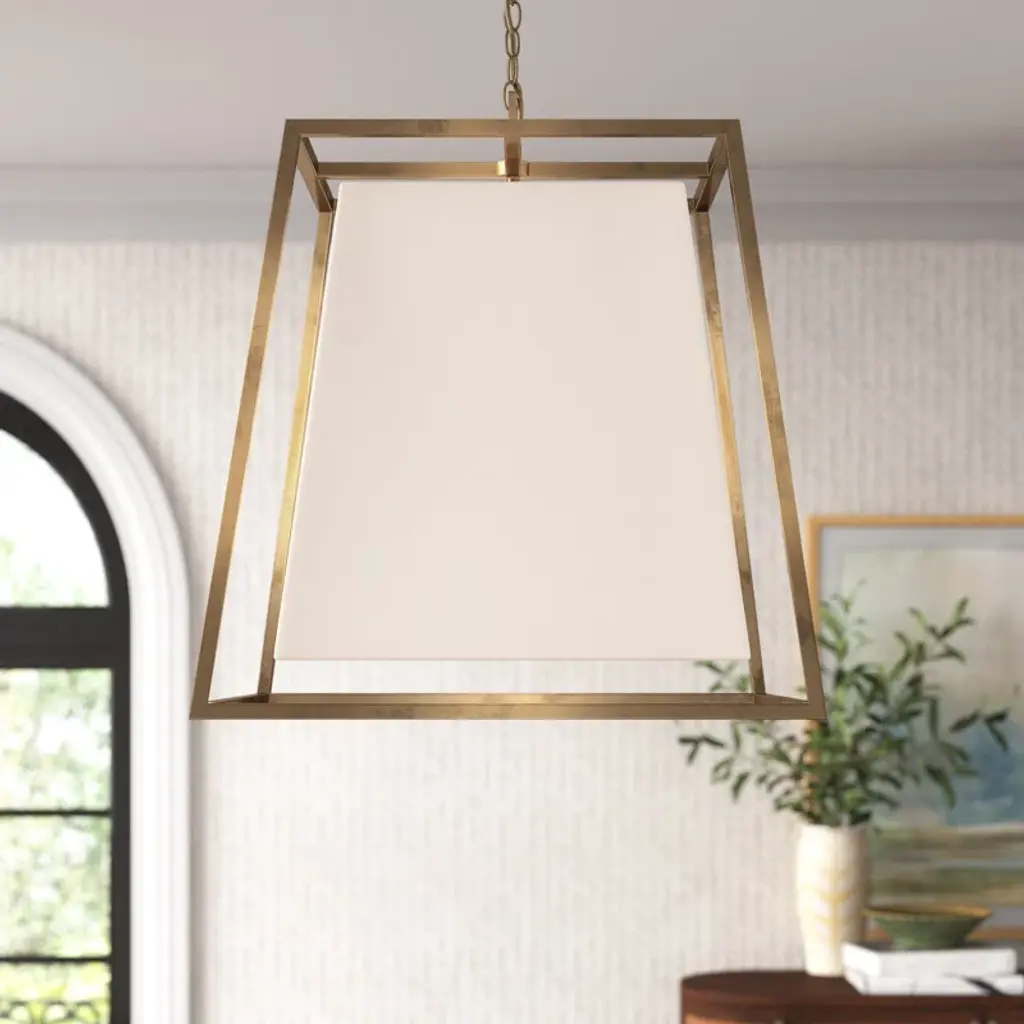 With the statement-making look of a chandelier and the small silhouette of a pendant light, this fixture is ideal for adding an architecture-inspired element to any space. It's made from metal and has an airy, open geometric frame defined by its sleek angles and clean lines. This chandelier hangs from a circular canopy and a length of adjustable height chain, so it's easy to position it in just the right place. The interior paper shade filters light from four bulbs of up to 60W (sold separately) to provide down light that's made to brighten up any space.