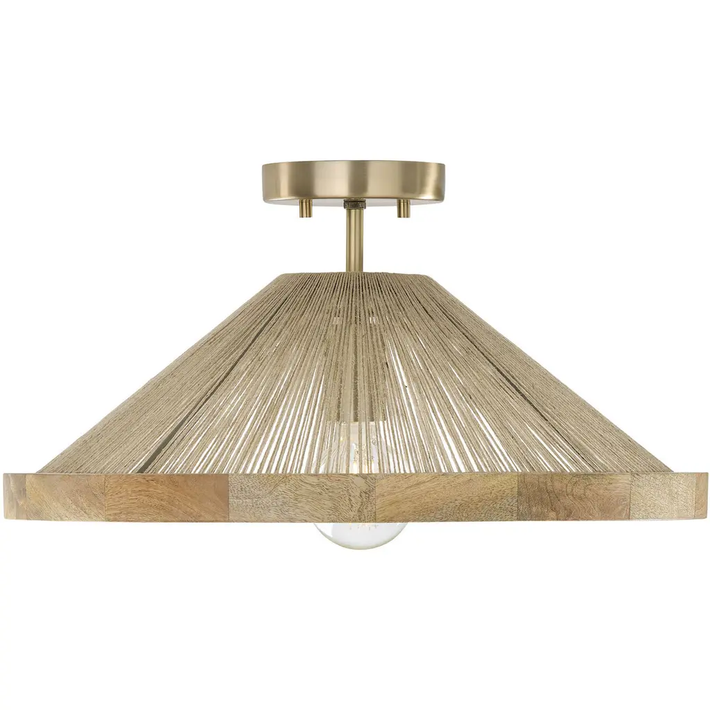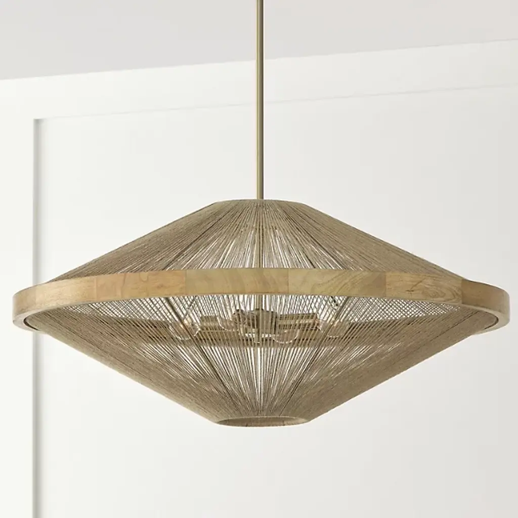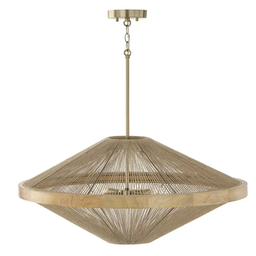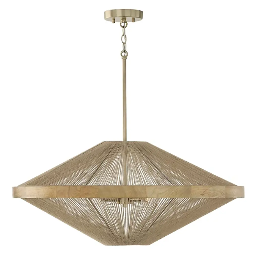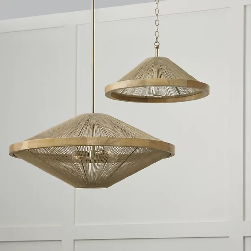 The Maya Closed Pendant from Capital Lighting redefines the art of illumination with its distinctive diamond shape. Handcrafted from light-stained mango wood and enveloped in wrapped natural jute rope, it easily becomes the focal point of your room. The closed design cocoons the light source, generating a comfortable glow that's both intimate and inviting. This pendant elevates your decor with its earthy elegance and artful craftsmanship.