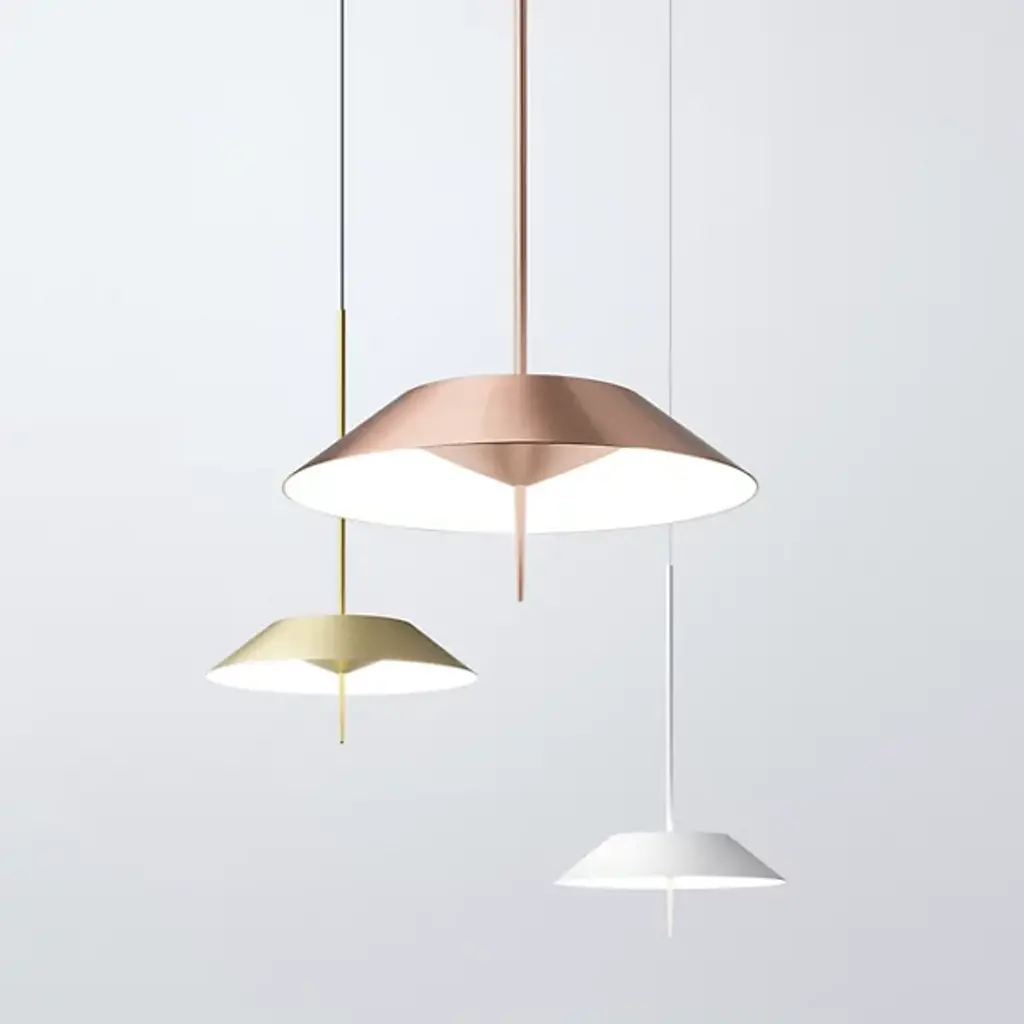 With its saucer-like appearance and sleek metallic finish, the Mayfair 5525 LED Pendant by Vibia makes for a modern, slightly futuristic addition to a variety of rooms. This metallic pendant light is equipped with a thin Steel rod and a circular canopy. Its LED light source generates a soft downwards illumination suitable for use atop kitchen islands, dining room tables, or assembled consecutively in hallways.