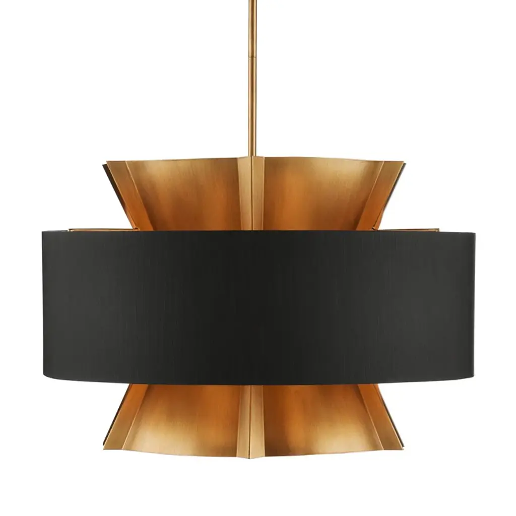 This exquisite ceiling lamp is distinctive for its unique silhouette fashioned in the form of a truncated, inverted cone comprising eight elements. The fronts are covered in goatskin, while the sides are in burnished brass. Eight LED strips illuminate the body, the dynamic interplay of lights and shadows that seemingly pulsates for a superb ambiance. This timeless piece evokes the rigor of a classic chandelier interpreted with contemporary sensibility.