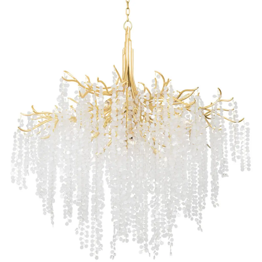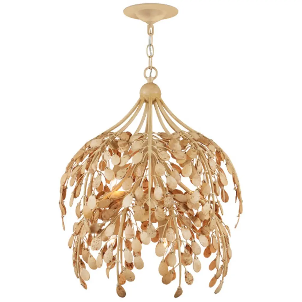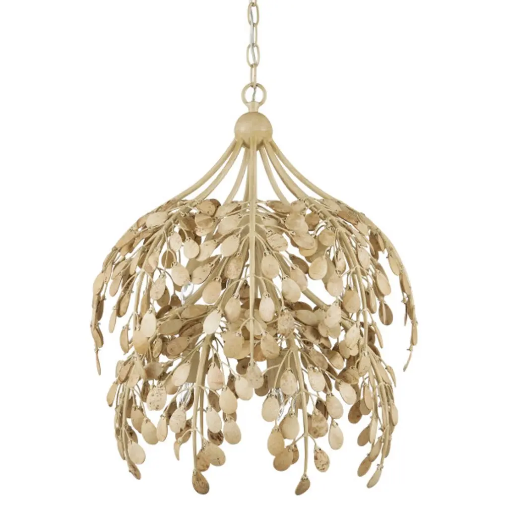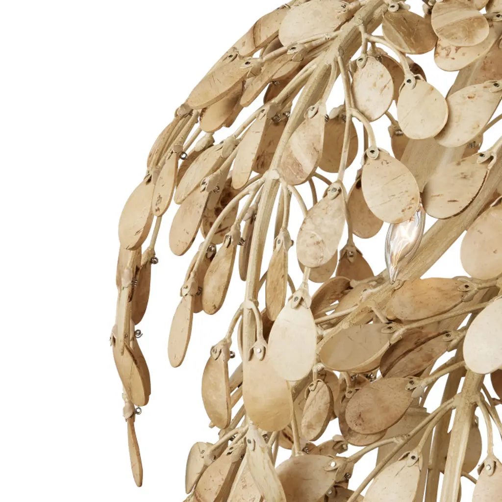 As graceful as the fronds that flow from the crown of the palm tree after which it is named, the Maypan Pendant has weeping limbs of petals made of bleached coconut shells held in place by a wrought iron frame finished in coco cream. The color of the metal is so in sync with the natural material, the beige pendant looks as if it is a living specimen. Adjustable from 32" to 100" with use of included chain/rod kit/cable.