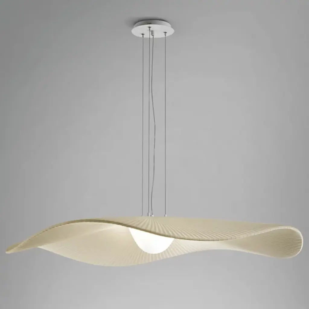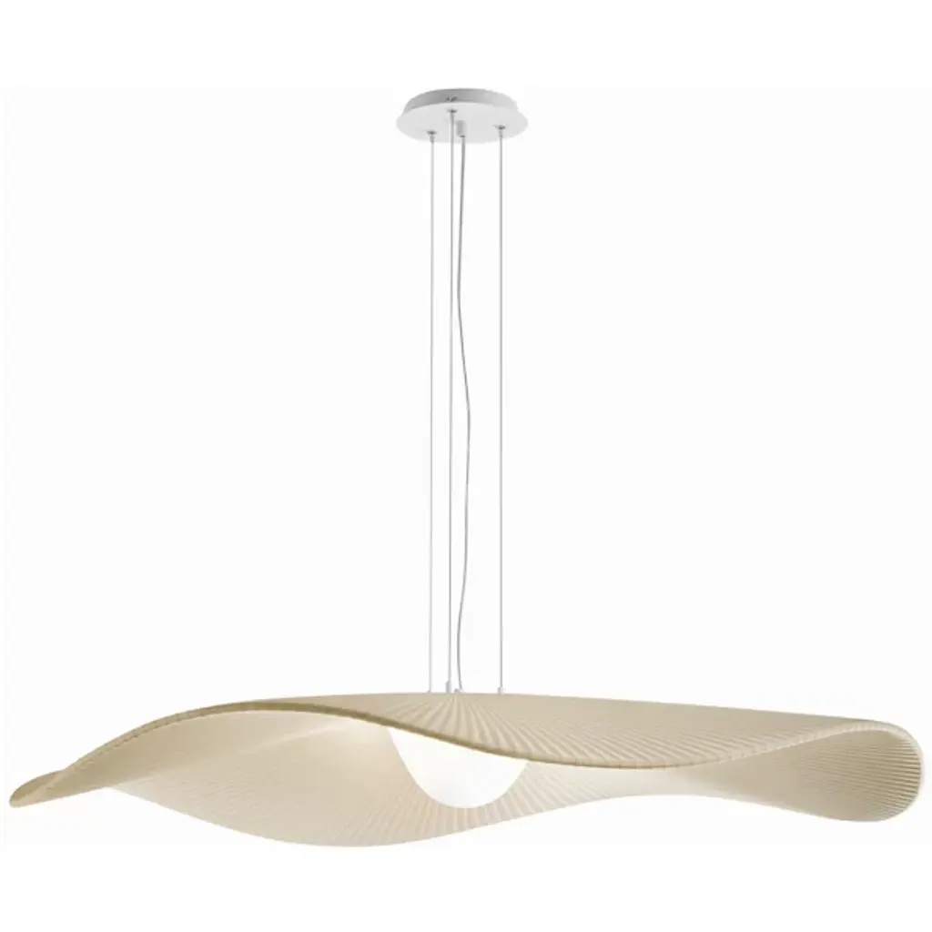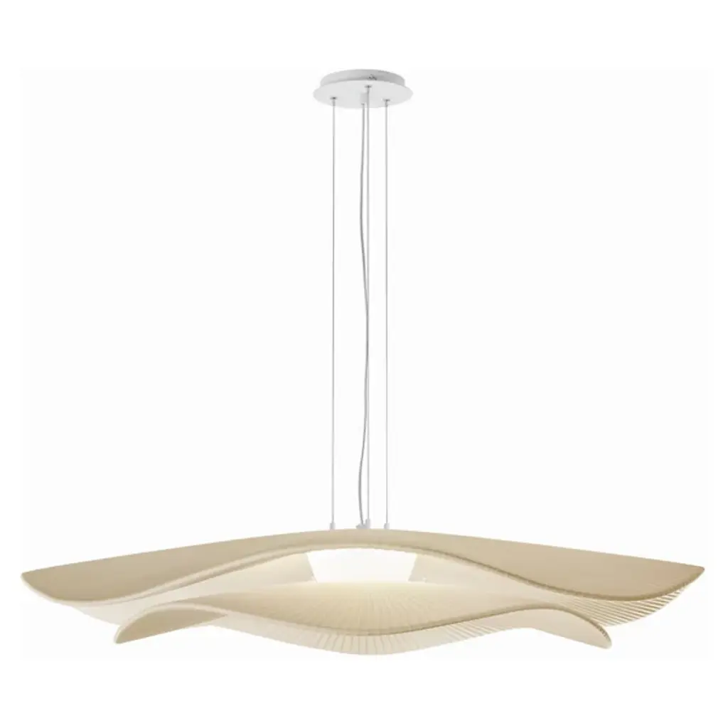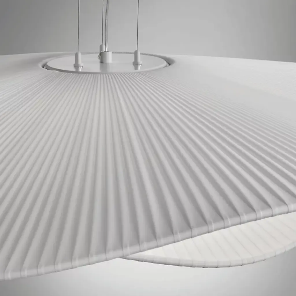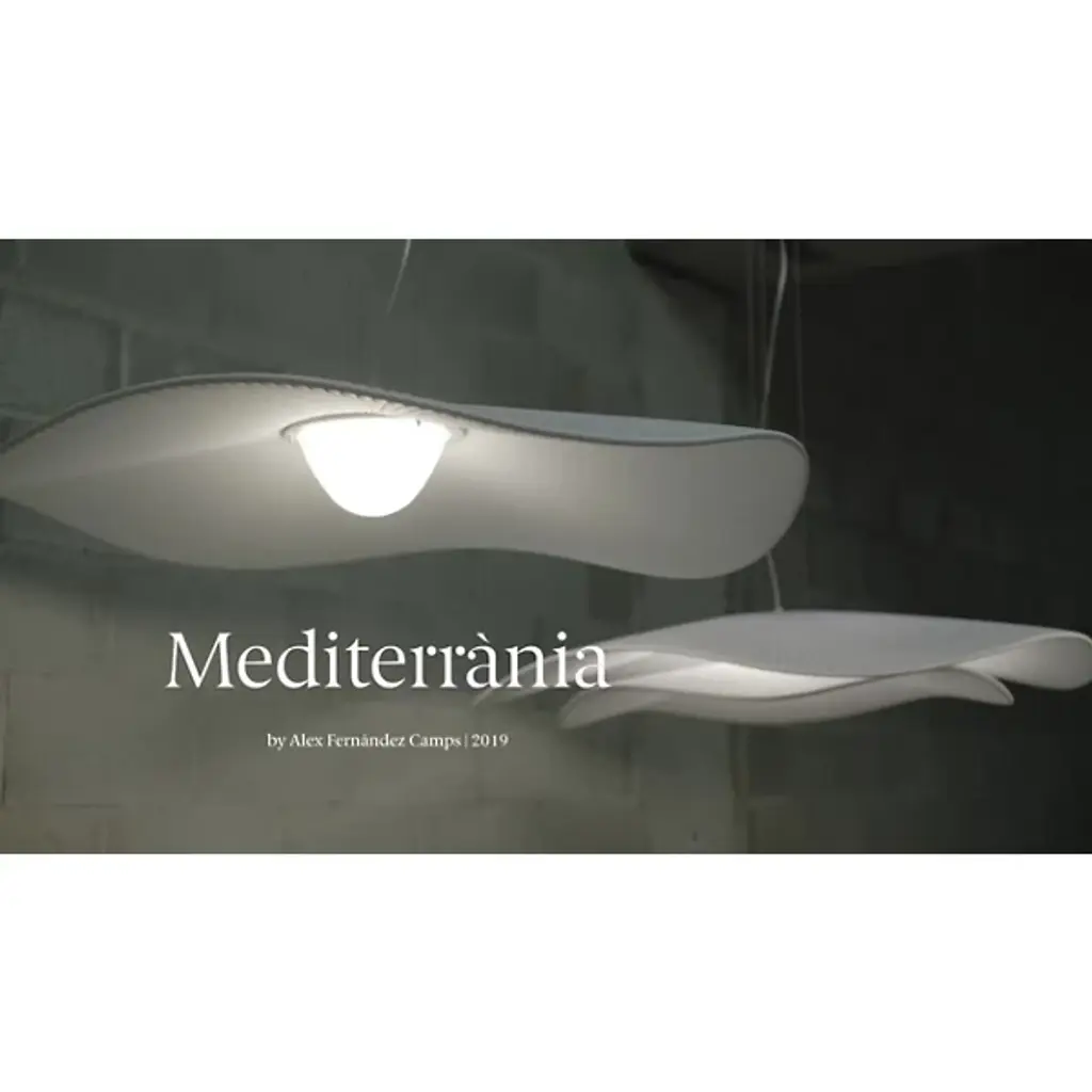 The Mediterrania LED Pendant from Bover is a cunning assembly of natural shapes, with a curving fabric shade tucked over an iron and aluminum frame. Designed in 2019 by Alex Fernandez Camps, its construction is reminiscent of a pearl set into the center of a shell, kept steady by three thin wires that drop from a stepped disc ceiling mount. The potent and power-efficient LED lamping glows from above, combining with bright beams of direct light that peek out through openings in its fabric shade.