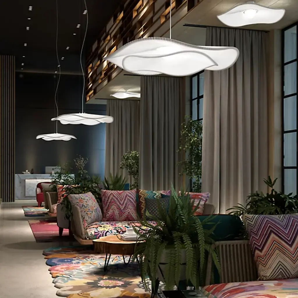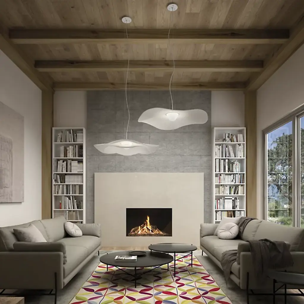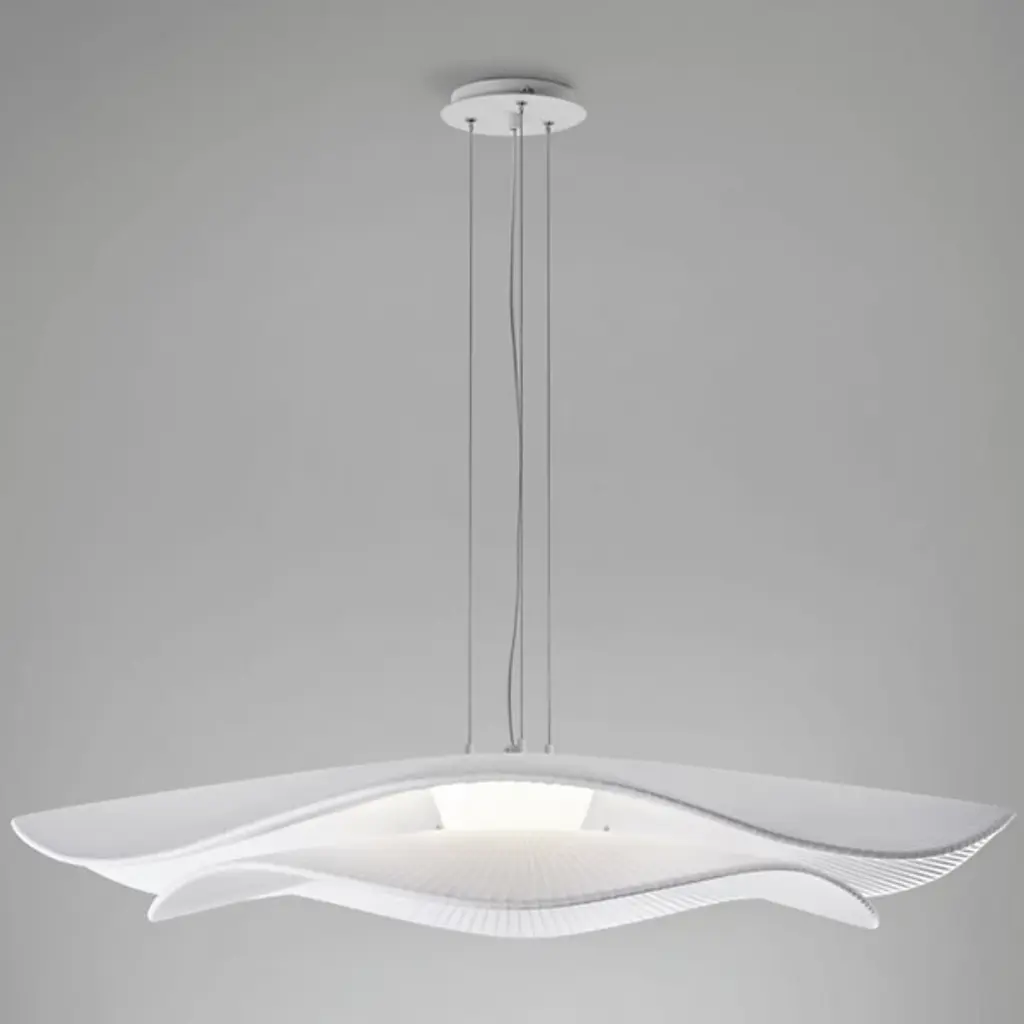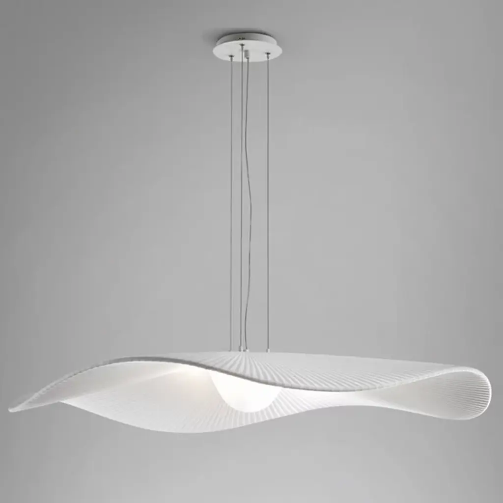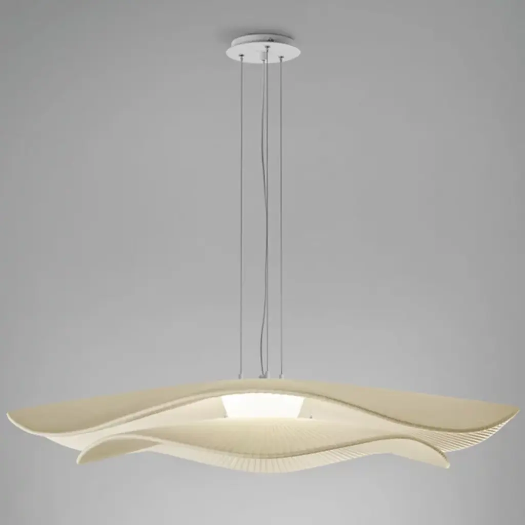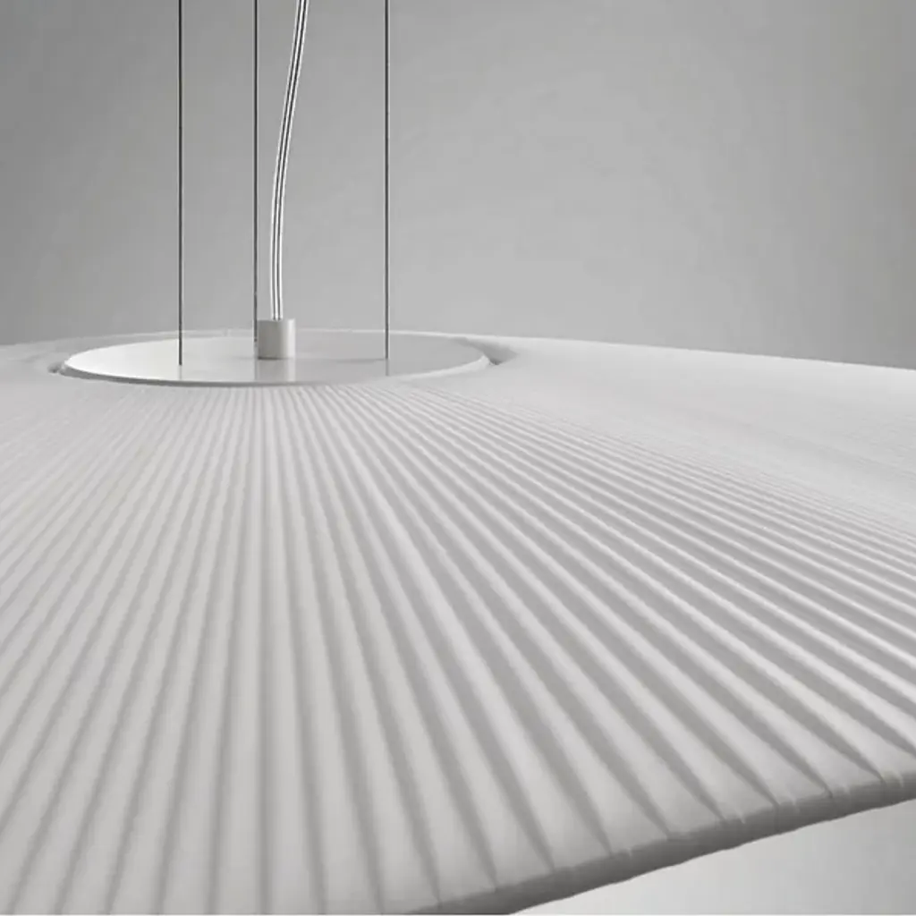 The Mediterrania LED Pendant from Bover is a cunning assembly of natural shapes, with a curving fabric shade tucked over an iron and aluminum frame. Designed in 2019 by Alex Fernandez Camps, its construction is reminiscent of a pearl set into the center of a shell, kept steady by three thin wires that drop from a stepped disc ceiling mount. The potent and power-efficient LED lamping glows from above, combining with bright beams of direct light that peek out through openings in its fabric shade.