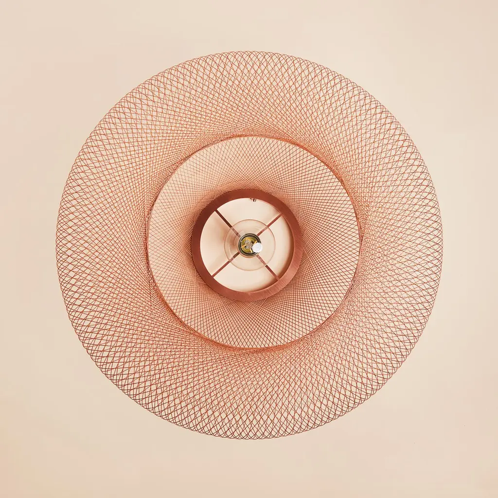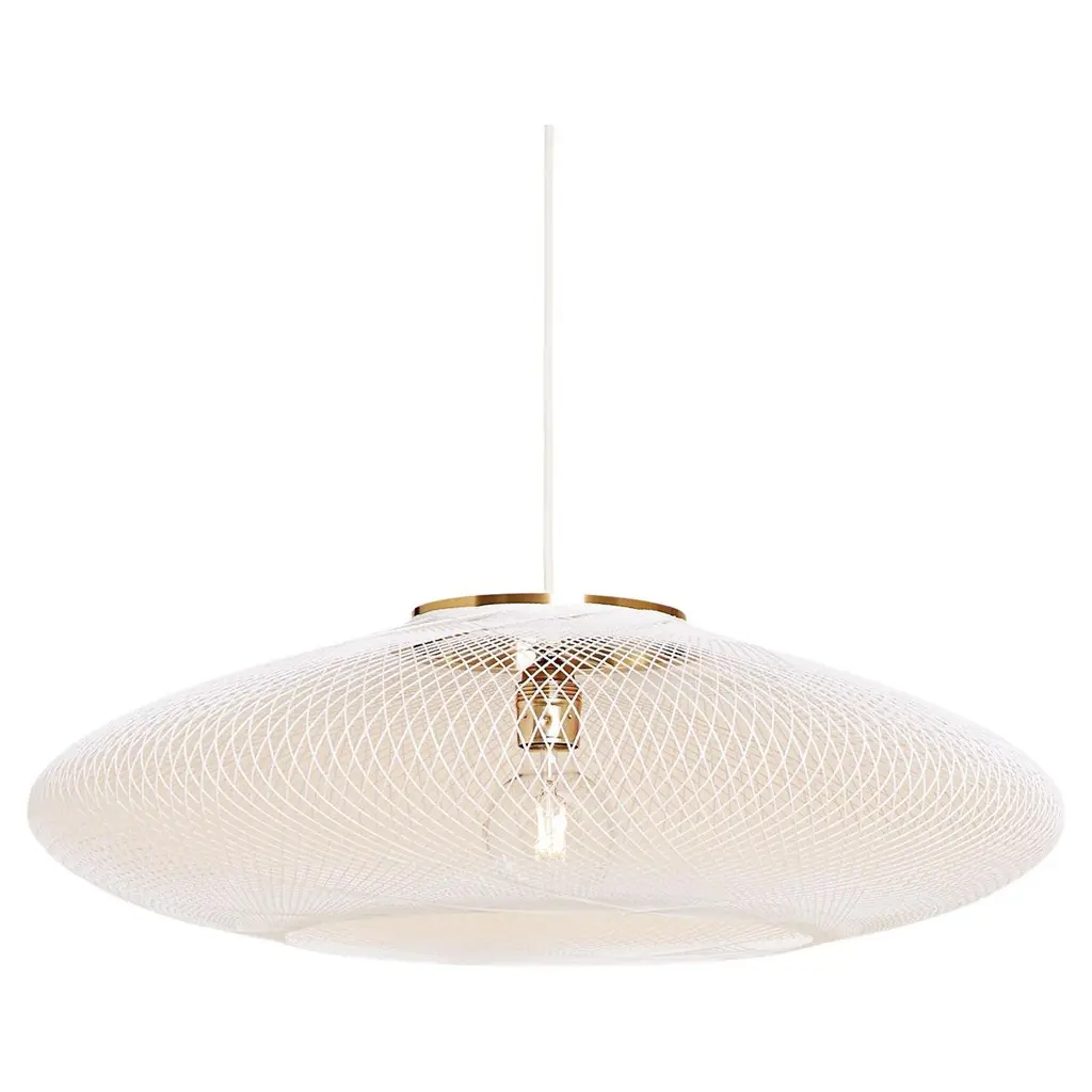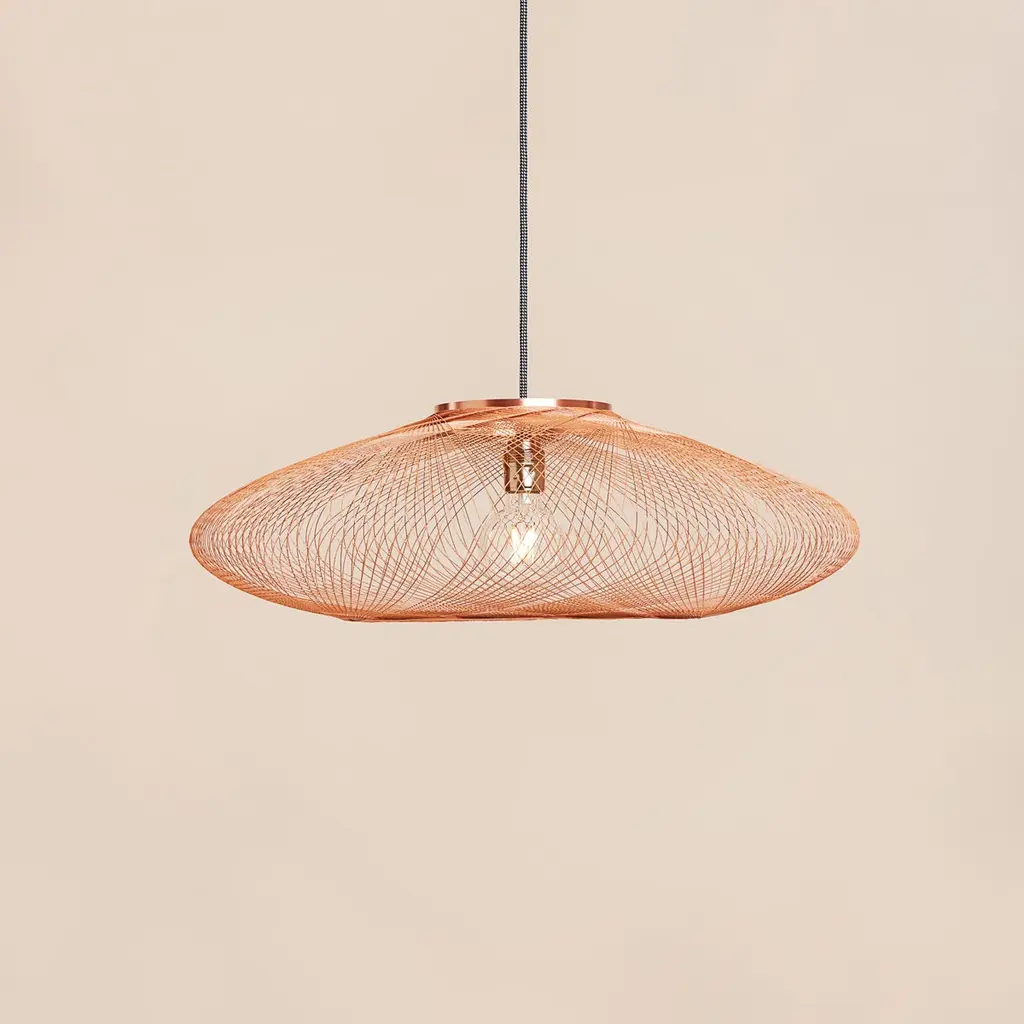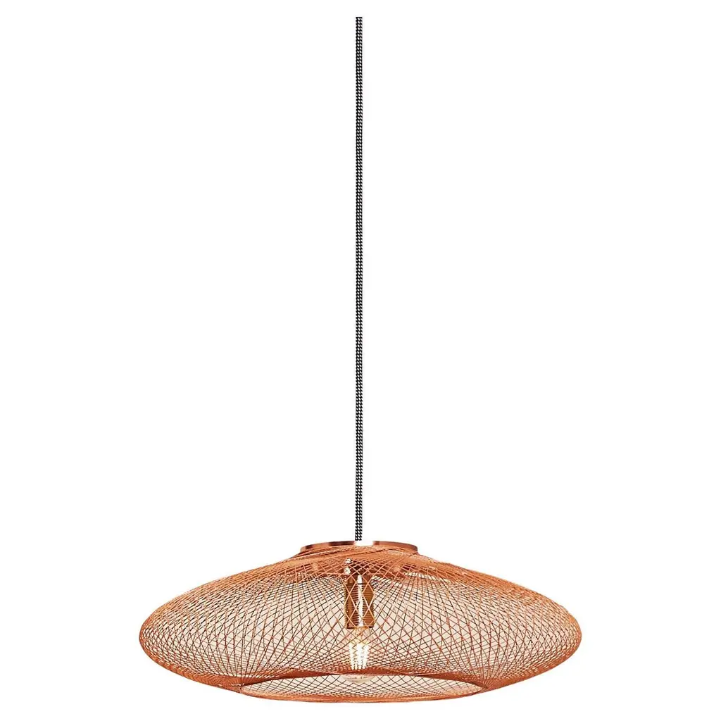 Medium Copper UFO pendant lamp by Atelier RobotiqDimensions: D 60 x H 18 cmMaterials: Resin-impregnated industrial fiber, brass.Available with holder in copper/ brass/ black coated stainless steel.Available in different colors, 3 sizes, and in Full pattern or Open pattern.All our lamps can be wired according to each country. If sold to the USA it will be wired for the USA for instance.For the Fiber Pattern Lamp series we experiment with robotic weaving techniques. The geometrical weave patterns are designed using mathematical models and manufactured with an industrial robot.The Fiber Pattern Lamp is made of resin-impregnated f ibers. The fibers are wound with a industrial robot around a mold in geometric patterns. The result is a mesmerizing lightweight and strong lamp.Atelier Robotiq is a Rotterdam based design company founded by Søren Blomaard andAnne-Lise Heydra.Their different backgrounds combining robotics, aerospace engineering, product design and fine arts leads to unexpected and exciting products.For their mesmerizing Fiber Pattern Lamp series they experiment using an Aerospace fiber winding technology and an industrial robot for weaving light and open fiber structures. Our Fiber Pattern Lamps are being manufactured in the mini-factory in the city center of Rotterdam.The team of Atelier Robotiq loves to experiment with new materials and truly get to know a production process, learning new things and taking time for ideas and designs to grow and mature.