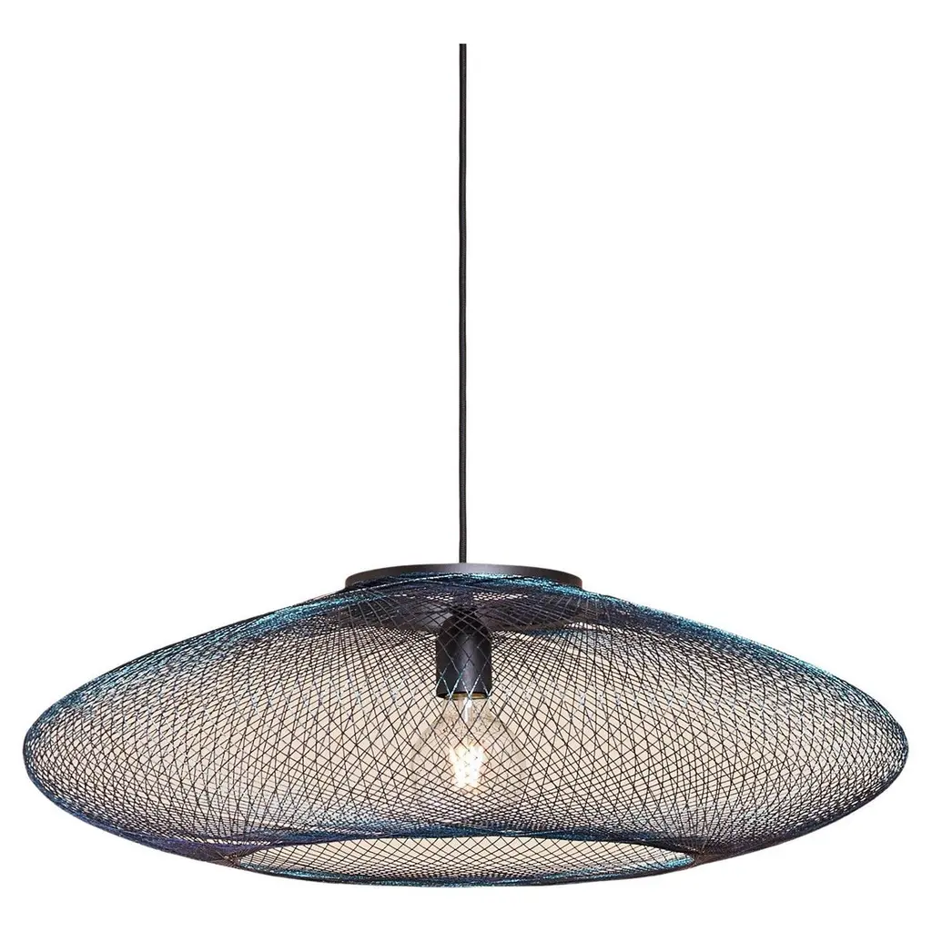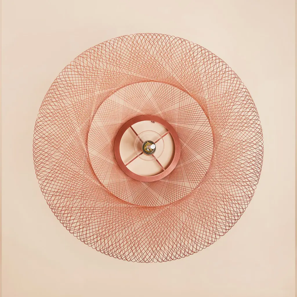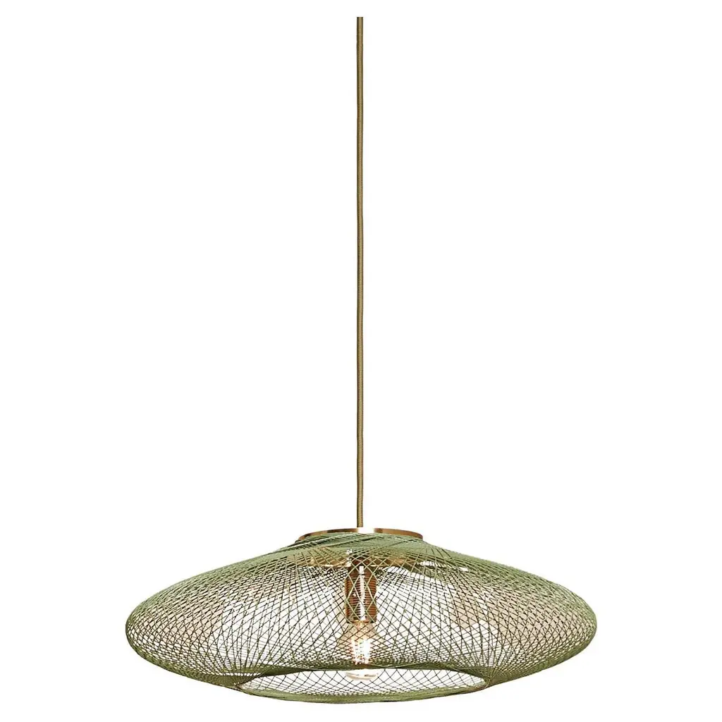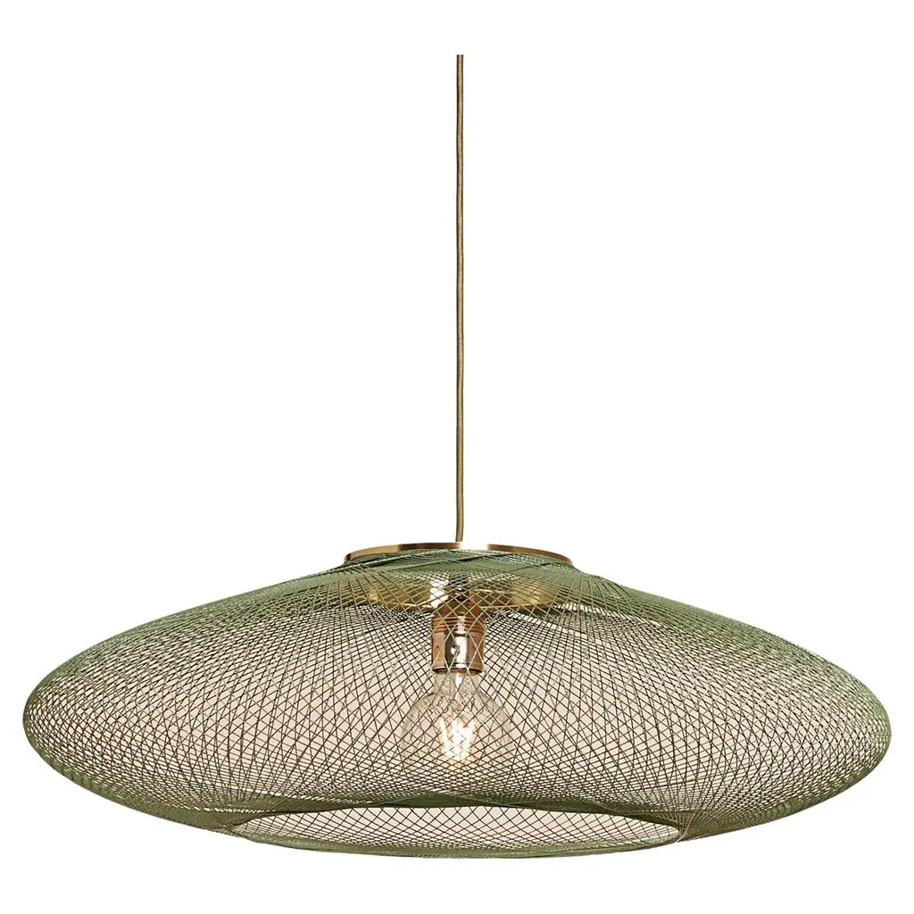 Medium Copper UFO pendant lamp by Atelier RobotiqDimensions: D 60 x H 18 cmMaterials: Resin-impregnated industrial fiber, brass.Available with holder in copper/ brass/ black coated stainless steel.Available in different colors, 3 sizes, and in Full pattern or Open pattern.All our lamps can be wired according to each country. If sold to the USA it will be wired for the USA for instance.For the Fiber Pattern Lamp series we experiment with robotic weaving techniques. The geometrical weave patterns are designed using mathematical models and manufactured with an industrial robot.The Fiber Pattern Lamp is made of resin-impregnated f ibers. The fibers are wound with a industrial robot around a mold in geometric patterns. The result is a mesmerizing lightweight and strong lamp.Atelier Robotiq is a Rotterdam based design company founded by Søren Blomaard andAnne-Lise Heydra.Their different backgrounds combining robotics, aerospace engineering, product design and fine arts leads to unexpected and exciting products.For their mesmerizing Fiber Pattern Lamp series they experiment using an Aerospace fiber winding technology and an industrial robot for weaving light and open fiber structures. Our Fiber Pattern Lamps are being manufactured in the mini-factory in the city center of Rotterdam.The team of Atelier Robotiq loves to experiment with new materials and truly get to know a production process, learning new things and taking time for ideas and designs to grow and mature.