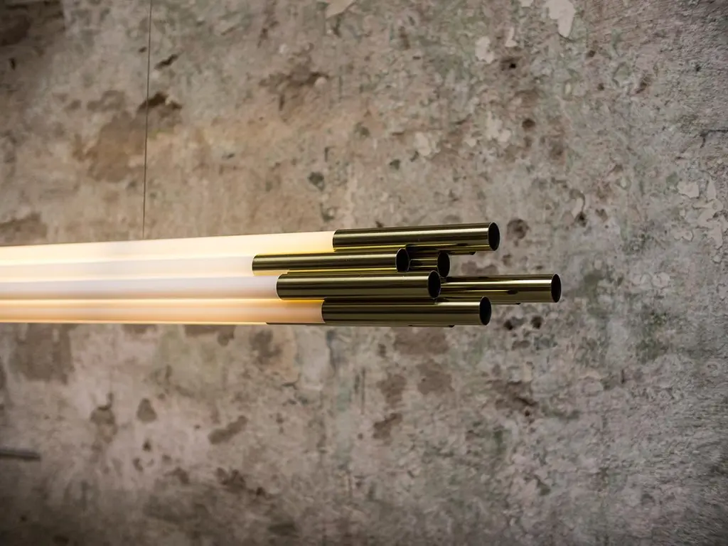 Medium horizontal Org pendant lamp by Sebastian SummaDimensions: D 160 x W 7.7 x H 7.7 cmMaterials: aluminum, opaline glassAvailable in 3 sizes: 130cm, 160cm.All our lamps can be wired according to each country. If sold to the USA it will be wired for the USA for instance.Horizontal pendant lamp in anodised aluminium (gold finish) and opaline glass. The designer, Sebastian Summa, was inspired by science fiction and astronomy to create a lamp like a shooting star.Sebastian Summa, born in Bavaria, studied design at University of Applied Sciences in Potsdam. He lives in Berlin."As a designer, I create objects and spaces. My passion for metals grew during my time as a blacksmith.In the subsequent design studies and through other interesting jobs, I expanded my wealth of experience inmanual handling of various materials. In the studio, my ideas are implemented from prototypes or one-offs to small series."
