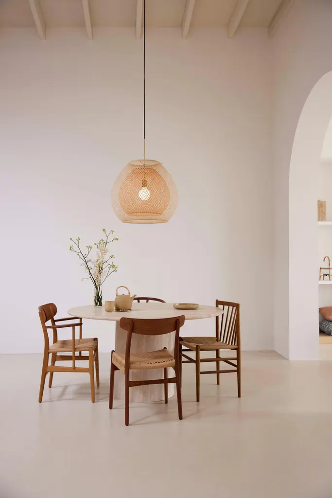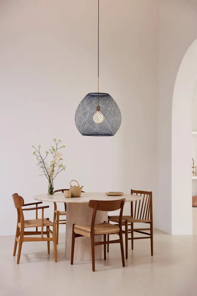 Medium Light Golden Hour Twilight Single pendant lamp by Atelier RobotiqDimensions: D 55 x H 49 cmMaterials: Resin-impregnated industrial fiber.Available in different colors: LIght Golden Hour, Dark Golden Hour, Light Pink Moon, Dark Pink Moon and Light Indigo Night, Dark Indigo Night.Also available in set version and in 3 sizes: Ø 42 cm, Ø 55 cm, Ø 72 cm.All our lamps can be wired according to each country. If sold to the USA it will be wired for the USA for instance.When day meets night, Twilight appears.The Twilight is a f iber sculpture of f ine lines drawn into the air shaping her presence.The transition of day into night and their moment of coexistence is captured by the two shapes merging into one another. As you wonder how the one shape could have entered inside the otherthey also seem to naturally coexist in perfect balance. The fiber colors appearing in transparent layers give subtle hints of pink, blue and warm yellow tones, reflecting the twilight skies.Atelier Robotiq is a Rotterdam based design company founded by Søren Blomaard andAnne-Lise Heydra.Their different backgrounds combining robotics, aerospace engineering, product design and fine arts leads to unexpected and exciting products.For their mesmerizing Fiber Pattern Lamp series they experiment using an Aerospace fiber winding technology and an industrial robot for weaving light and open fiber structures. Our Fiber Pattern Lamps are being manufactured in the mini-factory in the city center of Rotterdam.The team of Atelier Robotiq loves to experiment with new materials and truly get to know a production process, learning new things and taking time for ideas and designs to grow and mature.