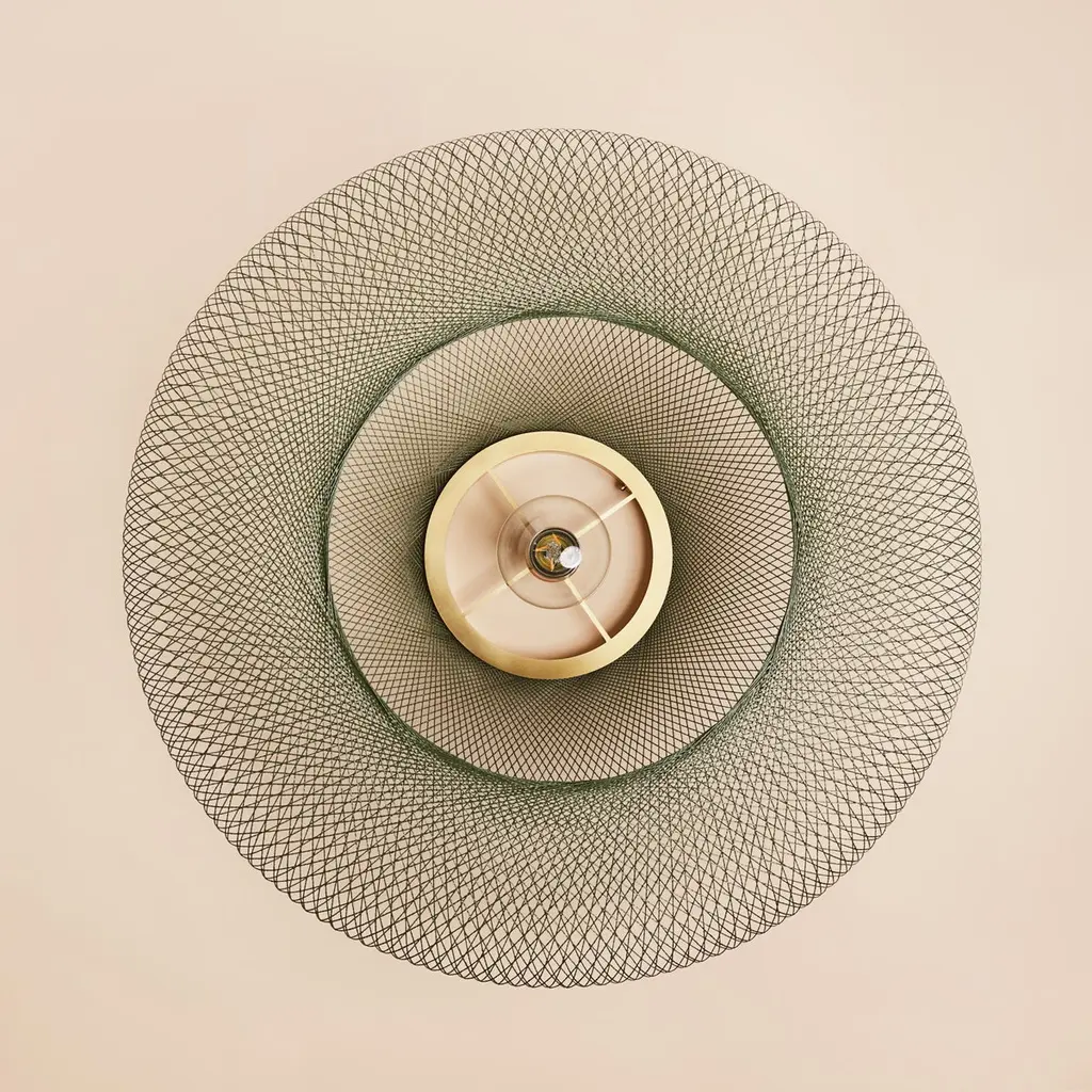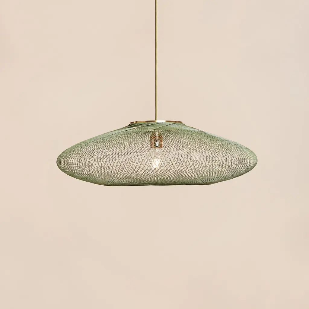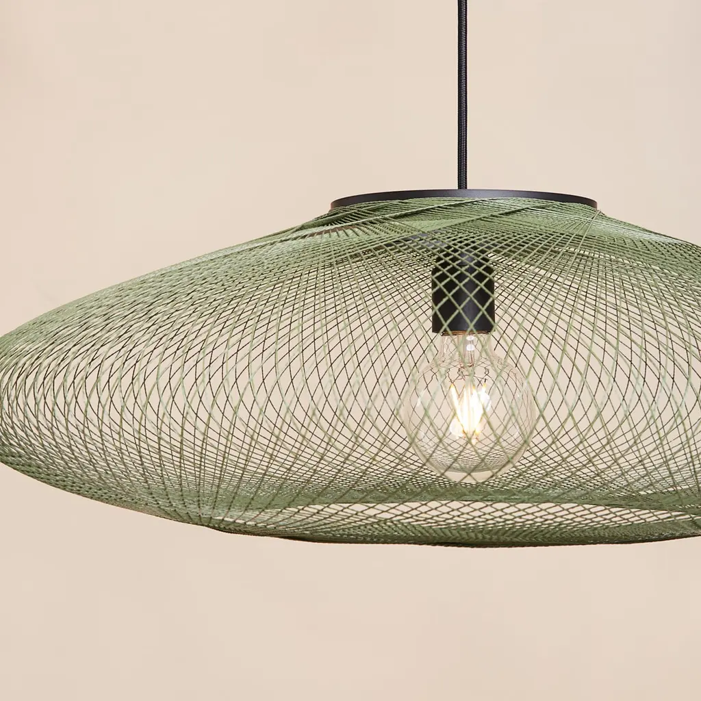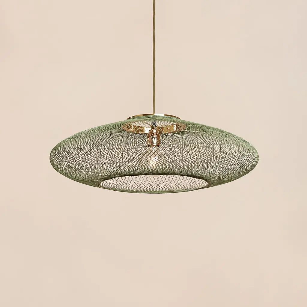 Medium Moss Green UFO pendant lamp by Atelier RobotiqDimensions: D 60 x H 18 cmMaterials: Resin-impregnated industrial fiber, brass.Available with holder in brass/ black coated stainless steel.Available in different colors, 3 sizes, and in Full pattern or Open pattern.All our lamps can be wired according to each country. If sold to the USA it will be wired for the USA for instance.For the Fiber Pattern Lamp series we experiment with robotic weaving techniques. The geometrical weave patterns are designed using mathematical models and manufactured with an industrial robot.The Fiber Pattern Lamp is made of resin-impregnated f ibers. The fibers are wound with a industrial robot around a mold in geometric patterns. The result is a mesmerizing lightweight and strong lamp.Atelier Robotiq is a Rotterdam based design company founded by Søren Blomaard andAnne-Lise Heydra.Their different backgrounds combining robotics, aerospace engineering, product design and fine arts leads to unexpected and exciting products.For their mesmerizing Fiber Pattern Lamp series they experiment using an Aerospace fiber winding technology and an industrial robot for weaving light and open fiber structures. Our Fiber Pattern Lamps are being manufactured in the mini-factory in the city center of Rotterdam.The team of Atelier Robotiq loves to experiment with new materials and truly get to know a production process, learning new things and taking time for ideas and designs to grow and mature.