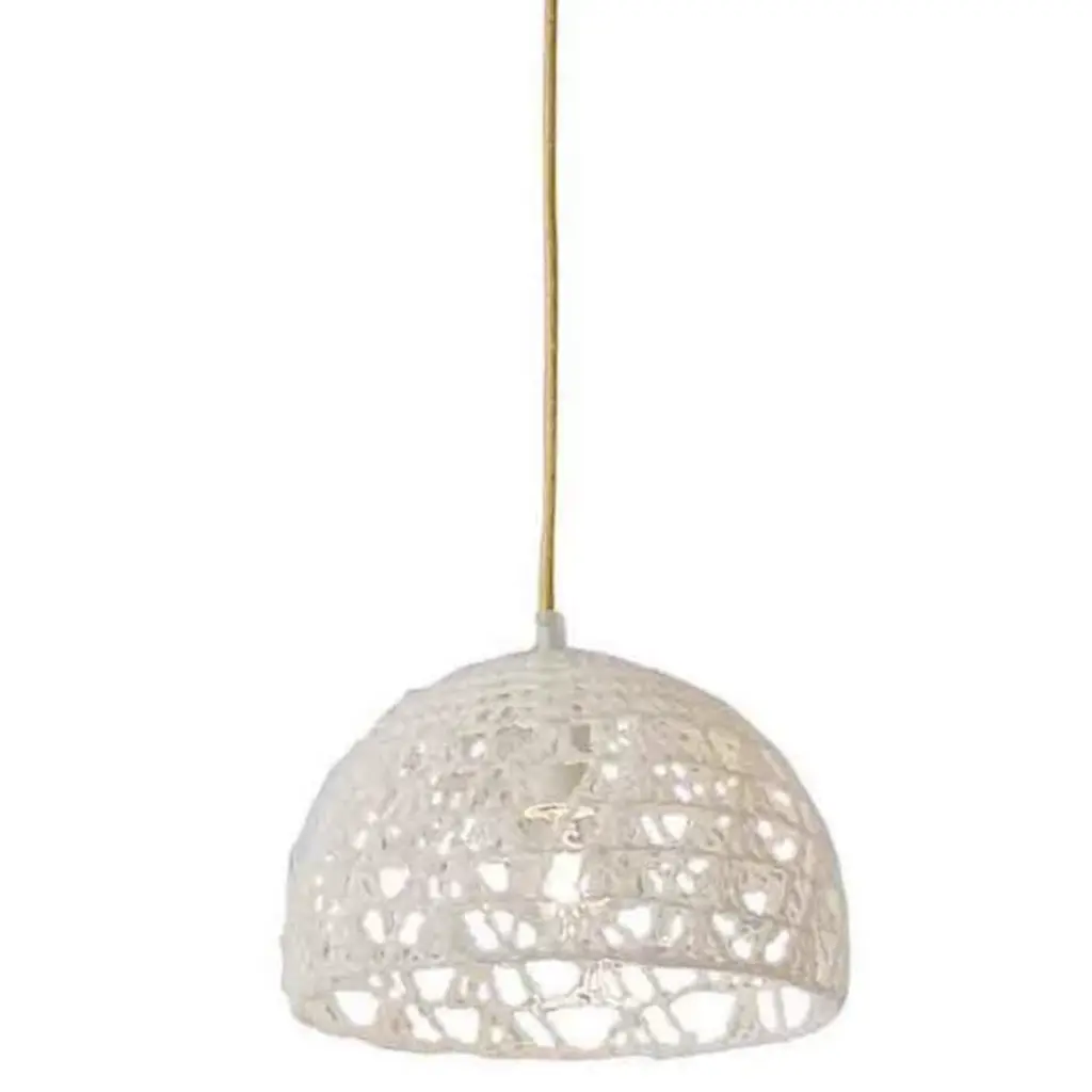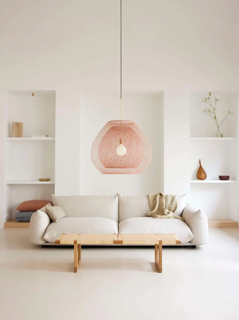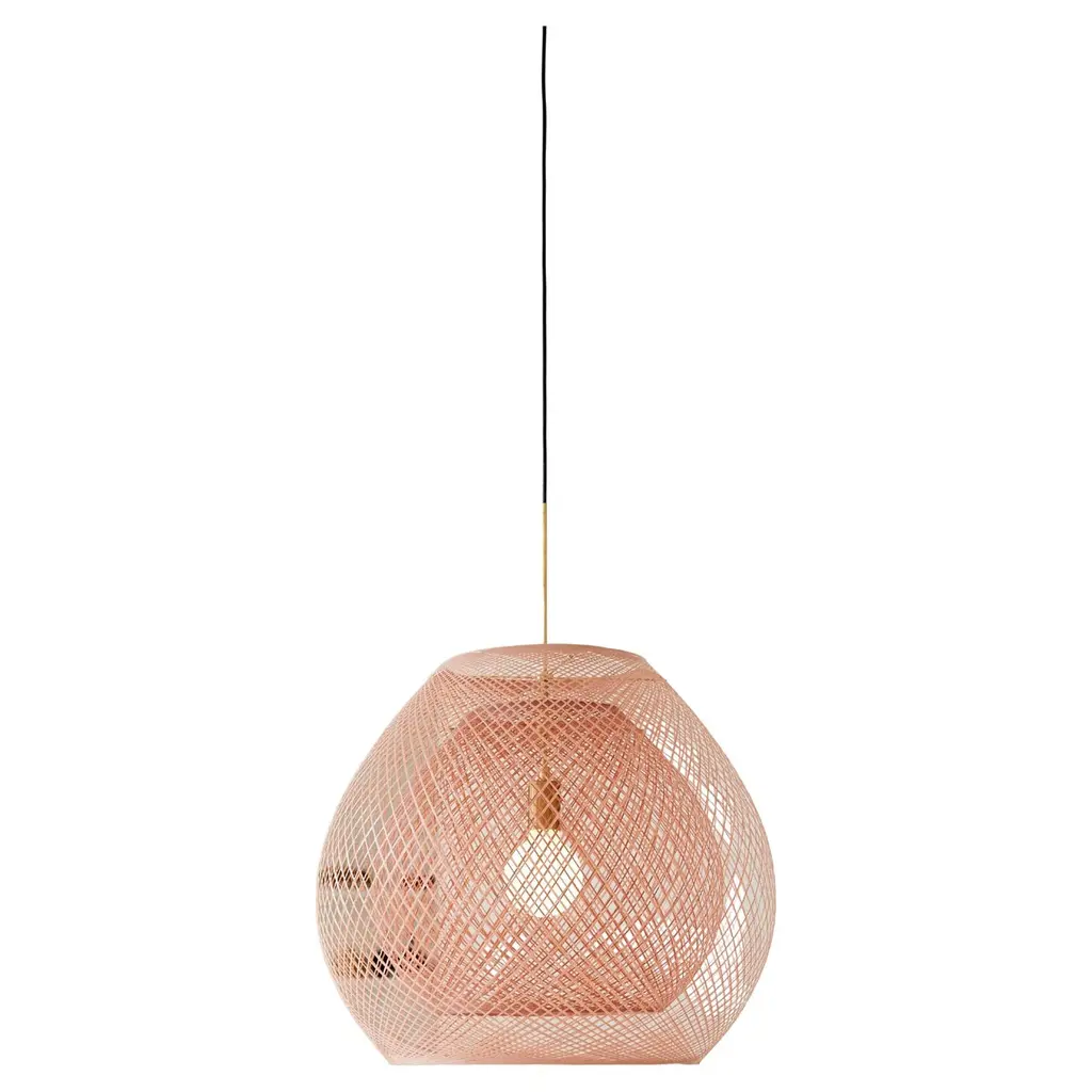 Medium Pink Moon Twilight Set pendant lamp by Atelier RobotiqDimensions: D 55 x H 49 cmMaterials: Resin-impregnated industrial fiber.Available in different colors: Golden Hour, Pink Moon, and Indigo Night.Also available in single version.All our lamps can be wired according to each country. If sold to the USA it will be wired for the USA for instance.When day meets night, Twilight appears.The Twilight is a f iber sculpture of f ine lines drawn into the air shaping her presence.The transition of day into night and their moment of coexistence is captured by the two shapes merging into one another. As you wonder how the one shape could have entered inside the otherthey also seem to naturally coexist in perfect balance. The fiber colors appearing in transparent layers give subtle hints of pink, blue and warm yellow tones, reflecting the twilight skies.Atelier Robotiq is a Rotterdam based design company founded by Søren Blomaard andAnne-Lise Heydra.Their different backgrounds combining robotics, aerospace engineering, product design and fine arts leads to unexpected and exciting products.For their mesmerizing Fiber Pattern Lamp series they experiment using an Aerospace fiber winding technology and an industrial robot for weaving light and open fiber structures. Our Fiber Pattern Lamps are being manufactured in the mini-factory in the city center of Rotterdam.The team of Atelier Robotiq loves to experiment with new materials and truly get to know a production process, learning new things and taking time for ideas and designs to grow and mature.