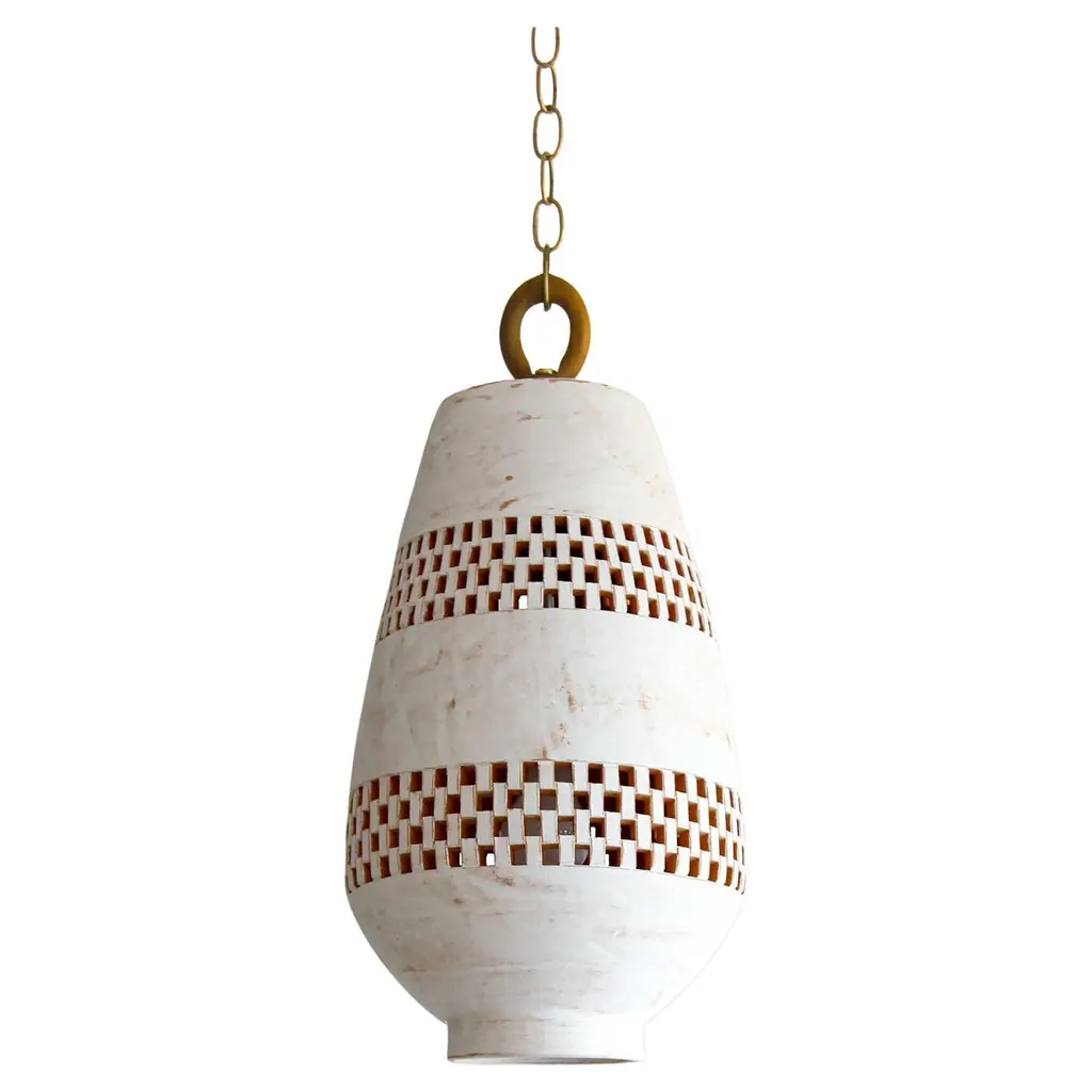 Our Atzompa Collection is created in the Oaxacan town of Santa María Atzompa, where the pottery-making tradition has roots tracing back to ancient Zapotec culture.Building on this tradition, we formed a partnership with master artisan Eligio Zarate, whose family has for generations worked to bring innovation to this centuries-old craft.Using a red clay that comes from local mountains, the pieces in this collection are first given form within custom gesso molds. Emerging from the molds, the repeating openwork designs—which play on motifs that are carved in to the stone at Mitla, the neighboring archeological ruins—are meticulously cut out one by one. Each piece is then brushed with a white wash before being fired in a wood-burning pit.DIMENSIONS10” Ø x 18” h25.5 cm Ø x 45 cm hLAMPINGSingle SocketBulbrite, G25, E26 LED (bulb included)8.5W 60W Equivalent800 Lumens3000K CRI 90+Fully compatible dimmingCERTIFICATIONSUL, cUL listed (120V) 240V available upon requestMOUNTINGUniversal ceiling mount; hardwiredSUSPENSION3 ft link chain (standard)METAL FINISHNatural Brass.