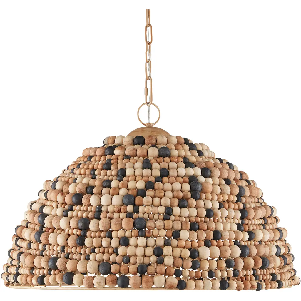 The Medley Pendant has an pebbly feel to its surface thanks to the wood beads that not only differ in size, but also in color -- natural, tan, and black. Clarence Mallari, who designed this dome-shaped pendant, notes how the wires are welded together to accommodate the different bead sizes and how the fixture looks beautiful when viewed from underneath.