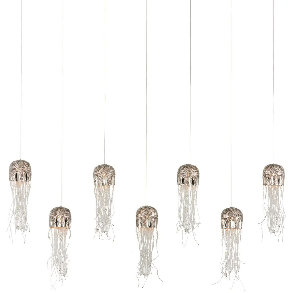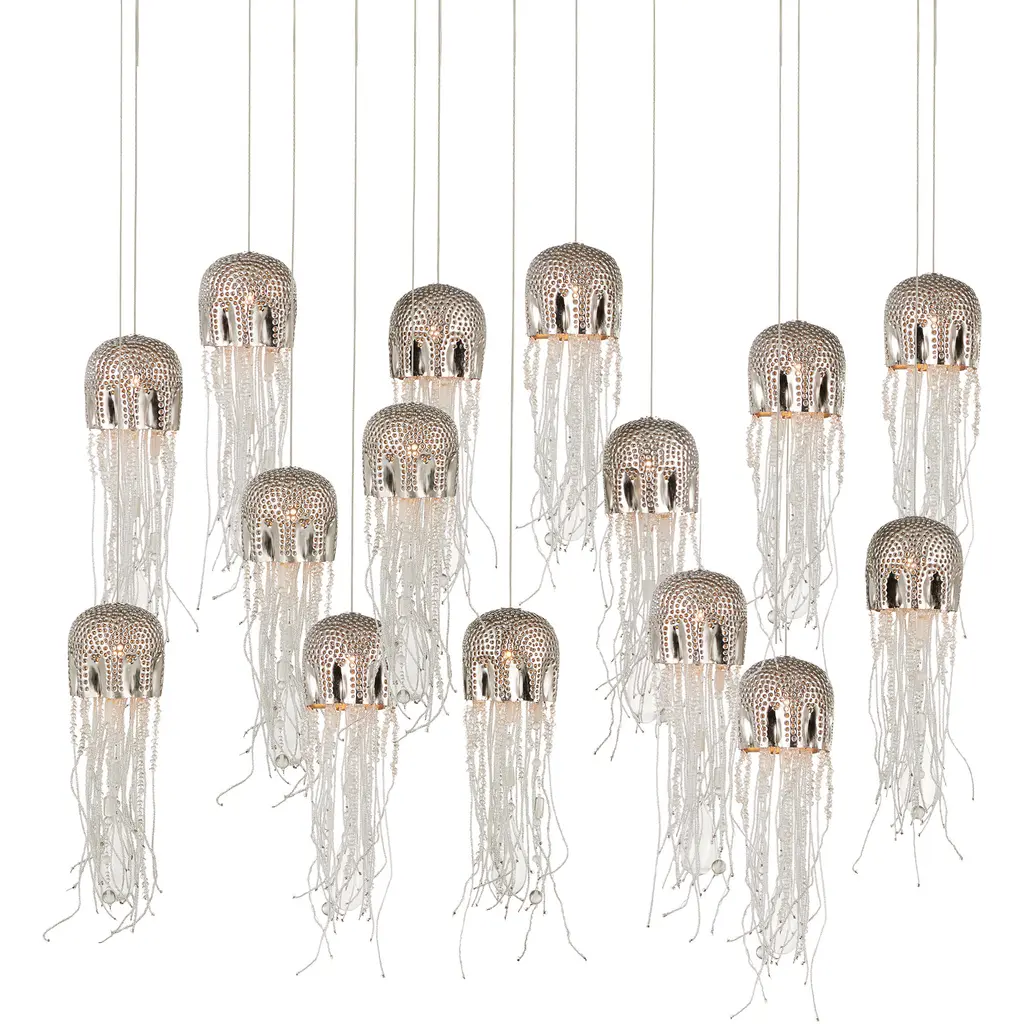 The Medusa 36-Light Multi-Drop Pendant effervesces with echoes of the deep sea. Beads cascading from its dimpled shades in a nickel finish mimic the profile of a jellyfish, one of nature’s most mysterious creatures. The beads are threaded by hand and the cap is hand-punched, a mix of tasks that are painstakingly involved. These highlight the skills of the craftspeople who make our most artful products. The beads took on added paleness once they were sandblasted before being attached. The canopies of the beaded pendants in this collection are luminous in a painted silver finish.
