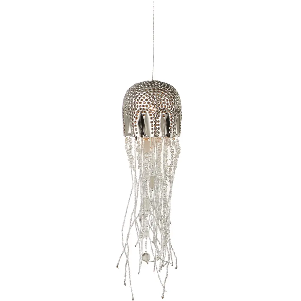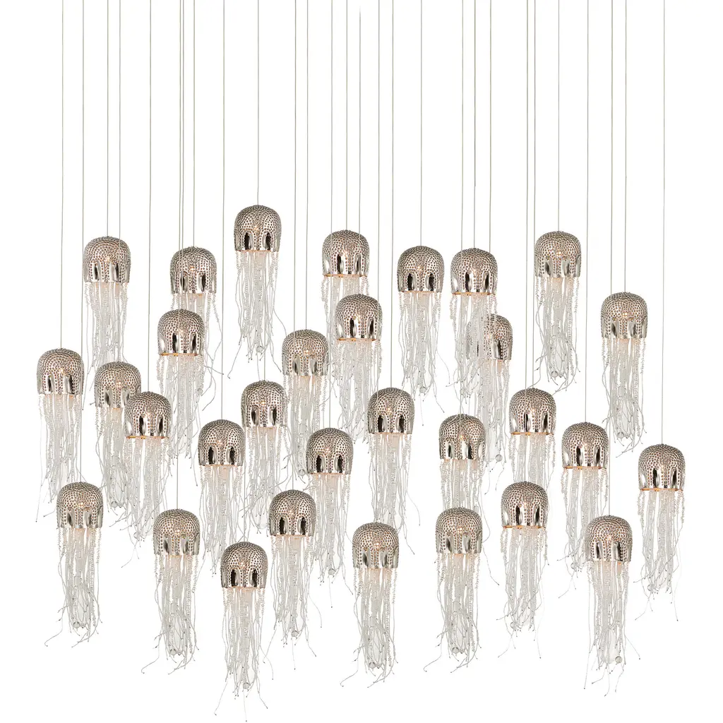 The Medusa Round 7-Light Multi-Drop Pendant effervesces with echoes of the deep sea. Beads cascading from its dimpled shades in a nickel finish mimic the profile of a jellyfish, one of nature’s most mysterious creatures. The beads are threaded by hand and the cap is hand-punched, a mix of tasks that are painstakingly involved. These highlight the skills of the craftspeople who make our most artful products. The beads took on added paleness once they were sandblasted before being attached. The canopies of the beaded pendants in this collection are luminous in a painted silver finish.