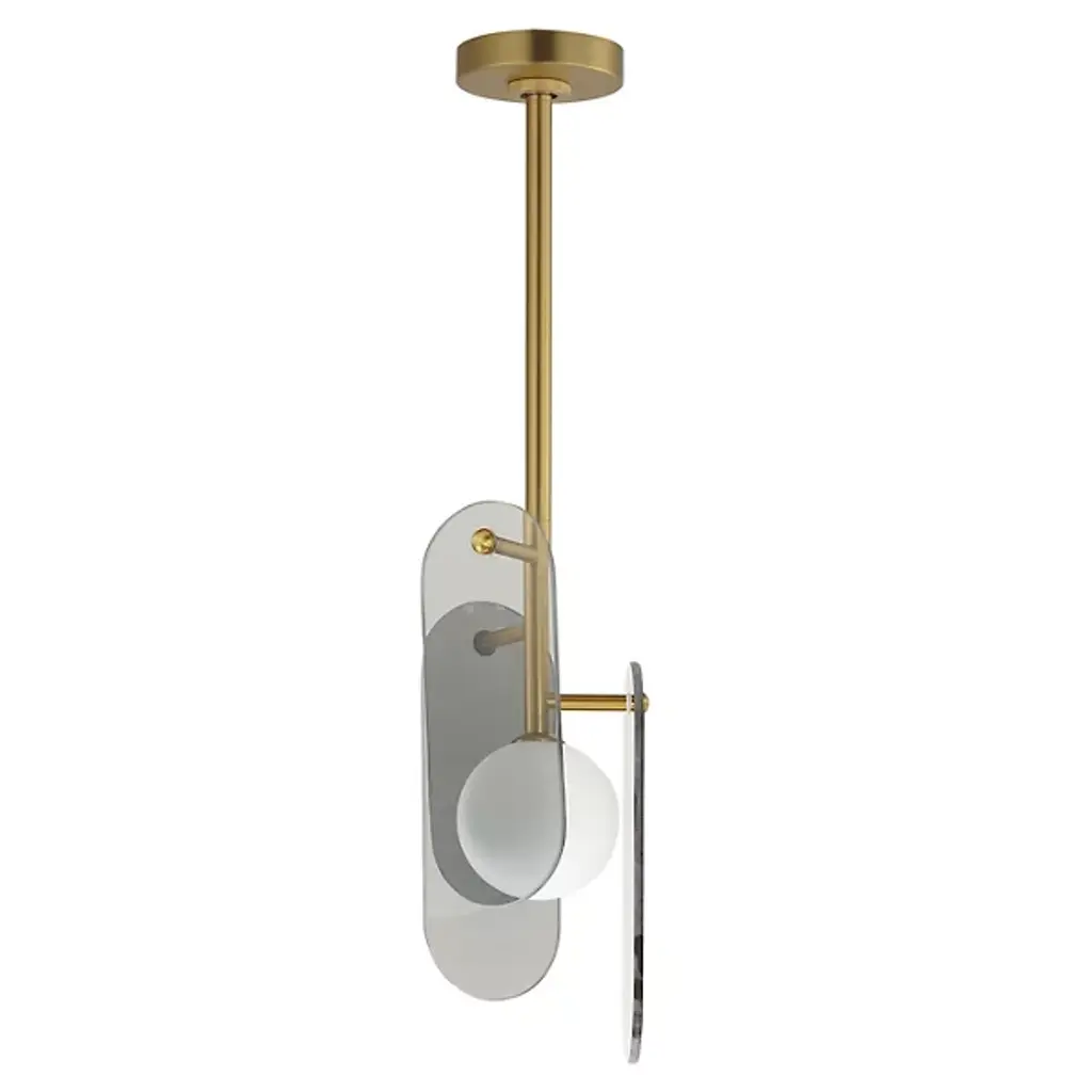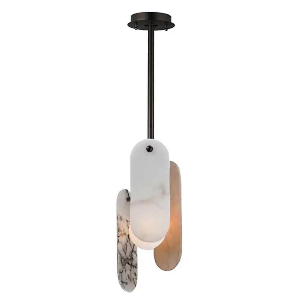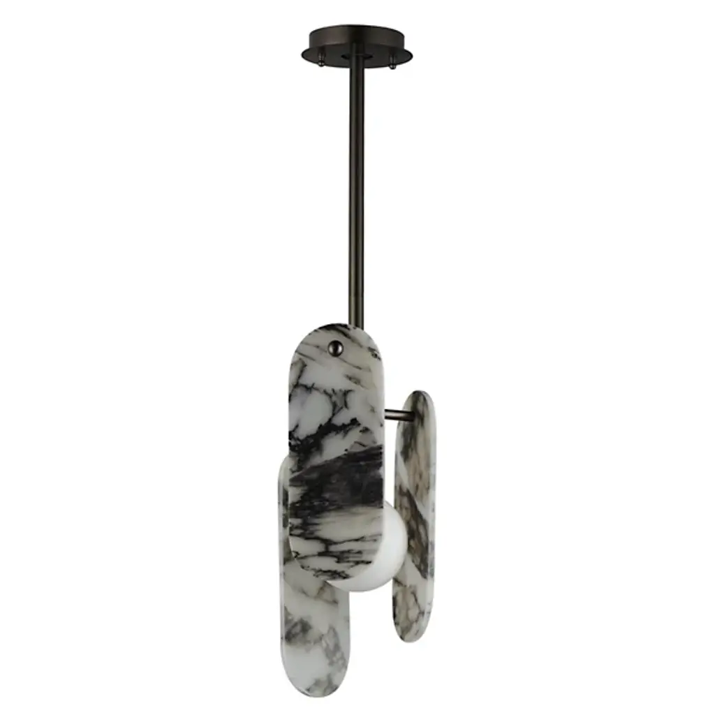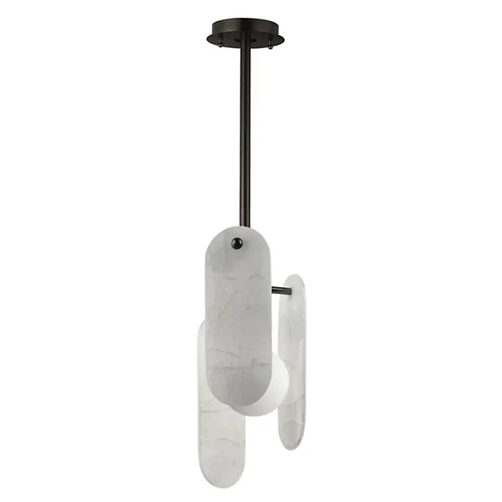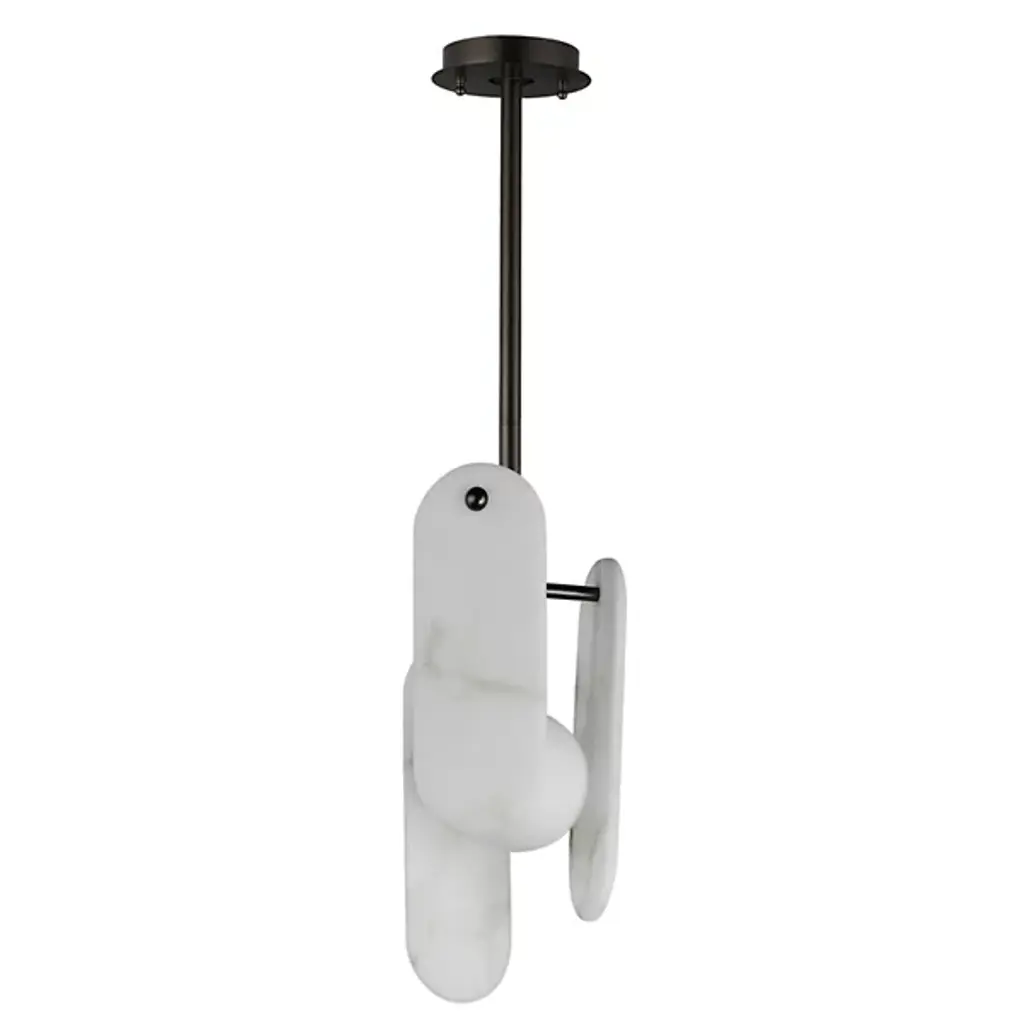 The modern Megalith LED Pendant from Studio M is an energy-efficient and stylish option for brightening a space, regardless of work or play. A sturdy iron stem that hangs from the circular canopy holds elliptical panels that seem to float around the center of a glass globe encased in white. The panels and the globe diffuse the integrated LED light in a beautiful cast of warm ambient illumination. It’s an elegant composition with a playful flair.