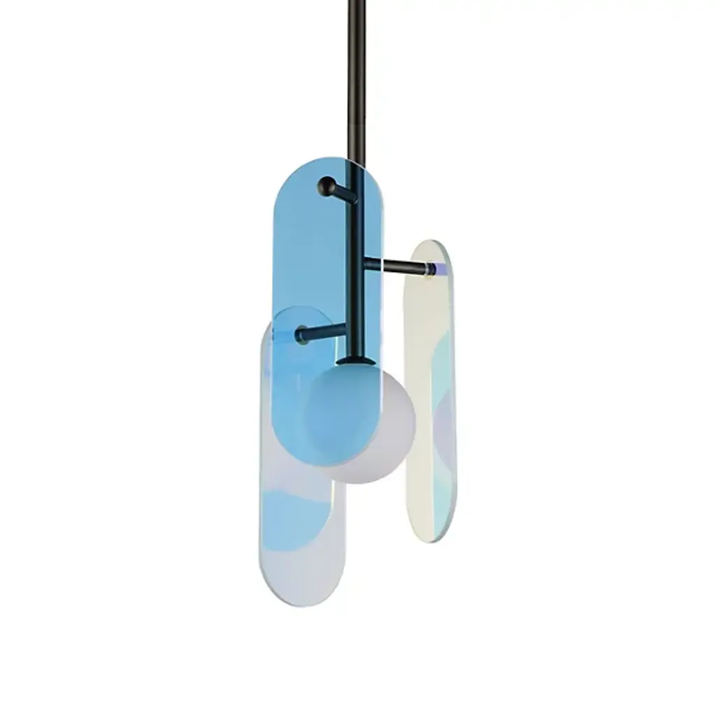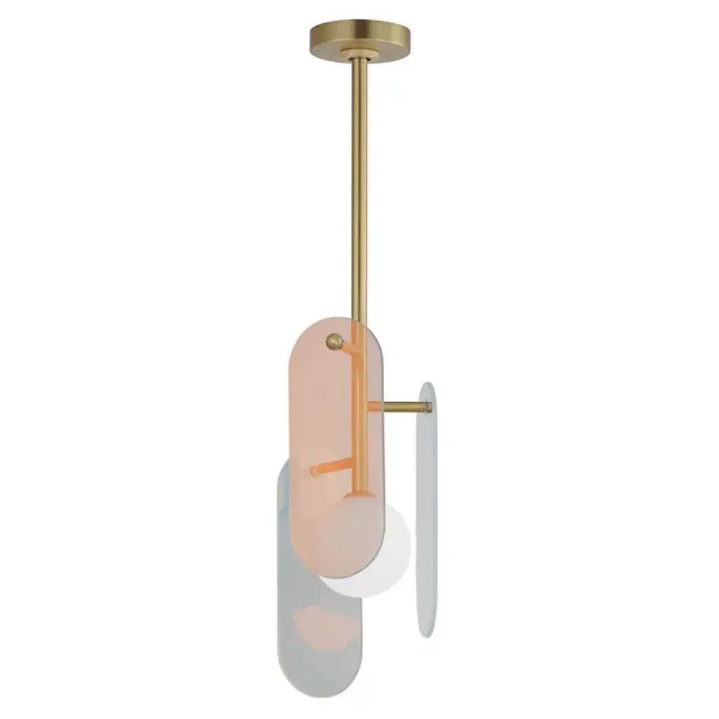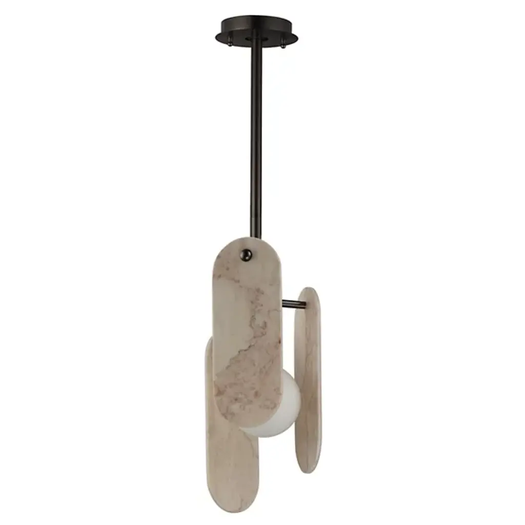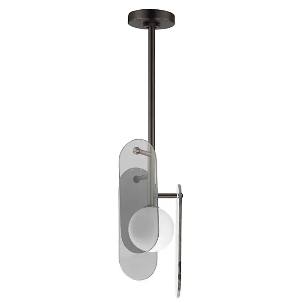 The modern Megalith LED Pendant from Studio M is an energy-efficient and stylish option for brightening a space, regardless of work or play. A sturdy iron stem that hangs from the circular canopy holds elliptical panels that seem to float around the center of a glass globe encased in white. The panels and the globe diffuse the integrated LED light in a beautiful cast of warm ambient illumination. It’s an elegant composition with a playful flair.