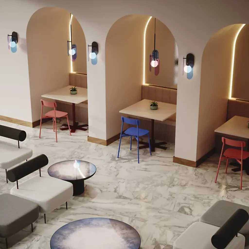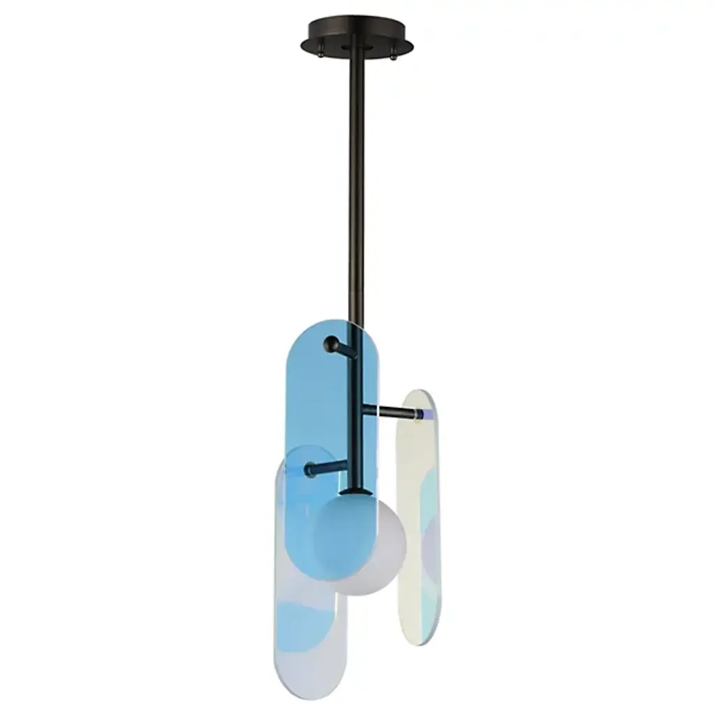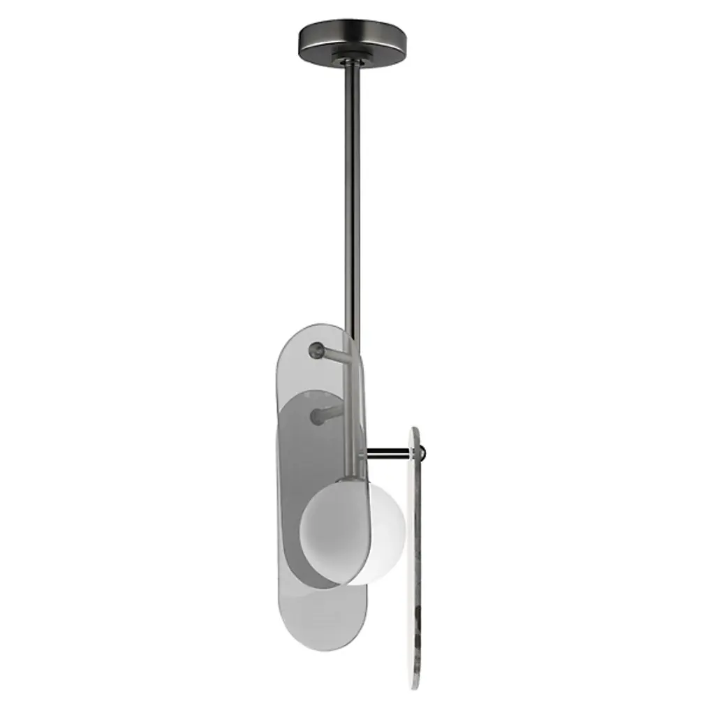 The modern Megalith LED Pendant from Studio M is an energy-efficient and stylish option for brightening a space, regardless of work or play. A sturdy iron stem that hangs from the circular canopy holds elliptical panels that seem to float around the center of a glass globe encased in white. The panels and the globe diffuse the integrated LED light in a beautiful cast of warm ambient illumination. It’s an elegant composition with a playful flair.