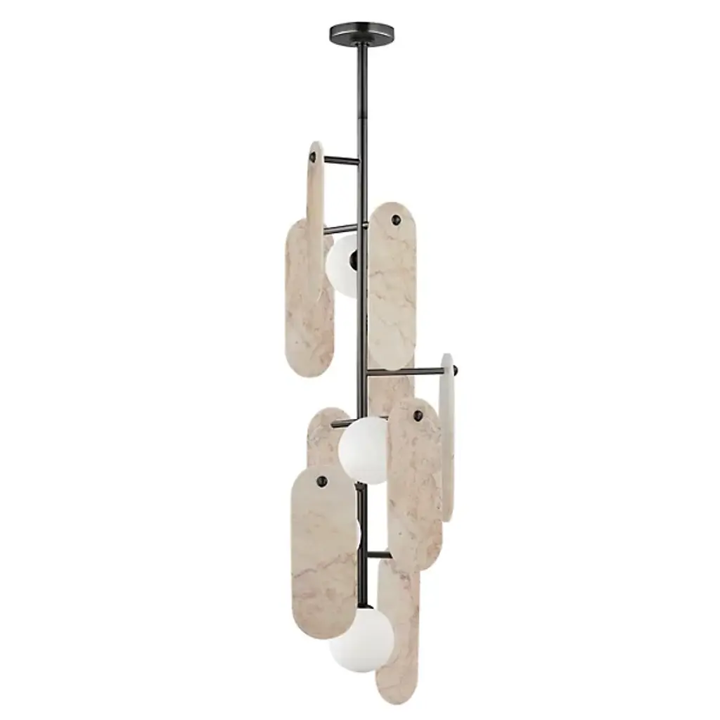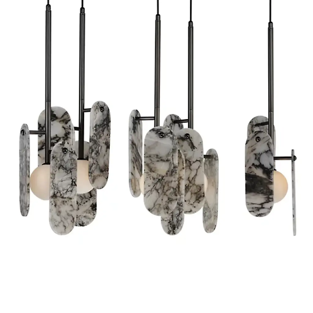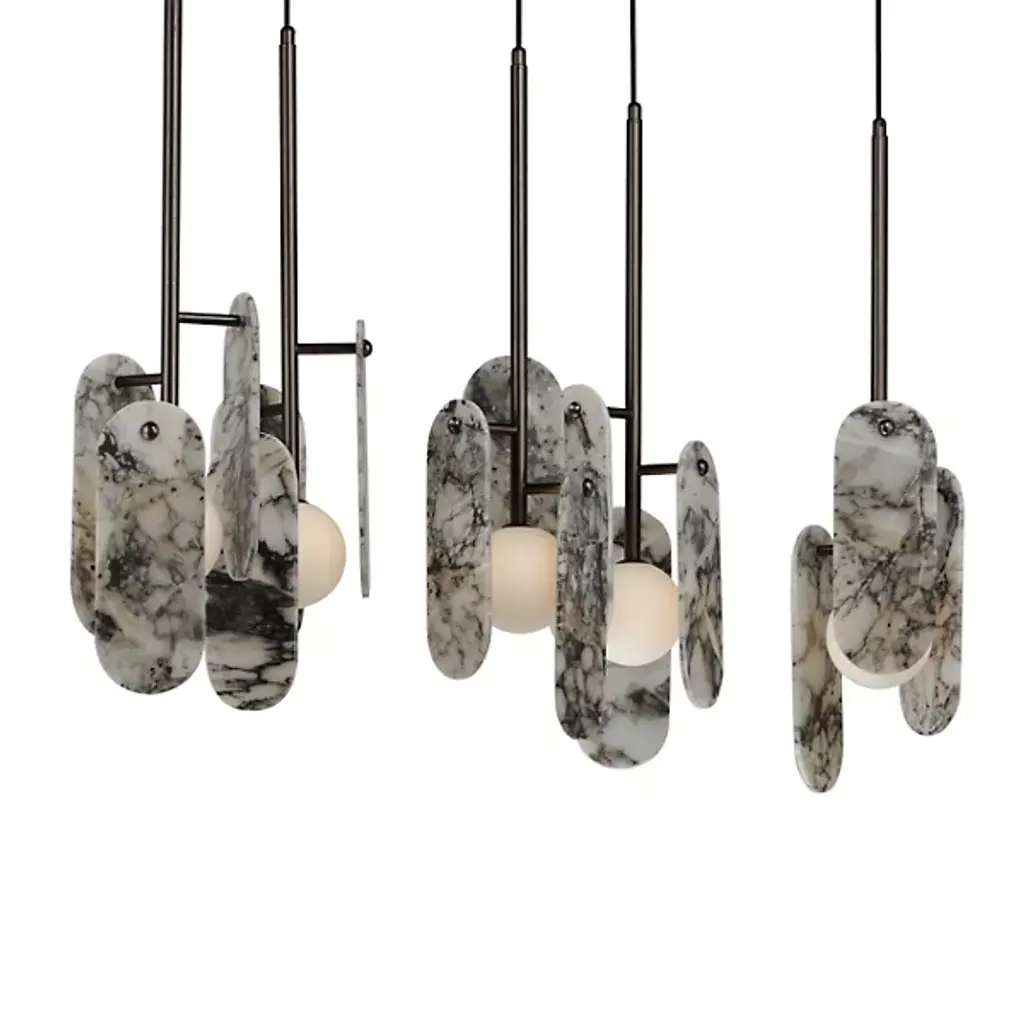 Designed as an ode to the timeless allure of stone, the Megalith Pendant by Studio M symbolizes enduring elegance. Suspended from a slender stem descending from a disc canopy, it cradles a collection of oval-shaped stonework panels, each elegantly backlit by white-cased glass globes at their center, creating a captivating display of illumination. With a range of colors boasting captivating veining and hues, this fixture exudes an air of luxury and sophistication, promising aesthetic allure and customizable flexibility to enhance any space with its elegant ambiance.