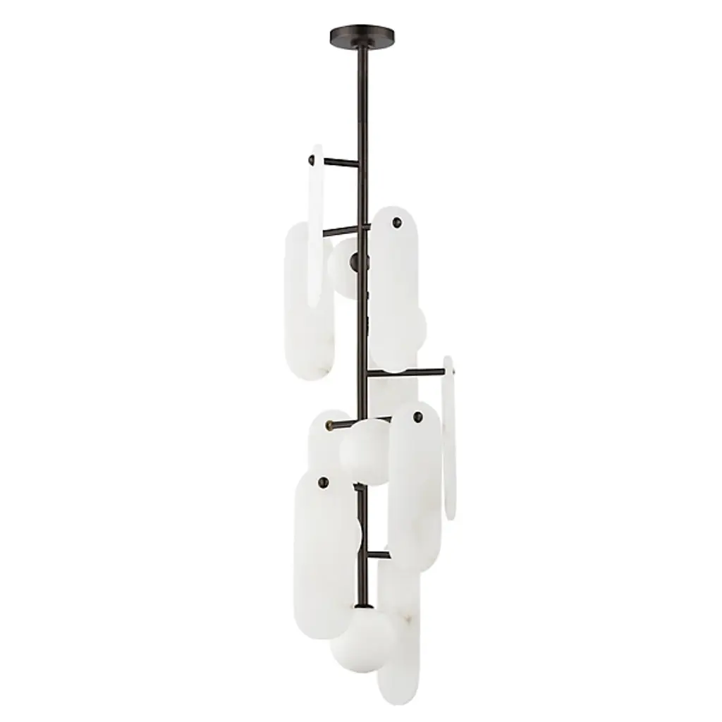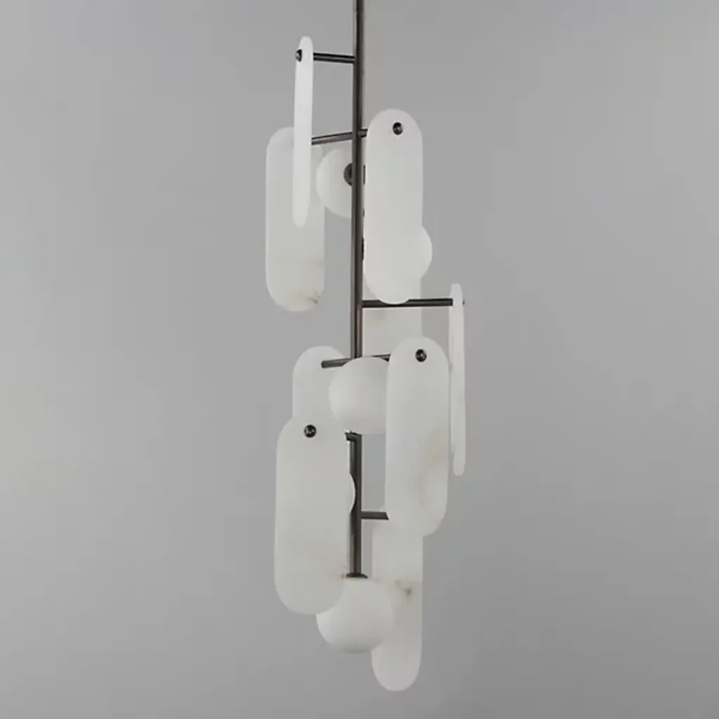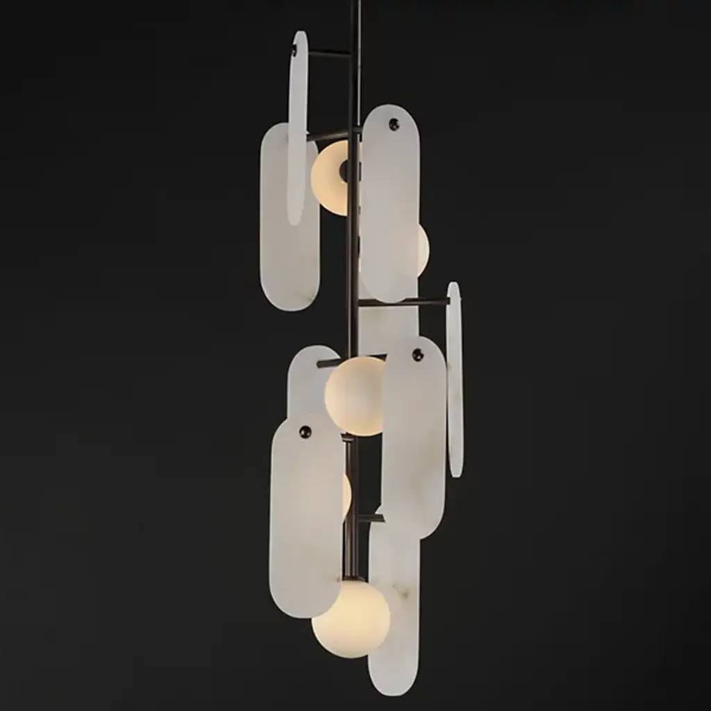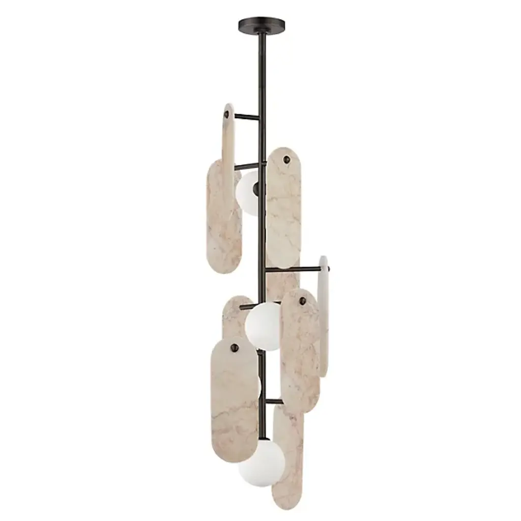 Designed as an ode to the timeless allure of stone, the Megalith Pendant by Studio M symbolizes enduring elegance. Suspended from a slender stem descending from a disc canopy, it cradles a collection of oval-shaped stonework panels, each elegantly backlit by white-cased glass globes at their center, creating a captivating display of illumination. With a range of colors boasting captivating veining and hues, this fixture exudes an air of luxury and sophistication, promising aesthetic allure and customizable flexibility to enhance any space with its elegant ambiance.