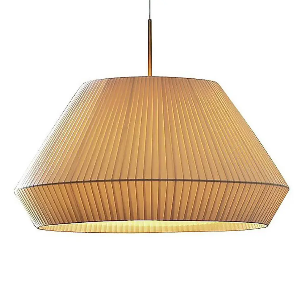 Pendant lamp providing diffused light through a translucent shade of hand wrapped polyester blend ribbon. Height can be easily adjusted via tensor wires. The electrical connection is transparent, and the included diffuser is a frosted injection-molded polycarbonate lens. Available in larger formats. Features: