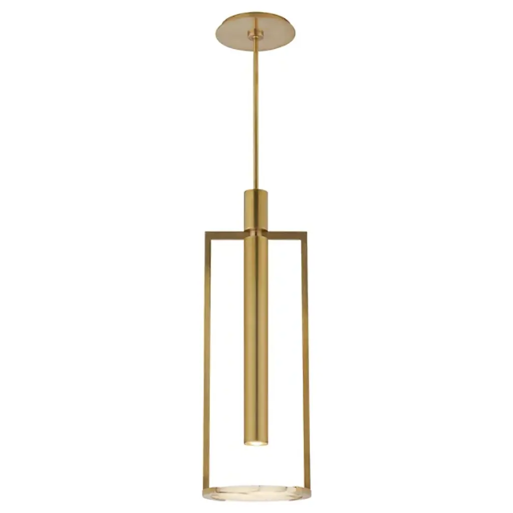 Designed by Kelly Wearstler and presented by Visual Comfort Signature, formerly known as Visual Comfort,, the Melange Floating Disc LED Pendant is a transitionally styled piece with mid-century modern influences throughout. Integrated LED provides low energy consumption and a longer lifespan than the traditional lighting unit. Including two 16in. stems and composed of alabaster and brass, this sloped ceiling adaptable furnishing is suitable for practically any interior, including outdoor locales protected from the elements.