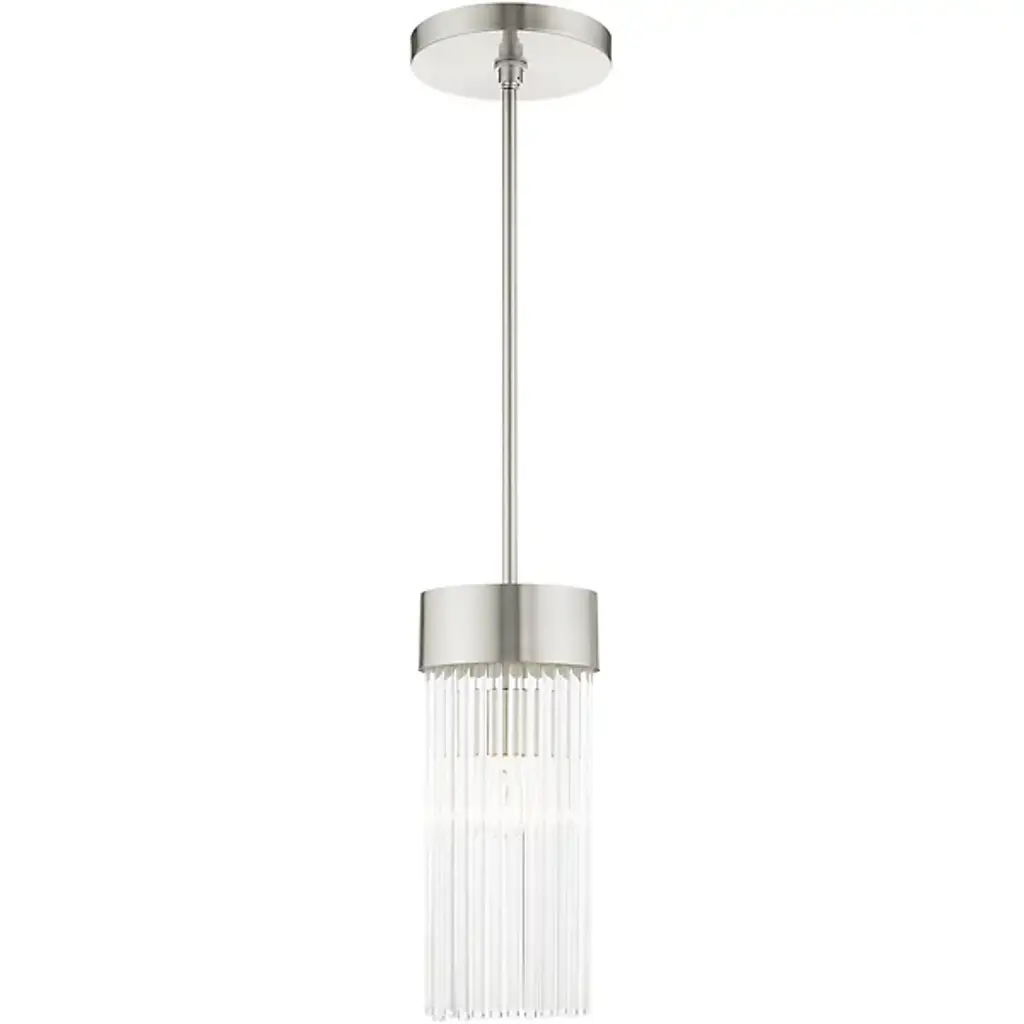 The Melanie Mini Pendant by Alder & Ore may be small, but it delivers a sophisticated punch that adds a bright, shimmering visual to rooms. The pendant captivates, whether by itself or arranged as part of a series out in space. This design suspends via a slim down rod for versatile placement. The piece shields the eye from the brilliant light source with a curtain of clear crystal rods suspended from a smooth, metal band. Reflecting, refracting, and filtering light, this collection of crystals playfully interacts with its surroundings, adding a touch of charm and elegance to its environment.