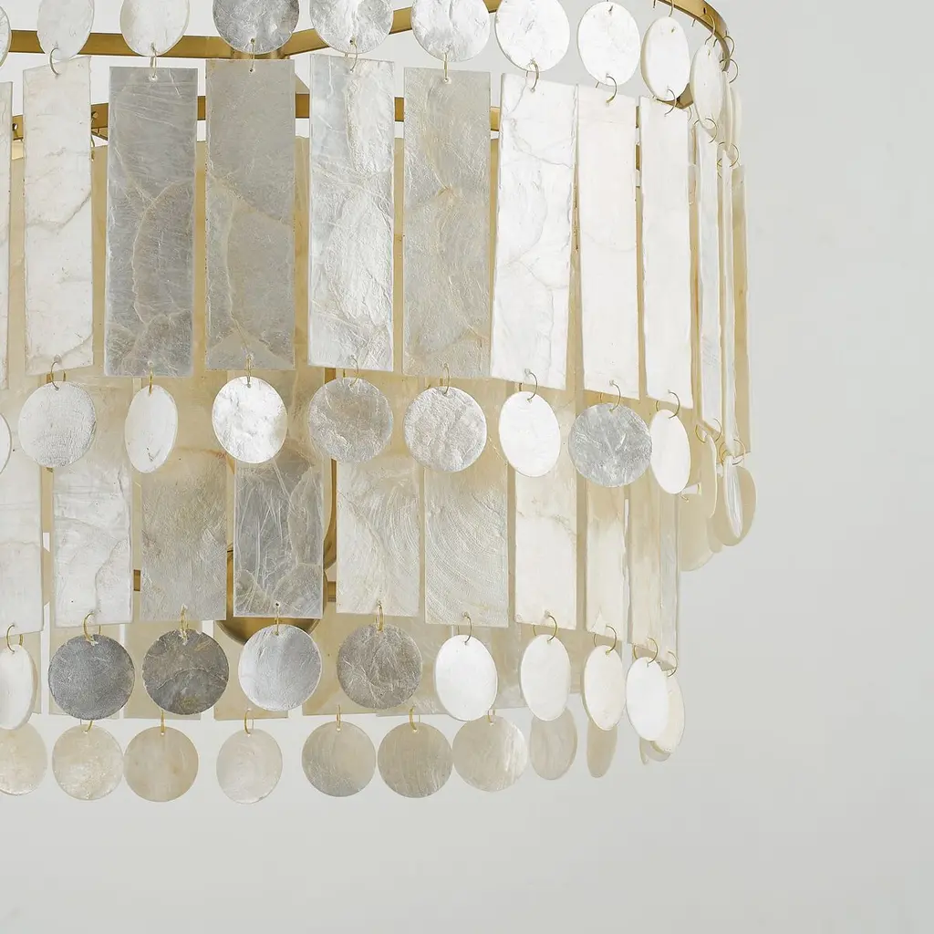 Luminous even when it's turned off, this chandelier features circles and rectangles of capiz shell tangling from a two-tier brass frame. Because the chandelier is damp rated, you can enjoy its glamour in a bathroom as well as in a foyer, over a dining table, or just about anywhere else in your home.