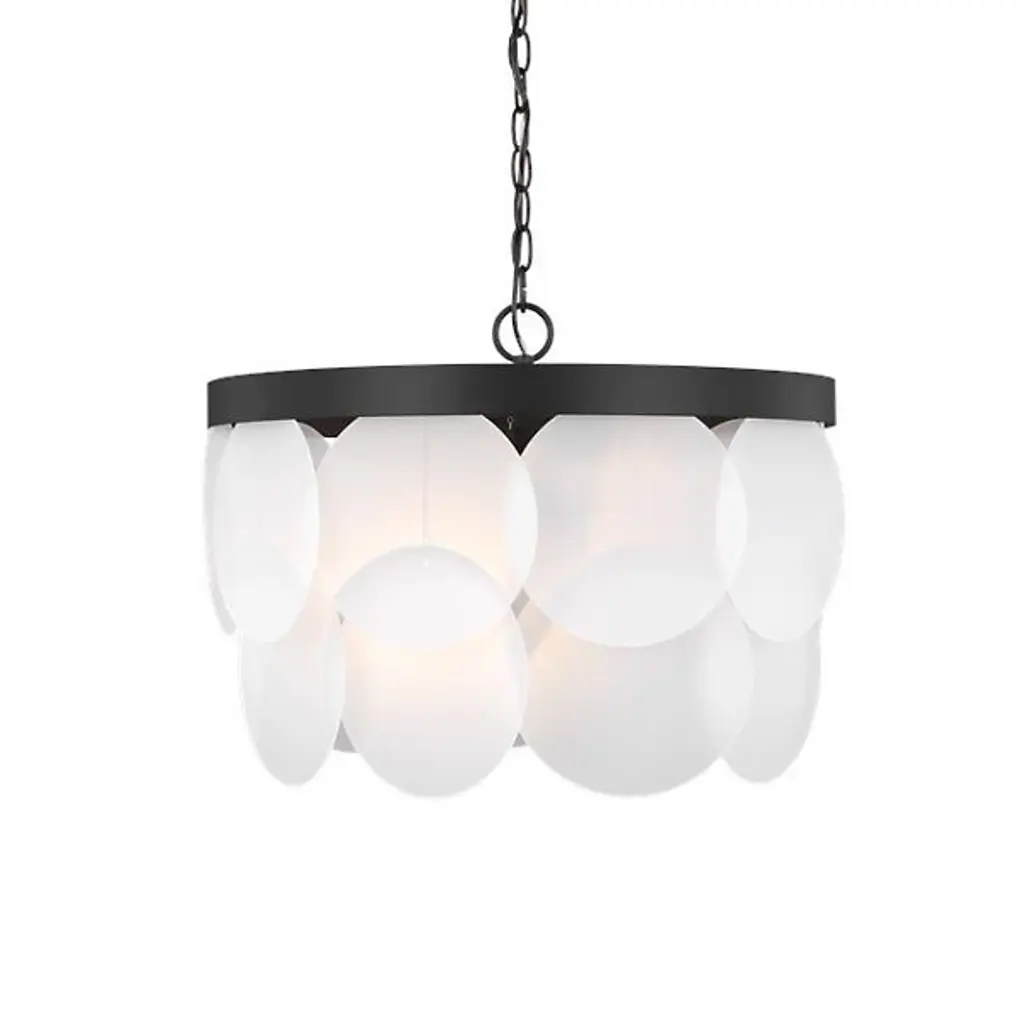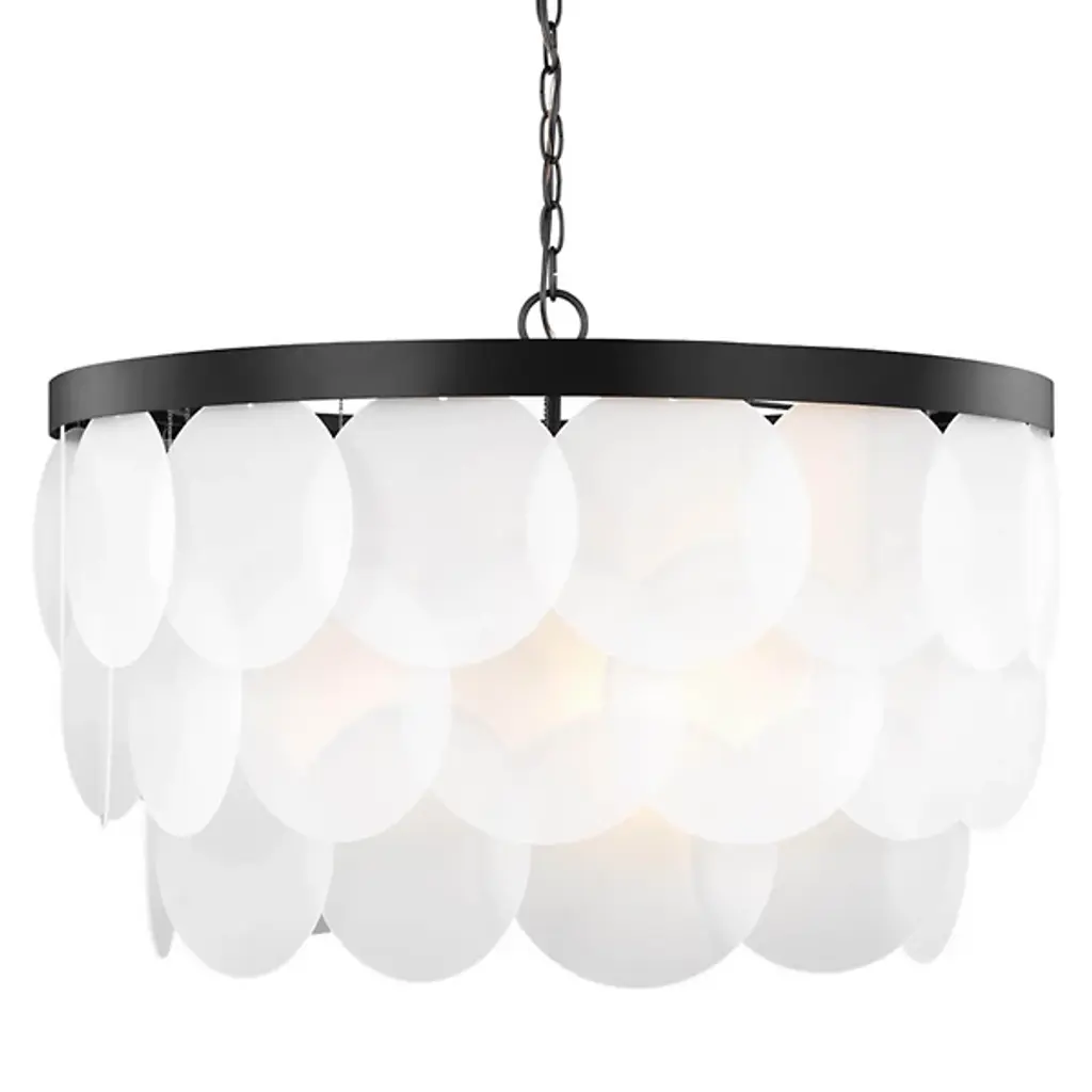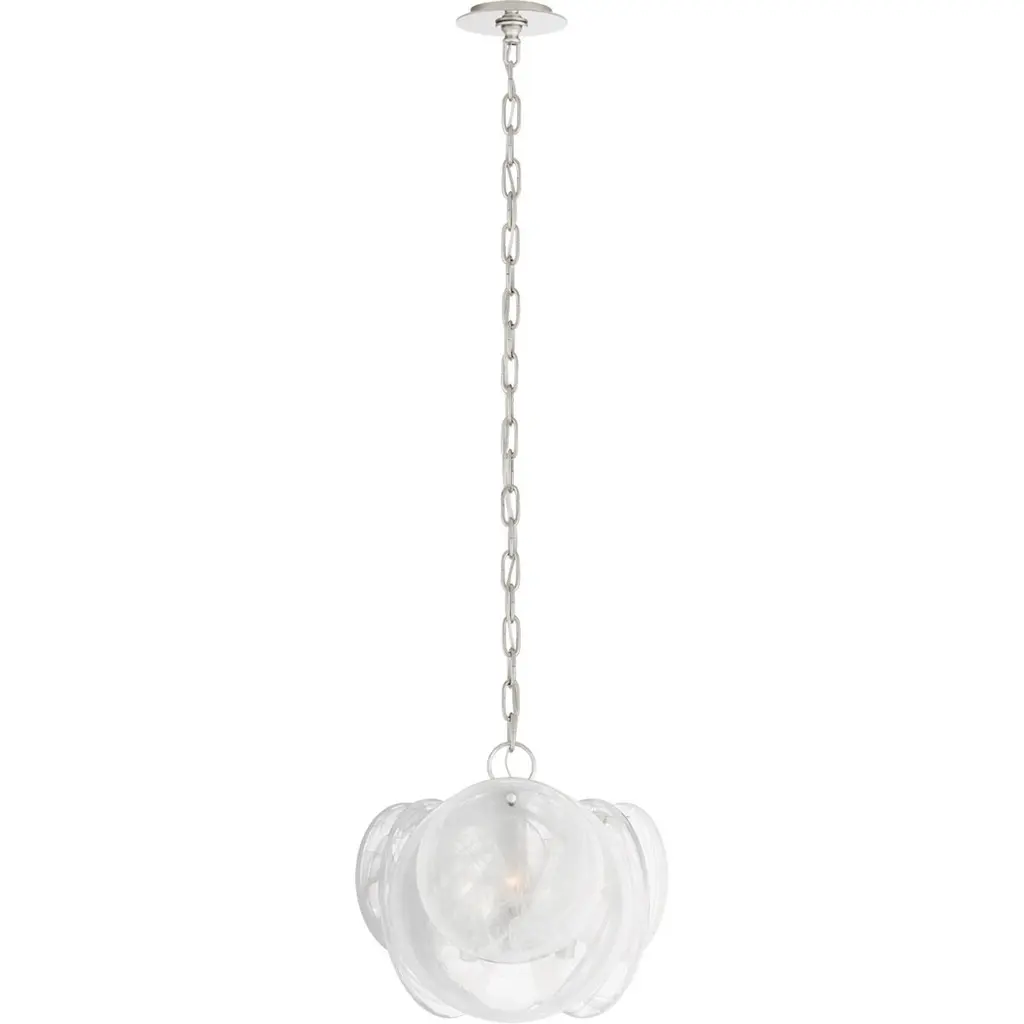 Bring a clean and calming quality to the room with the Mellita Pendant by Visual Comfort Studio, formerly known as Sea Gull Lighting, This charming pendant begins at a circular canopy and adjustable chain. A steel ring supports a series of bulbs that cast a radiant glow through slender white satin etched glass discs. Each disc hangs freely in place, lending a dynamic charm that evokes movement and whimsy. Elegant and adaptable, this piece brings balance to a wide range of interior décor themes.