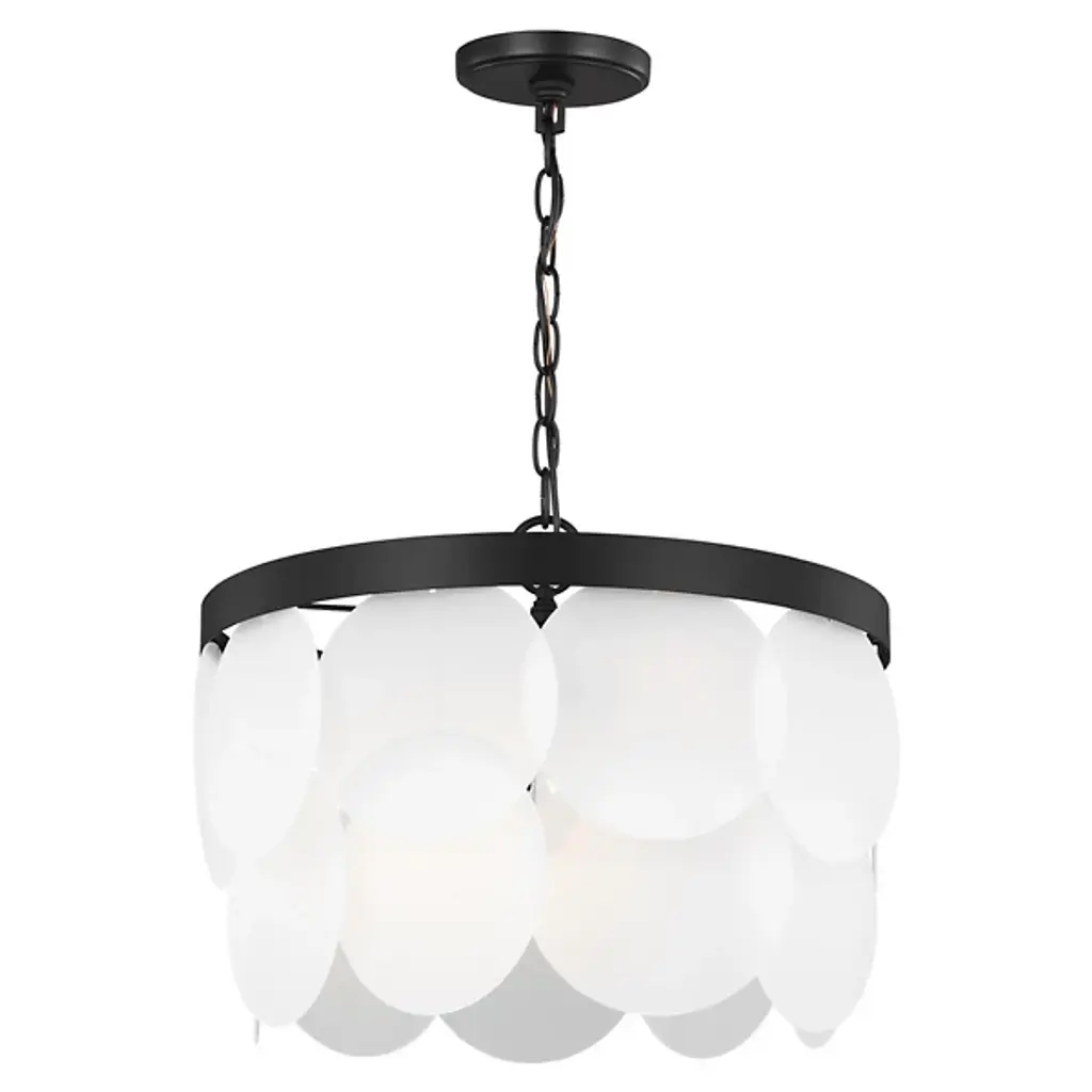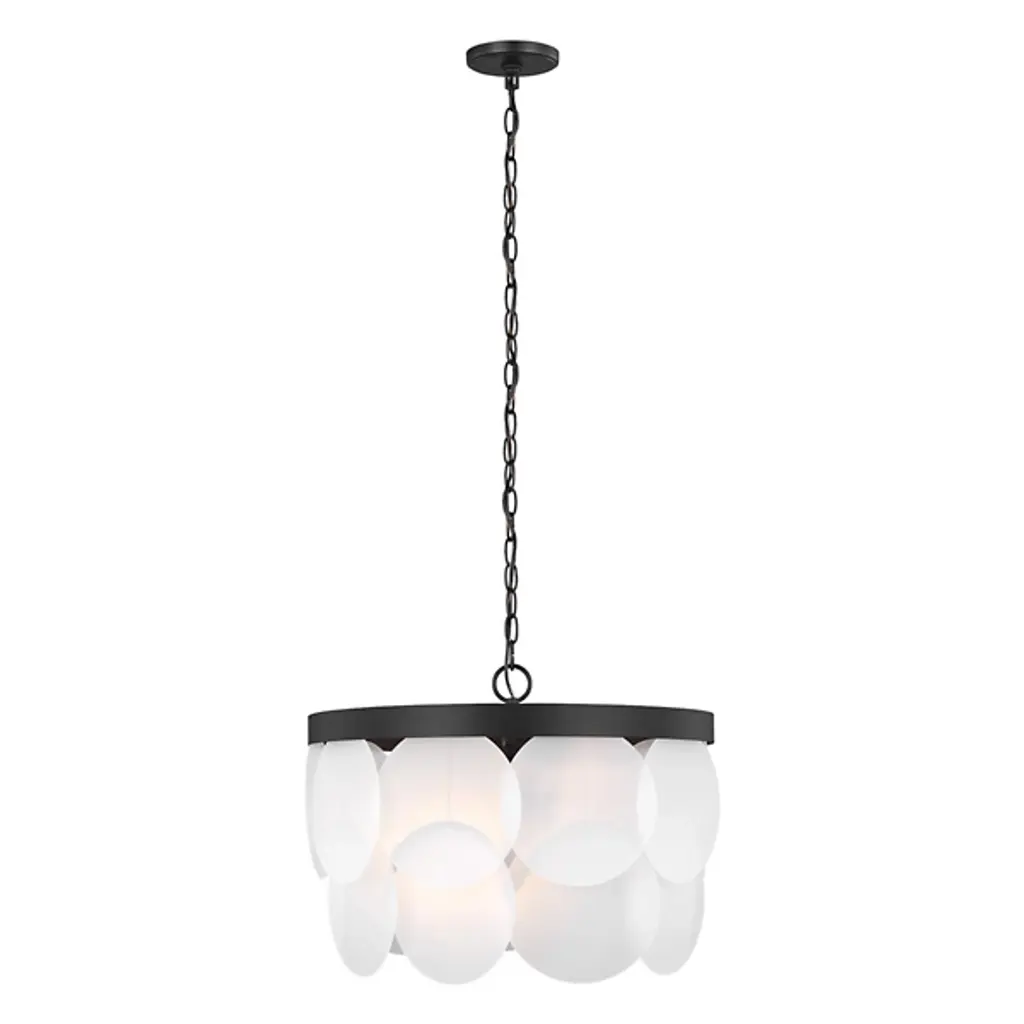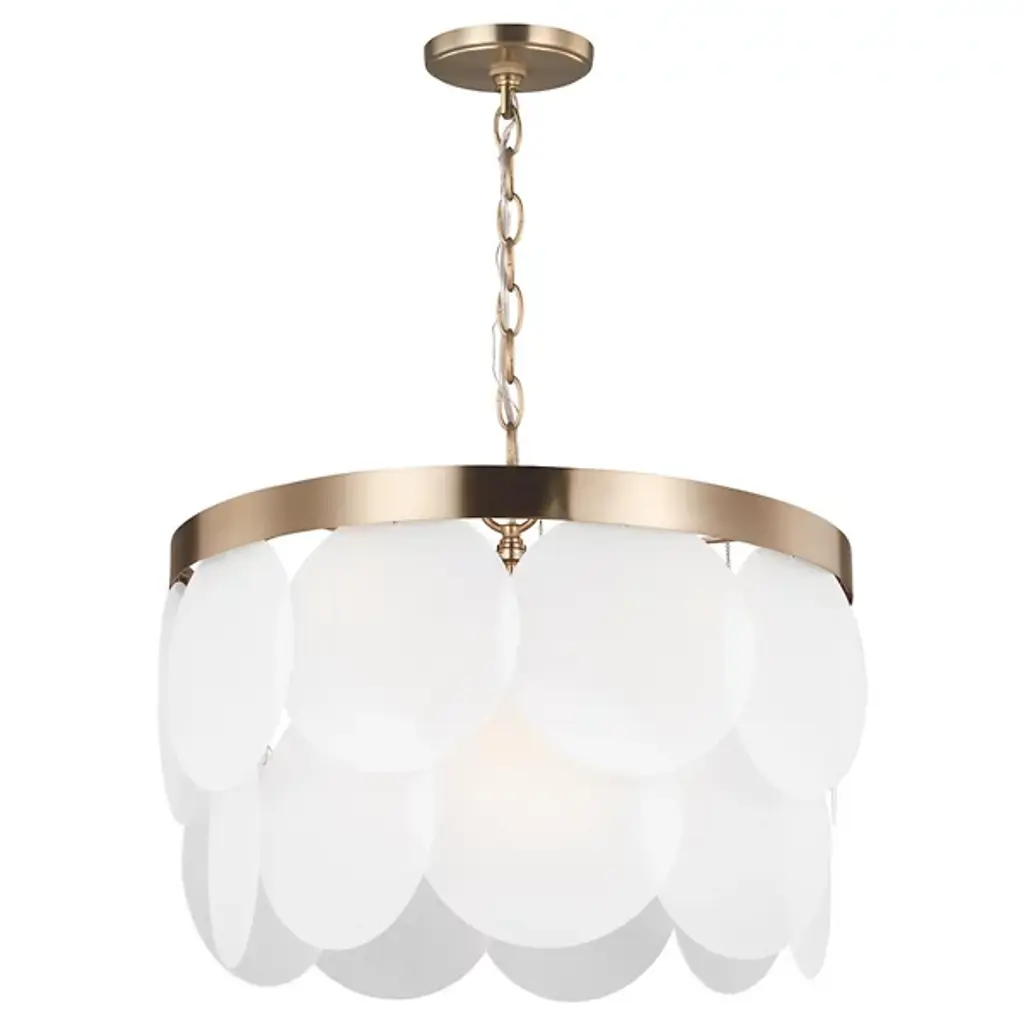 Bring a clean and calming quality to the room with the Mellita Pendant by Visual Comfort Studio, formerly known as Sea Gull Lighting, This charming pendant begins at a circular canopy and adjustable chain. A steel ring supports a series of bulbs that cast a radiant glow through slender white satin etched glass discs. Each disc hangs freely in place, lending a dynamic charm that evokes movement and whimsy. Elegant and adaptable, this piece brings balance to a wide range of interior décor themes.