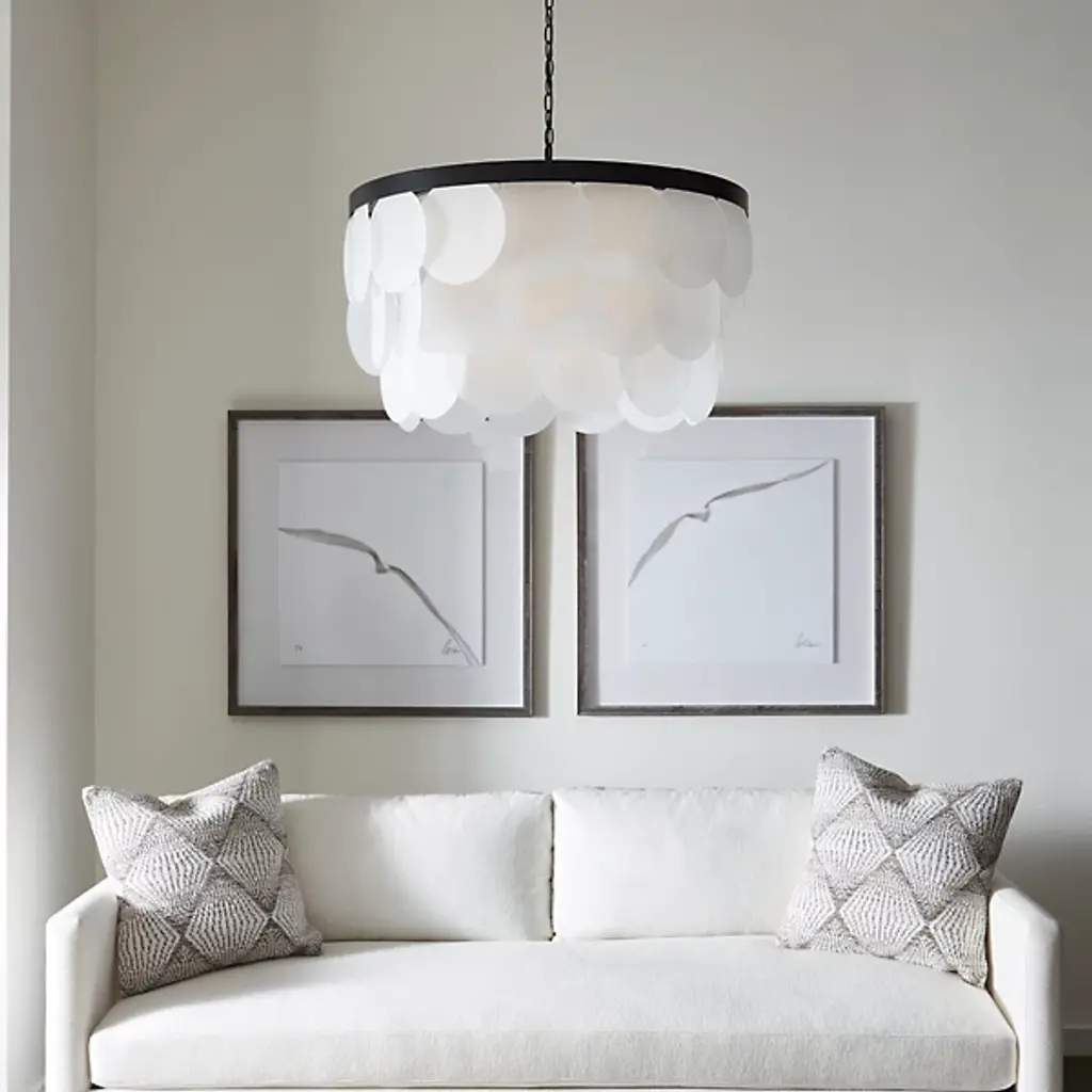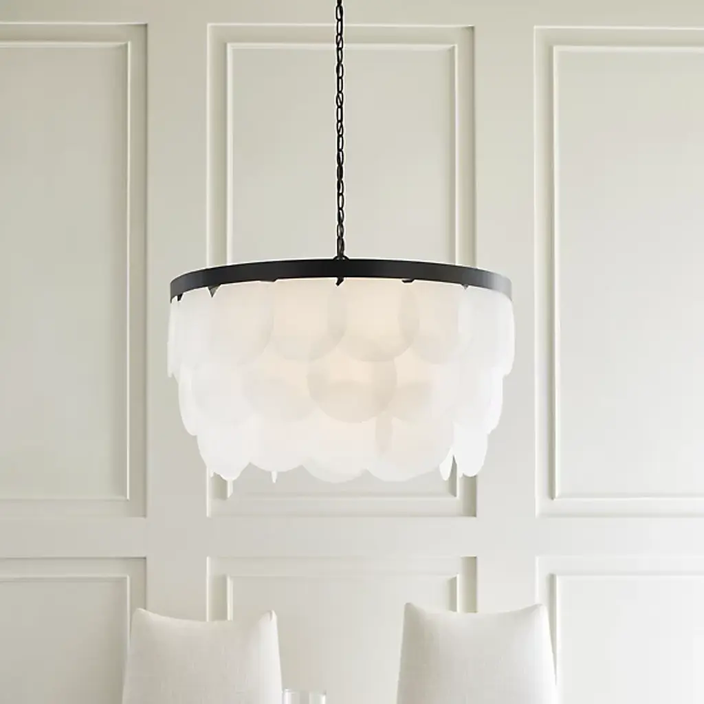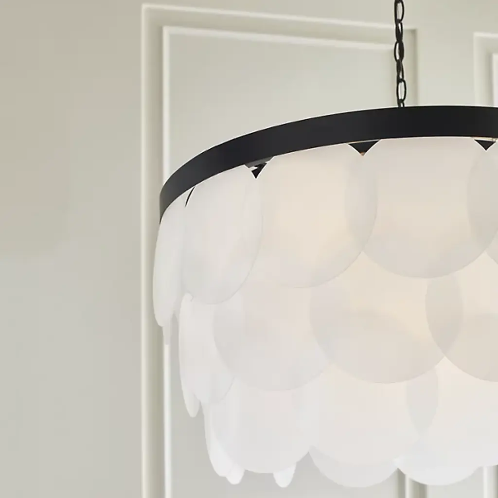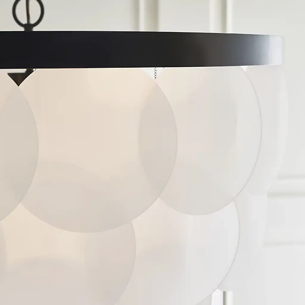 Bring a clean and calming quality to the room with the Mellita Pendant by Visual Comfort Studio, formerly known as Sea Gull Lighting, This charming pendant begins at a circular canopy and adjustable chain. A steel ring supports a series of bulbs that cast a radiant glow through slender white satin etched glass discs. Each disc hangs freely in place, lending a dynamic charm that evokes movement and whimsy. Elegant and adaptable, this piece brings balance to a wide range of interior décor themes.