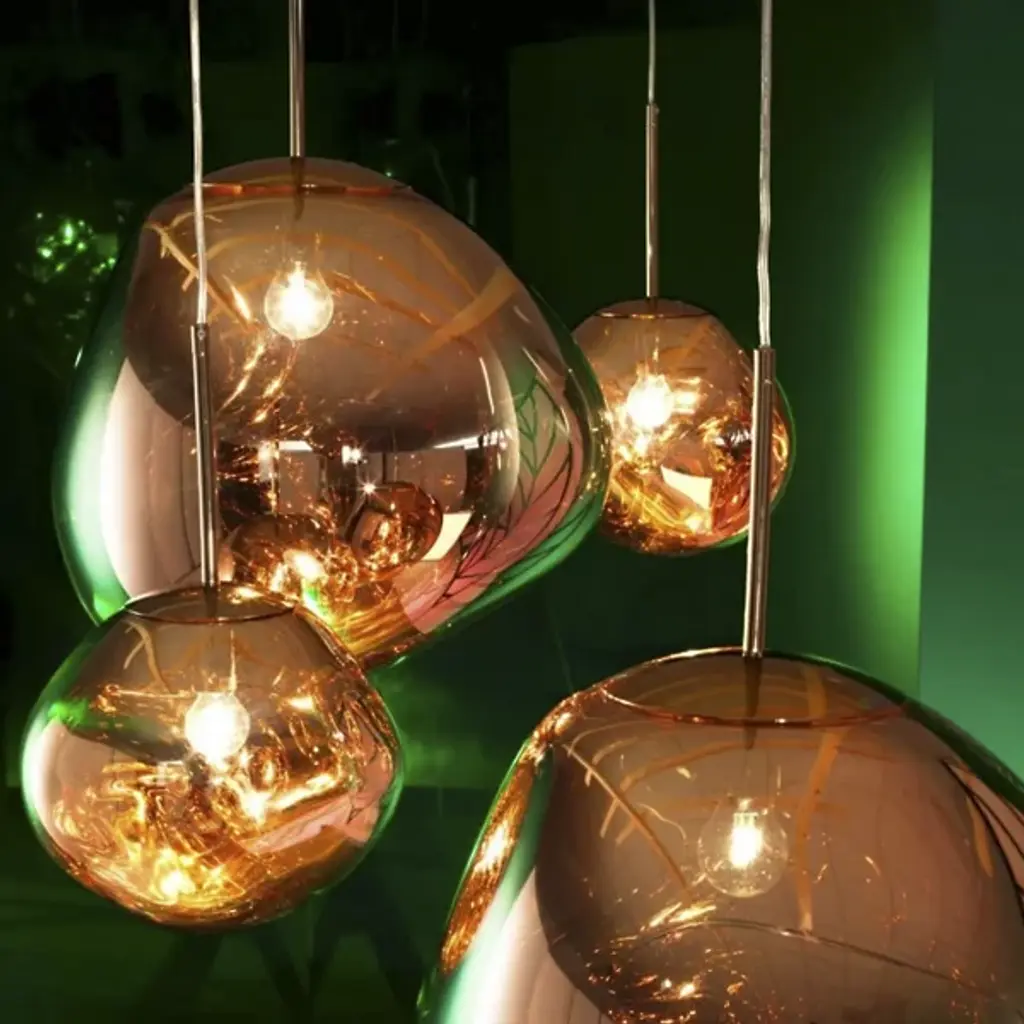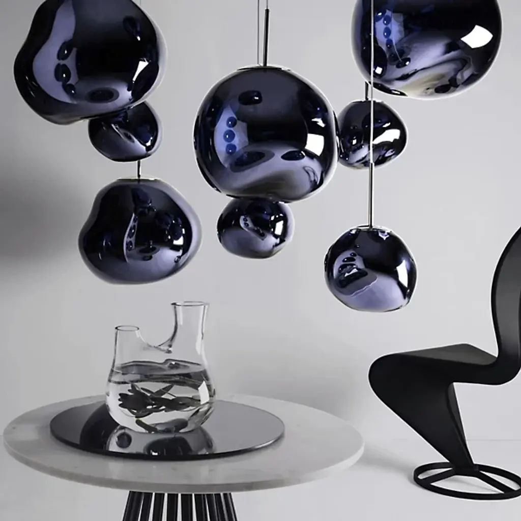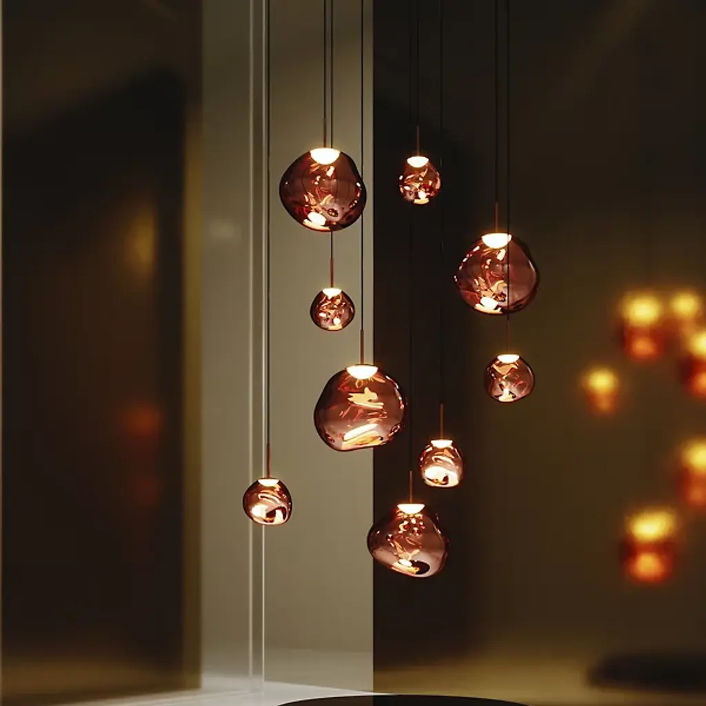 The Melt Large Round LED Multi-Light Pendant by Tom Dixon groups together an assortment of Melt pendants in varying sizes and hanging at different lengths. The level of sophistication it takes to create this metallic-finished fixture is shown in the little details; in the swirls of the Polycarbonate shades all the way to the semi-transparency visible when the lights are turned on.