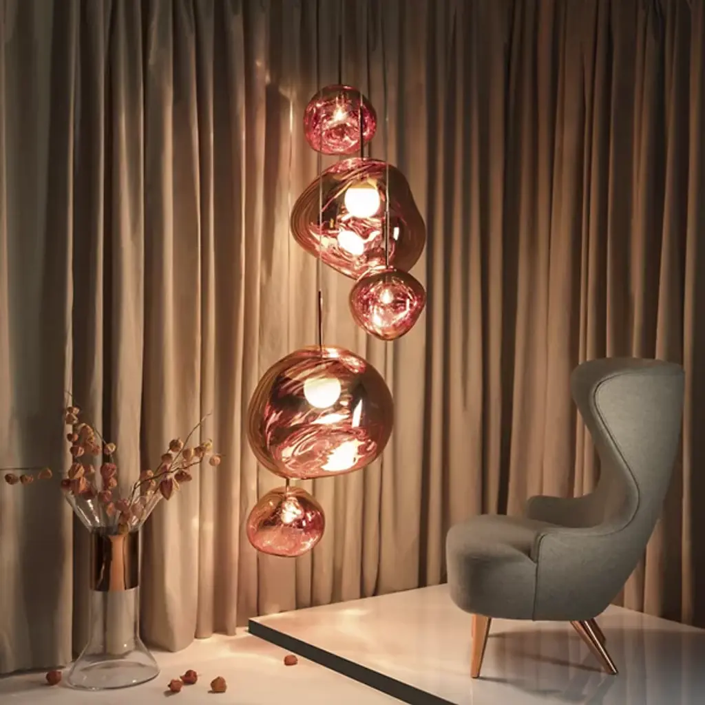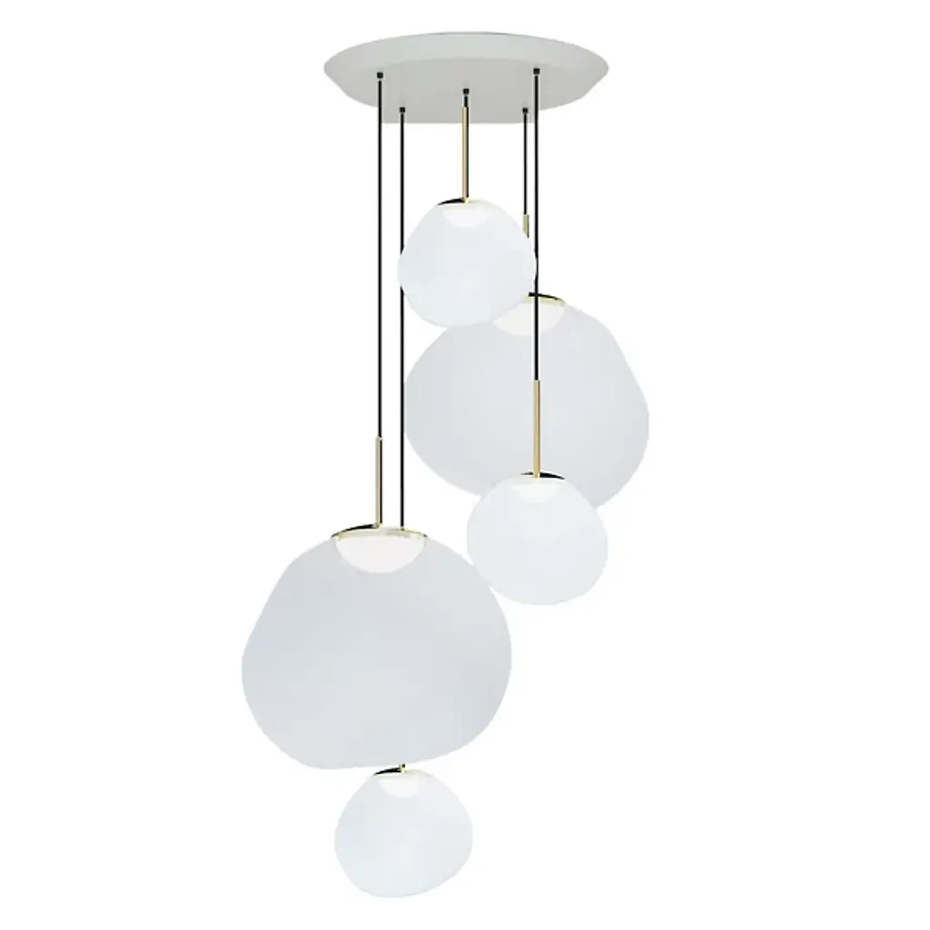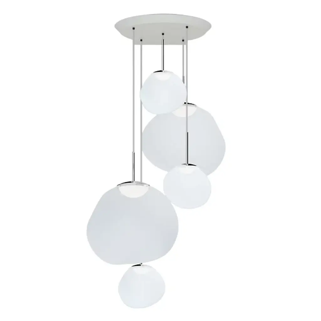 The Melt Large Round LED Multi-Light Pendant by Tom Dixon groups together an assortment of Melt pendants in varying sizes and hanging at different lengths. The level of sophistication it takes to create this metallic-finished fixture is shown in the little details; in the swirls of the Polycarbonate shades all the way to the semi-transparency visible when the lights are turned on.
